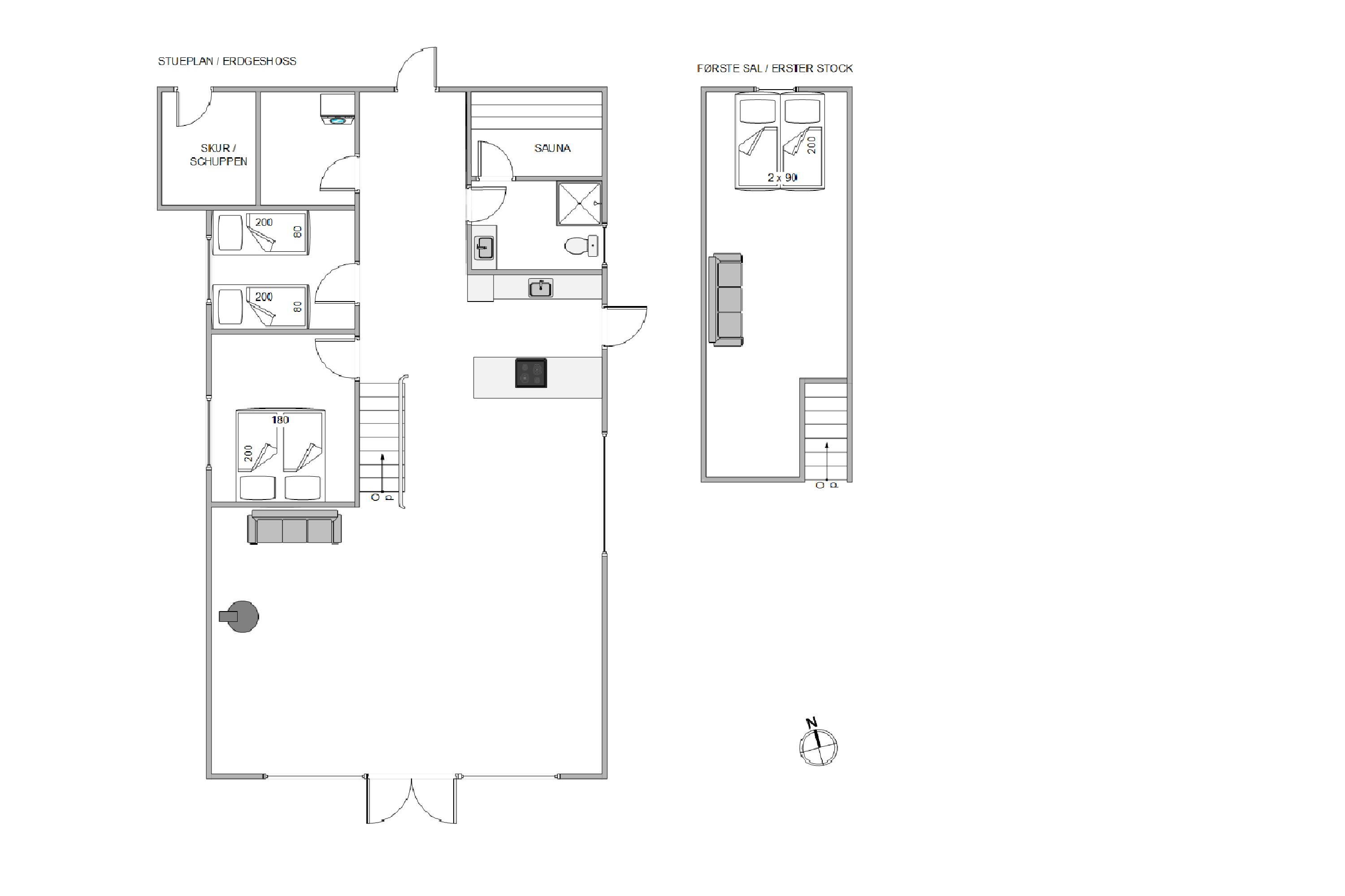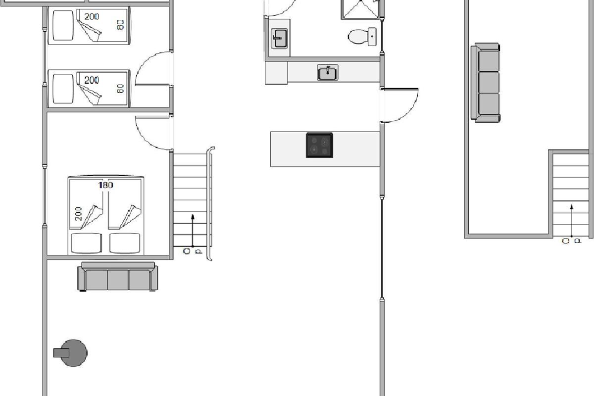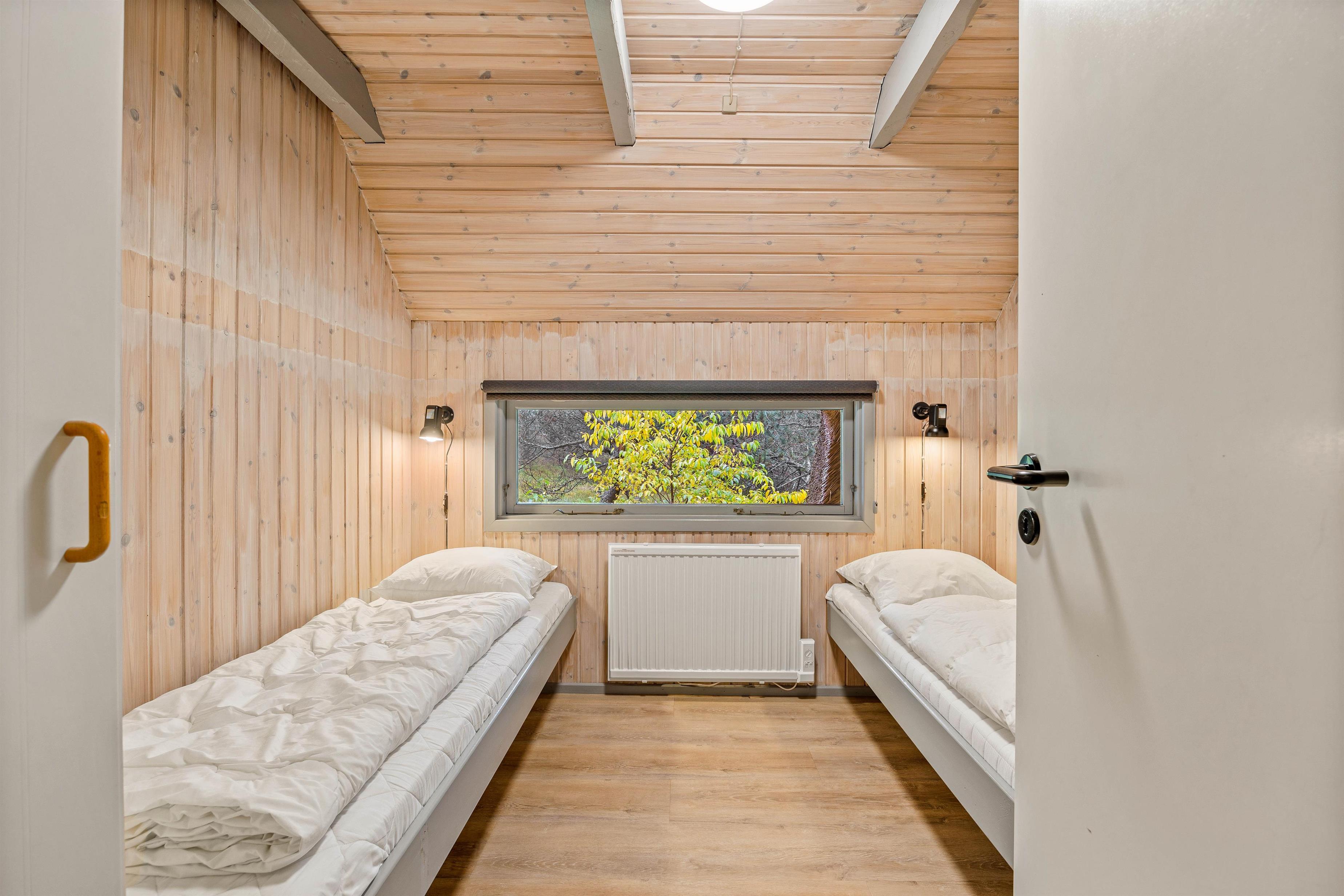 The holiday home features an open-plan living area with integrated kitchen. The well-equipped kitchen includes a dishwasher. From here, stairs lead to the first floor, which offers two sleeping areas and a children's retreat space perfect for quiet moments. An energy-efficient heat pump ensures comfortable temperatures throughout the house, while the wood-burning stove creates a cosy atmosphere during evening hours. The ground floor comprises two bedrooms with double beds and a bathroom with a lovely sauna.