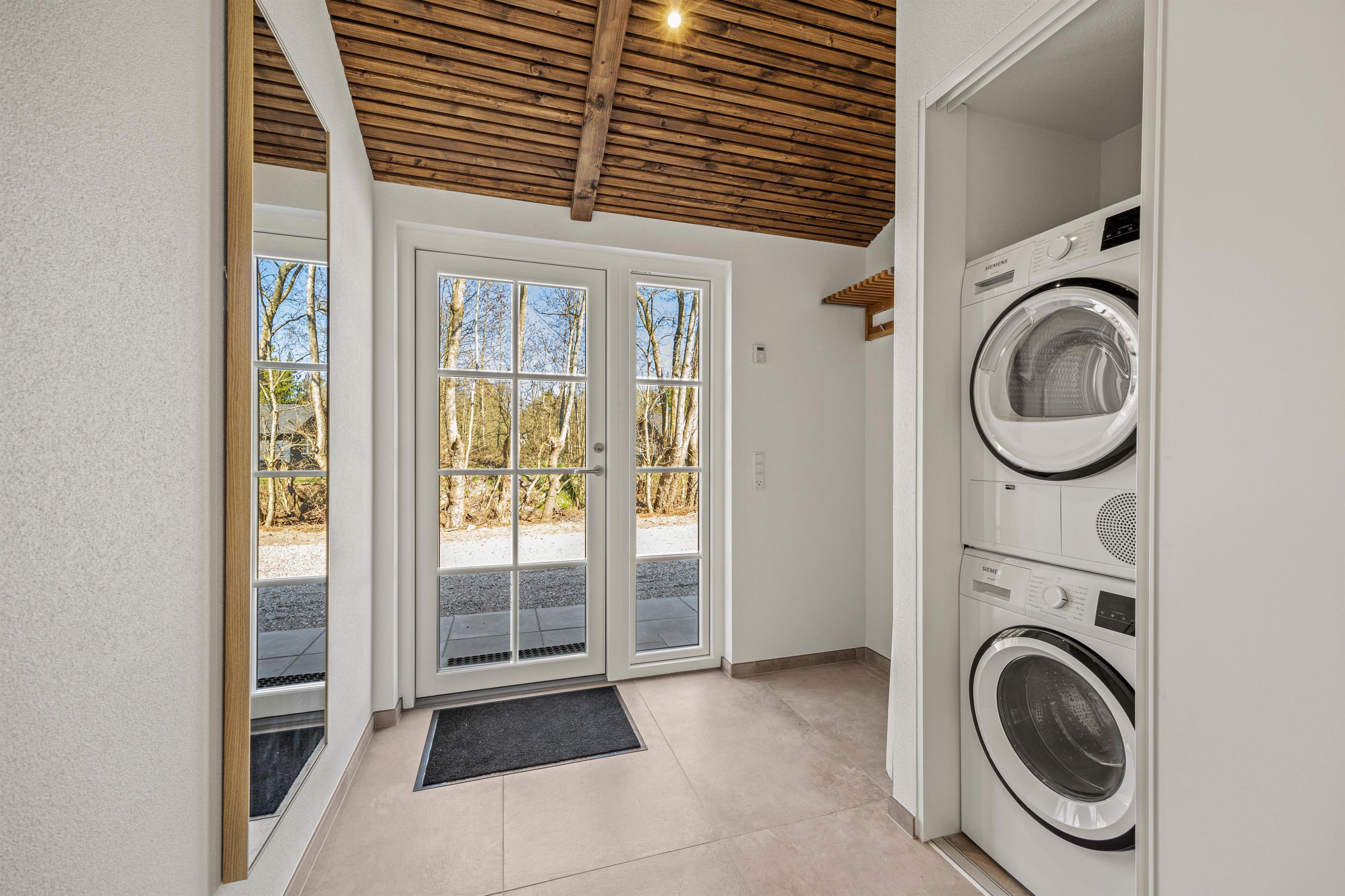 The cosy wood-burning stove in the living room invites you to spend relaxing evenings enjoying its warmth. Both bathrooms feature underfloor heating for added comfort. Practical amenities such as a washing machine and tumble dryer are also available to ensure a carefree stay.