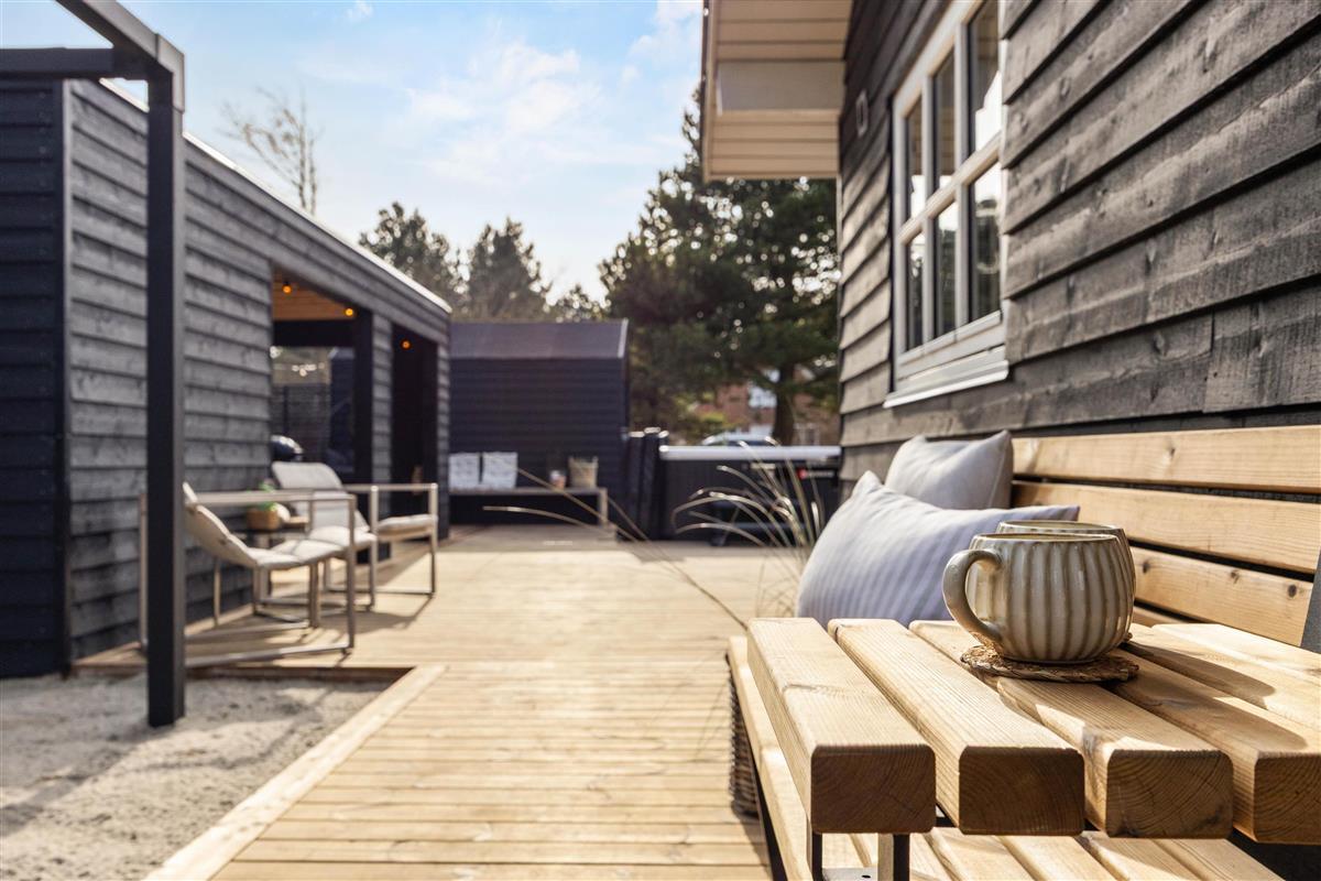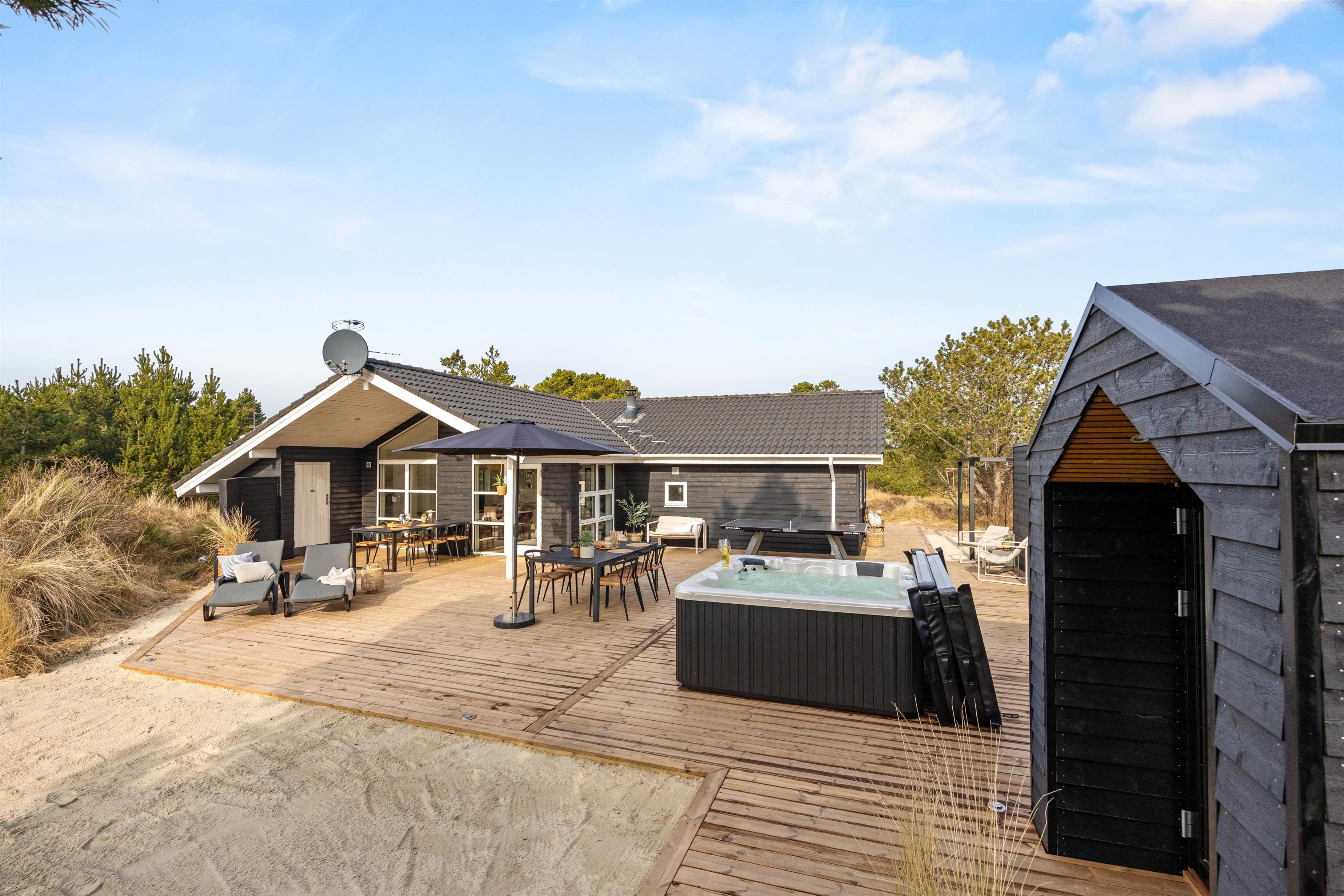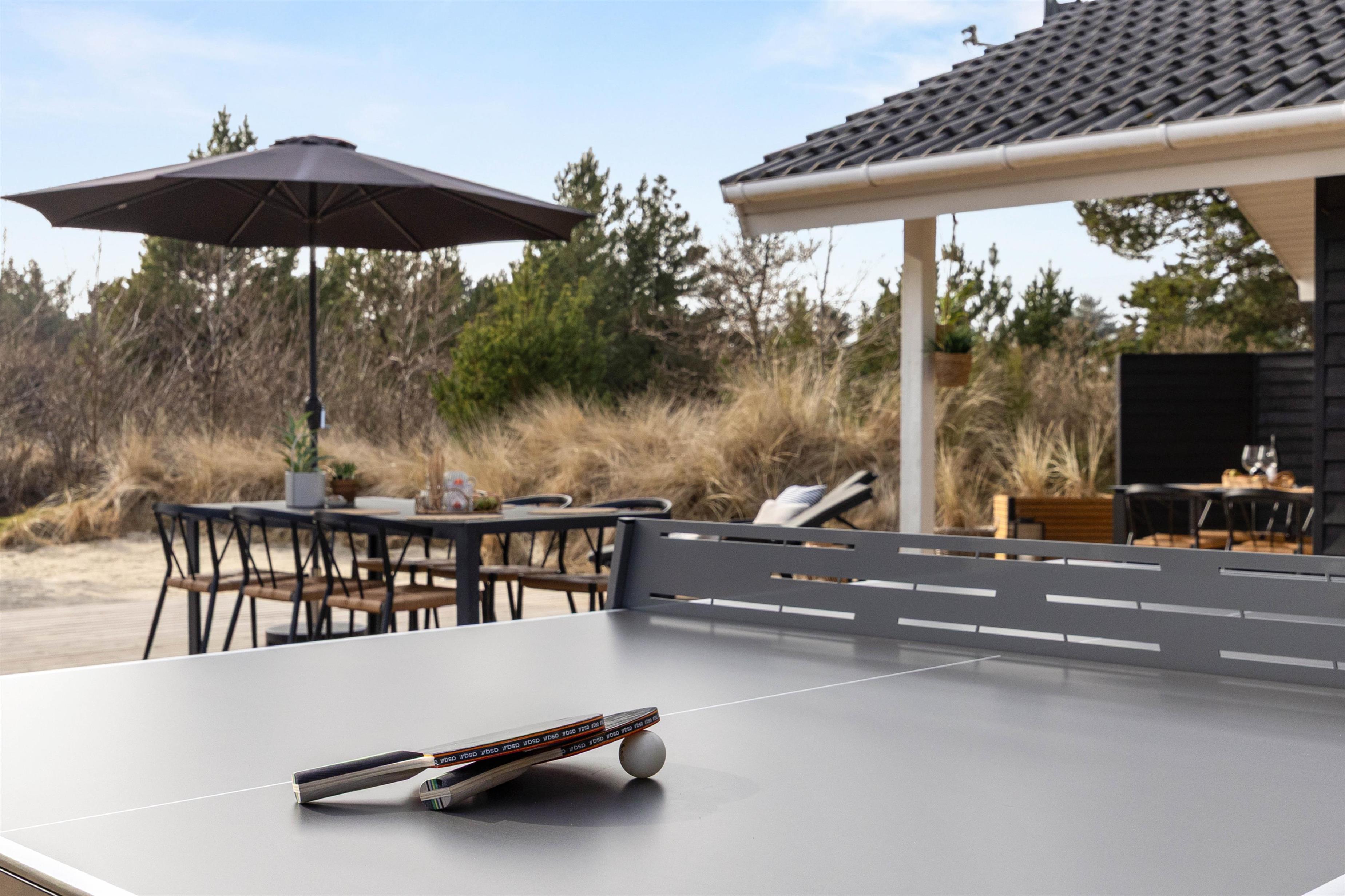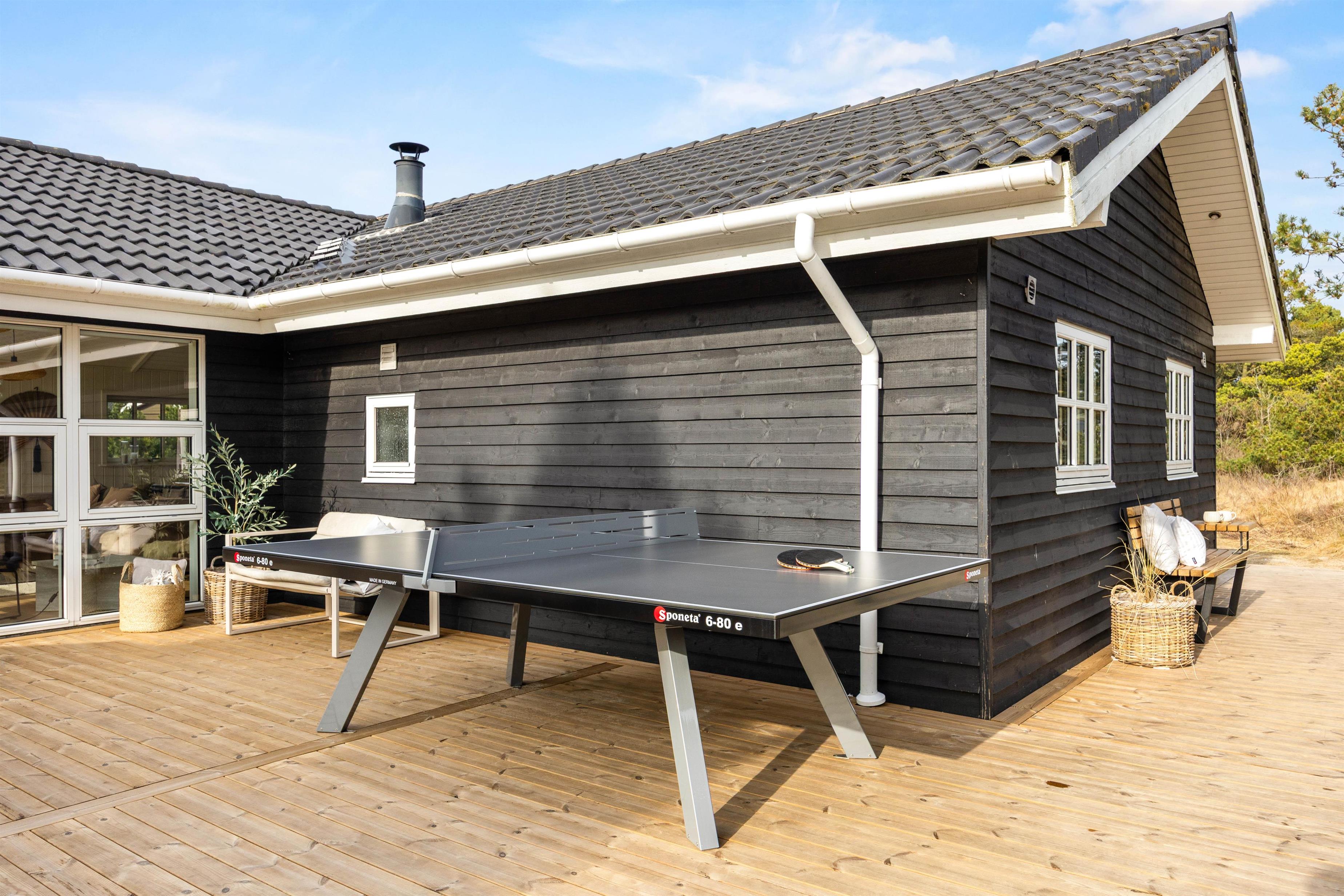The outdoor area includes an outdoor spa, an outdoor sauna and outdoor table tennis for you to enjoy on the 170 m2 terrace, and here the children can also let off steam in the playground with its sandpit and swing, perhaps after a nice walk together on the beautiful beaches of Blåvand.