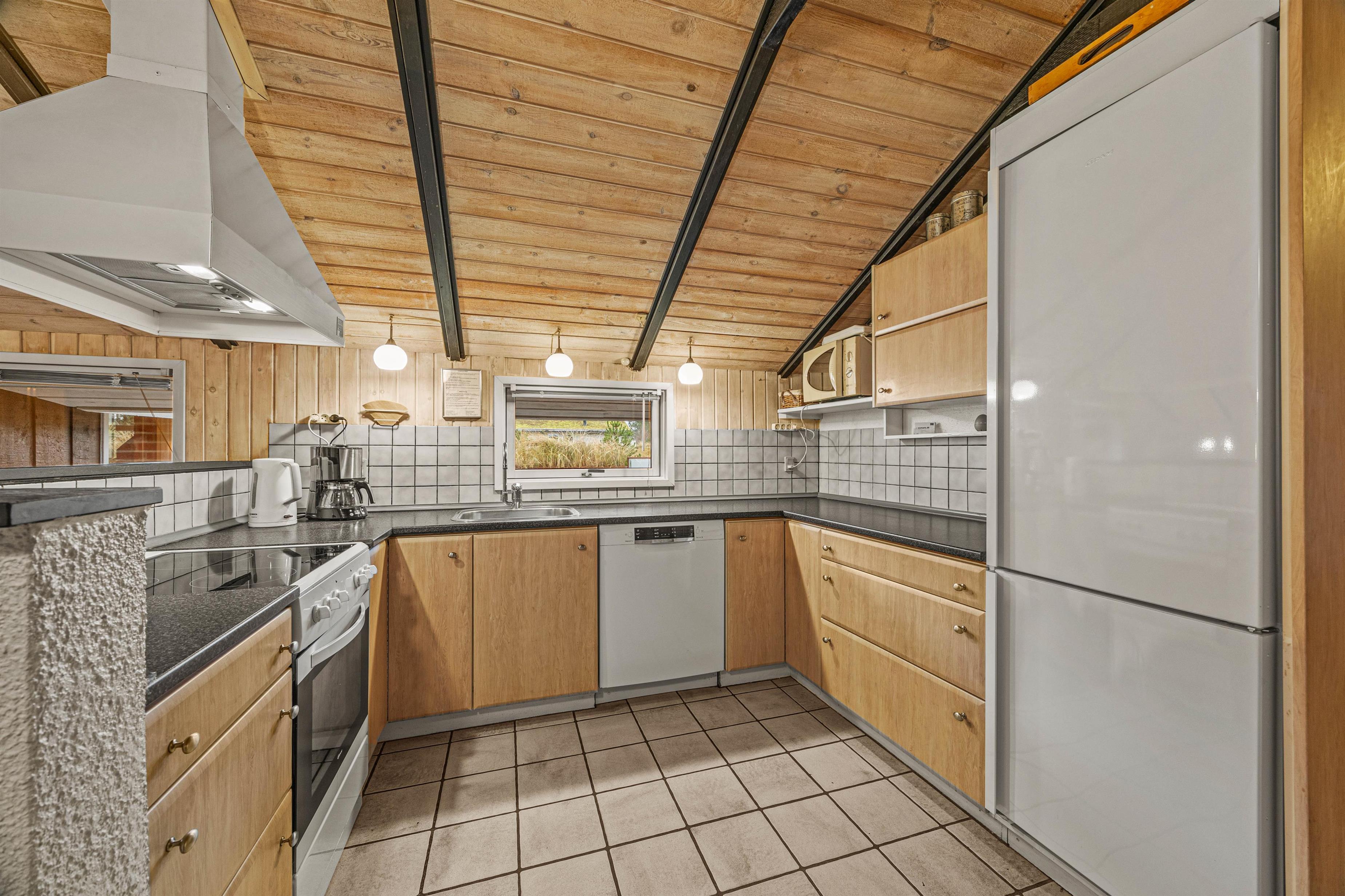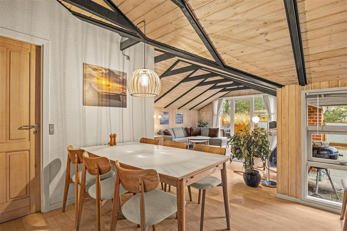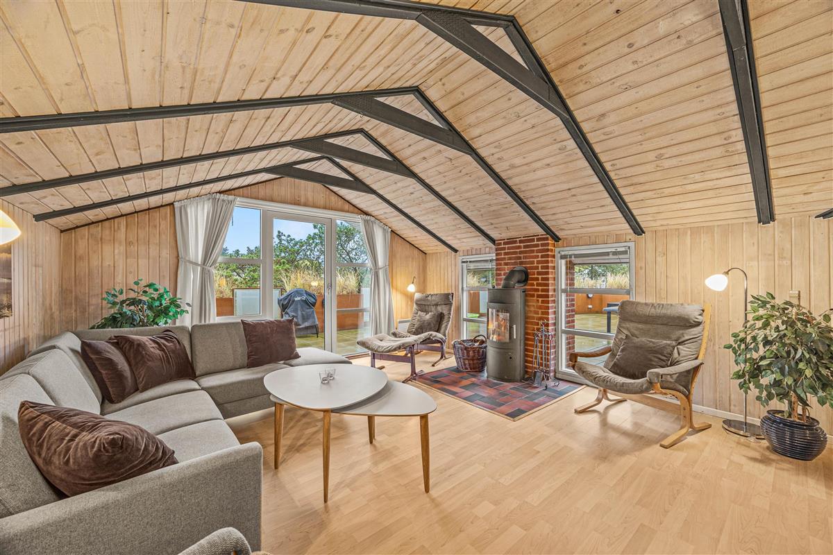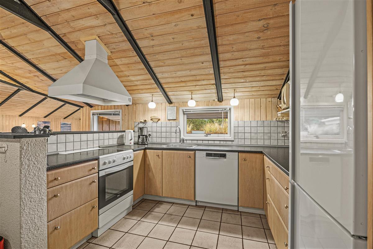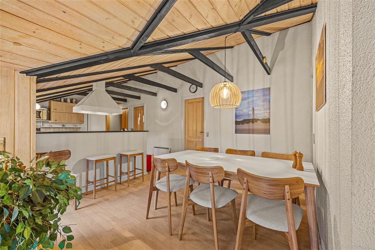 As soon as you enter, you'll feel the traditional atmosphere of a Danish holiday home. Wood-clad walls and ceilings throughout create a warm ambiance. The bright, comfortable living area forms the heart of this traditional holiday home, combining the living room, kitchen and dining area in one open-plan space. Thanks to this open architecture, the whole family can enjoy their holiday together.