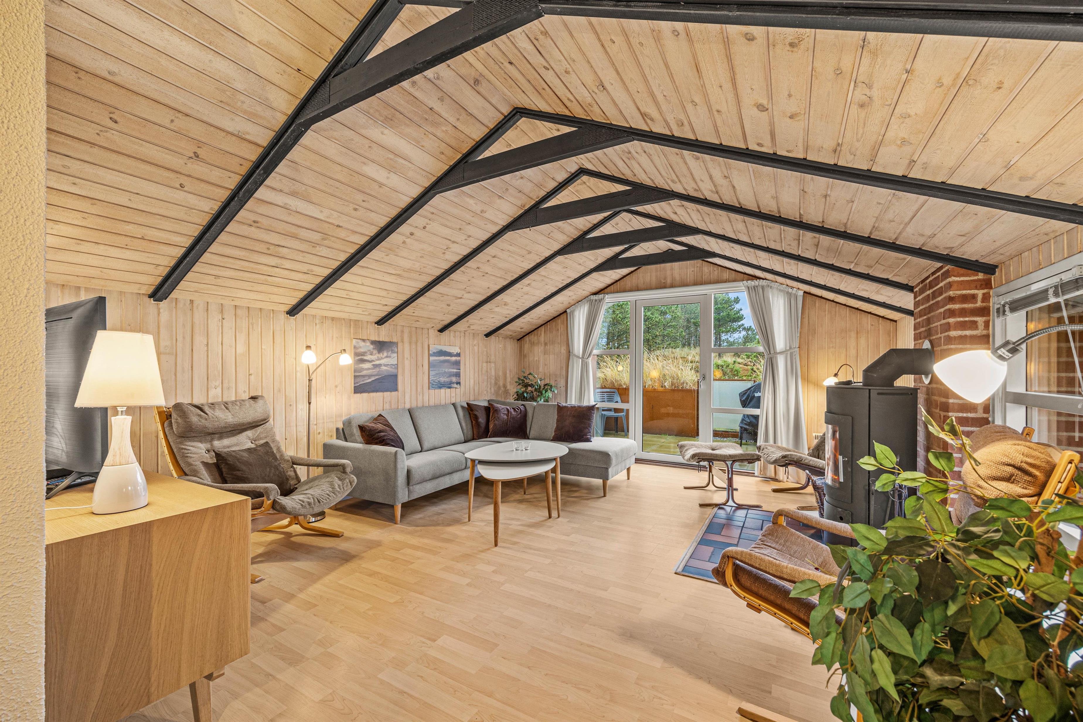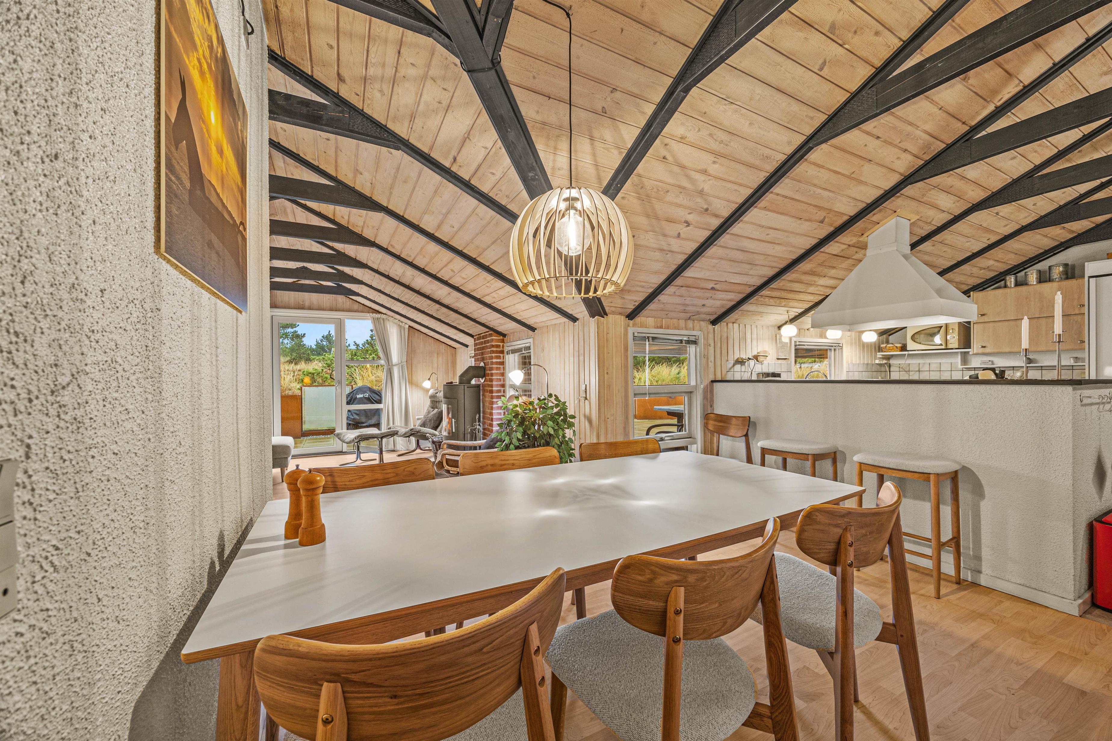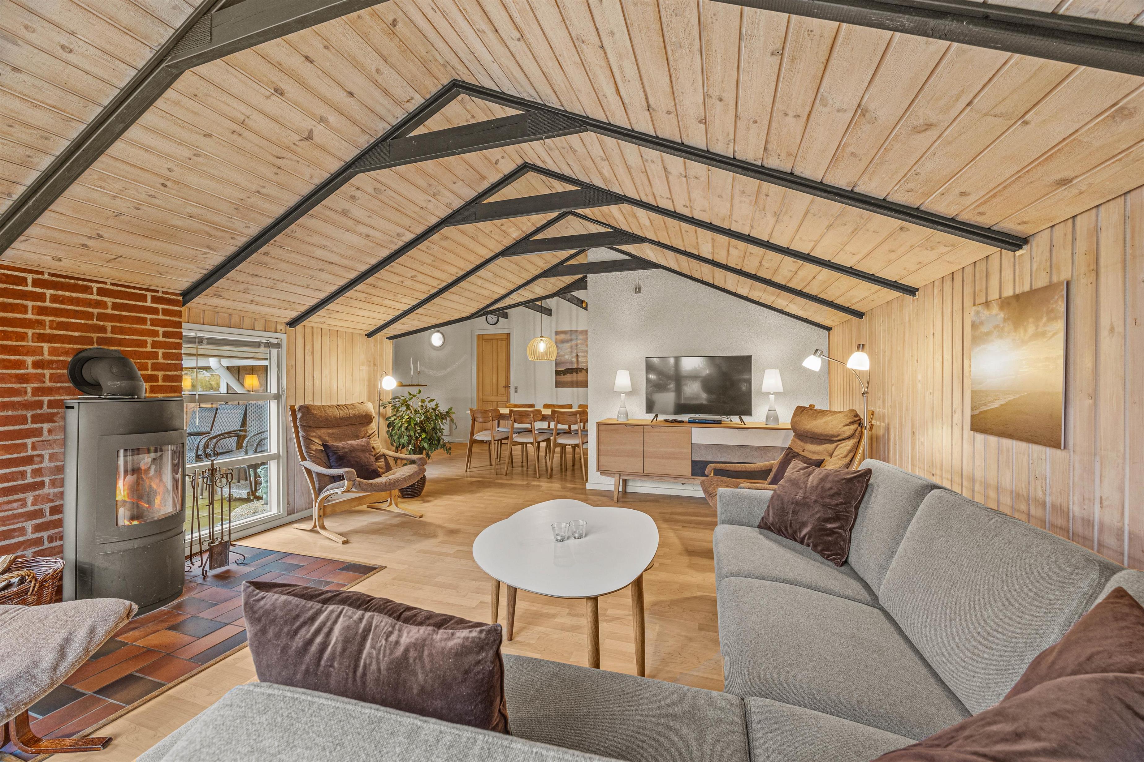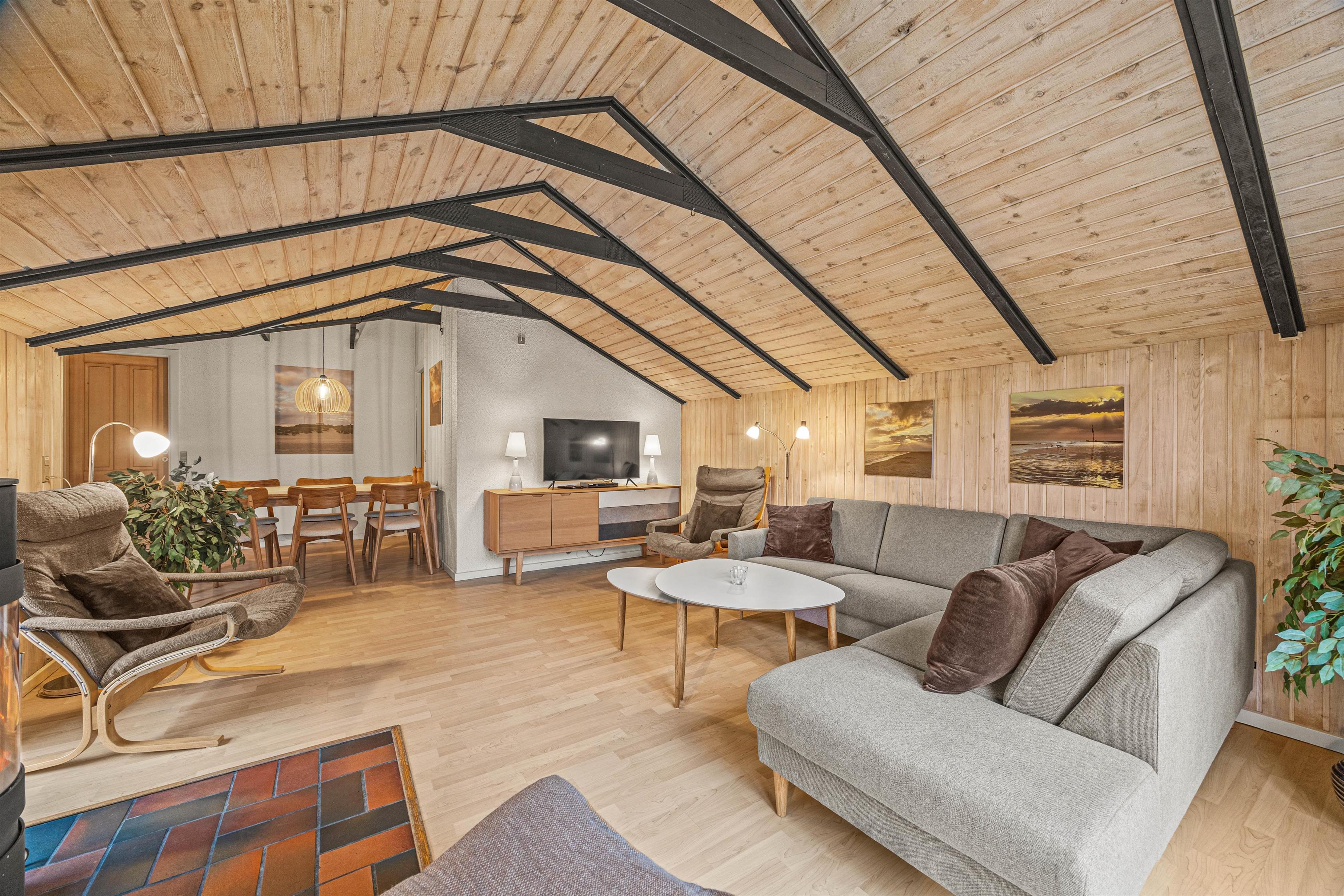As soon as you enter, you'll feel the traditional atmosphere of a Danish holiday home. Wood-clad walls and ceilings throughout create a warm ambiance. The bright, comfortable living area forms the heart of this traditional holiday home, combining the living room, kitchen and dining area in one open-plan space. Thanks to this open architecture, the whole family can enjoy their holiday together.