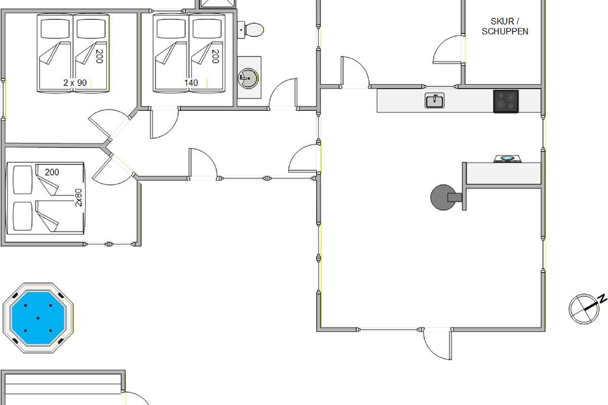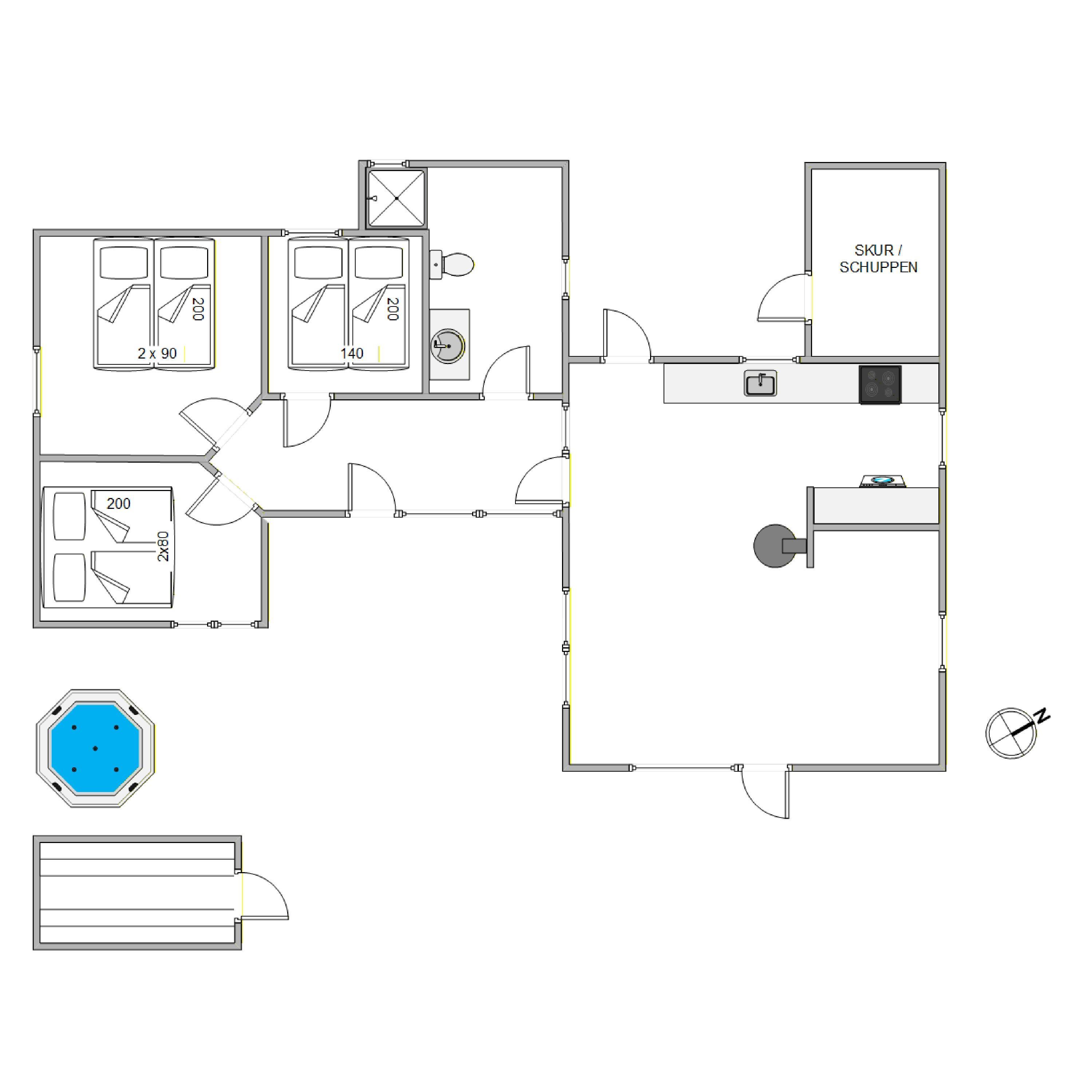 The holiday home has a living area of 71 m² and accommodates up to 6 people, making it ideal for most families or groups of friends. The cozy fireplace with its crackling flames provides warmth and a wonderful atmosphere, perfect for relaxing evenings year-round. Here, you can gather together, or finally immerse yourself in that book you’ve been meaning to read.