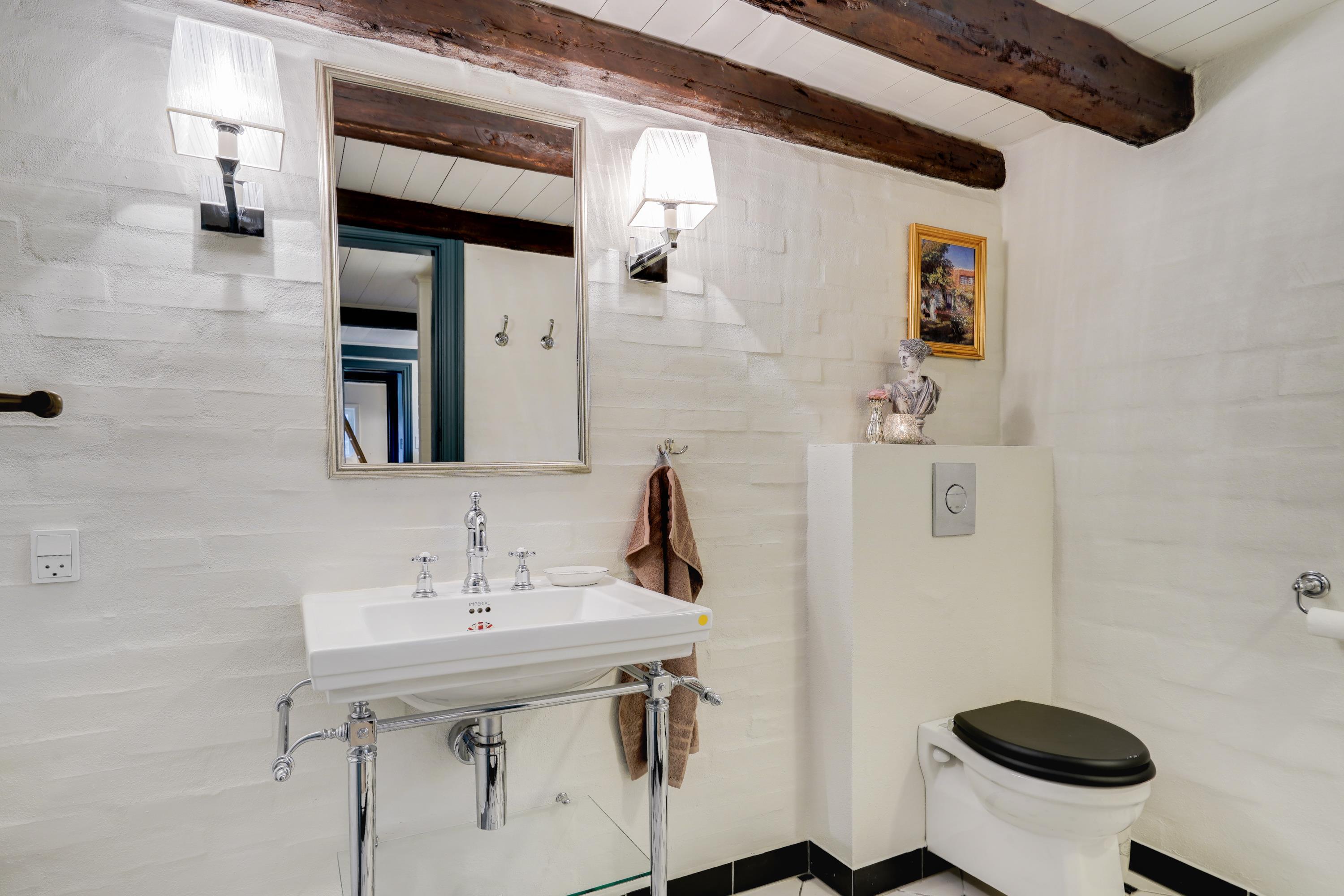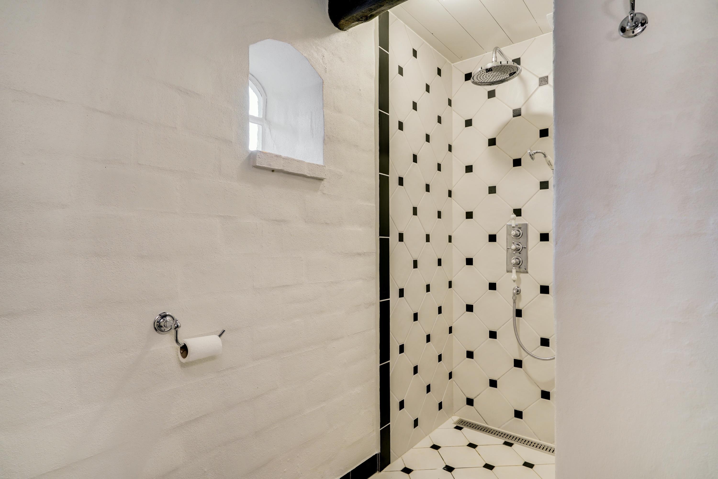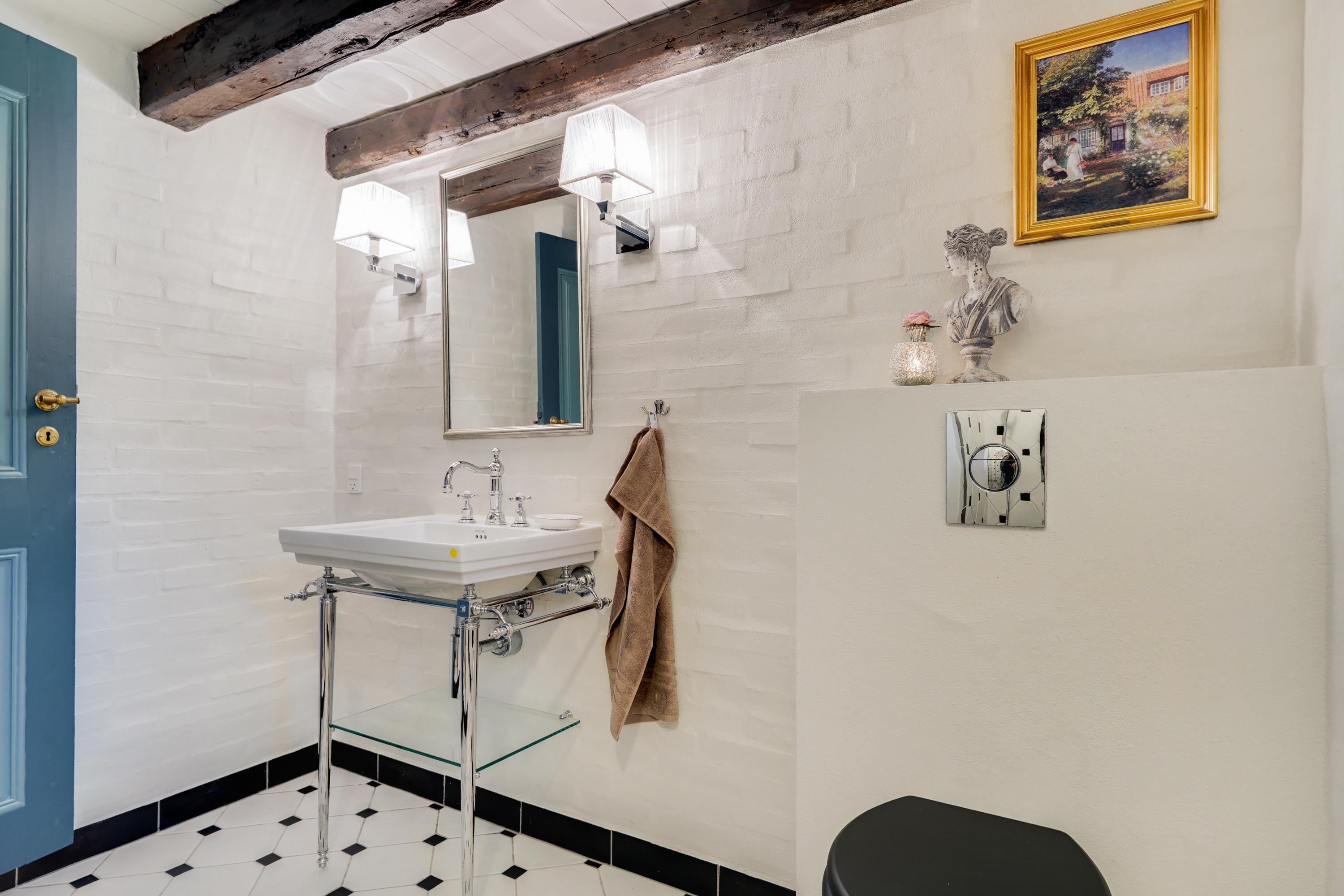 Start your day with a refreshing shower in one of the two beautiful bathrooms with underfloor heating. One bathroom houses both a washing machine and tumble dryer for your convenience. The bathrooms have been renovated in keeping with the holiday home's traditional style, maintaining the home's cohesive character.