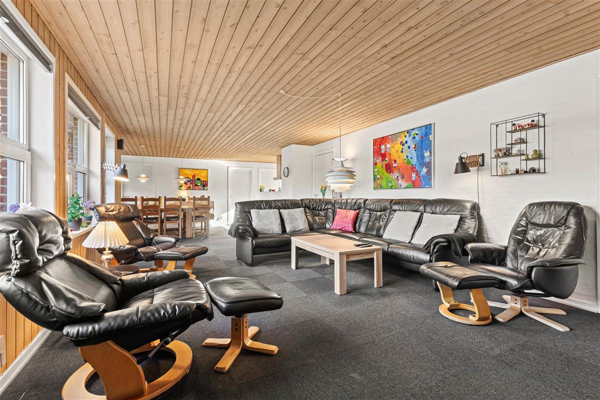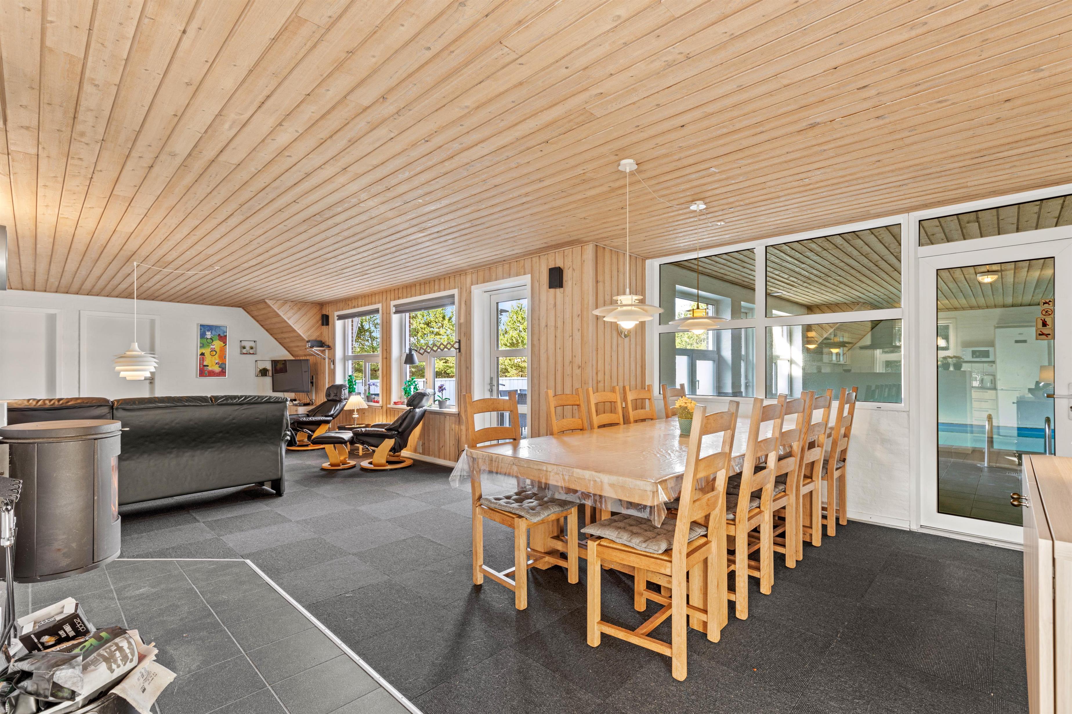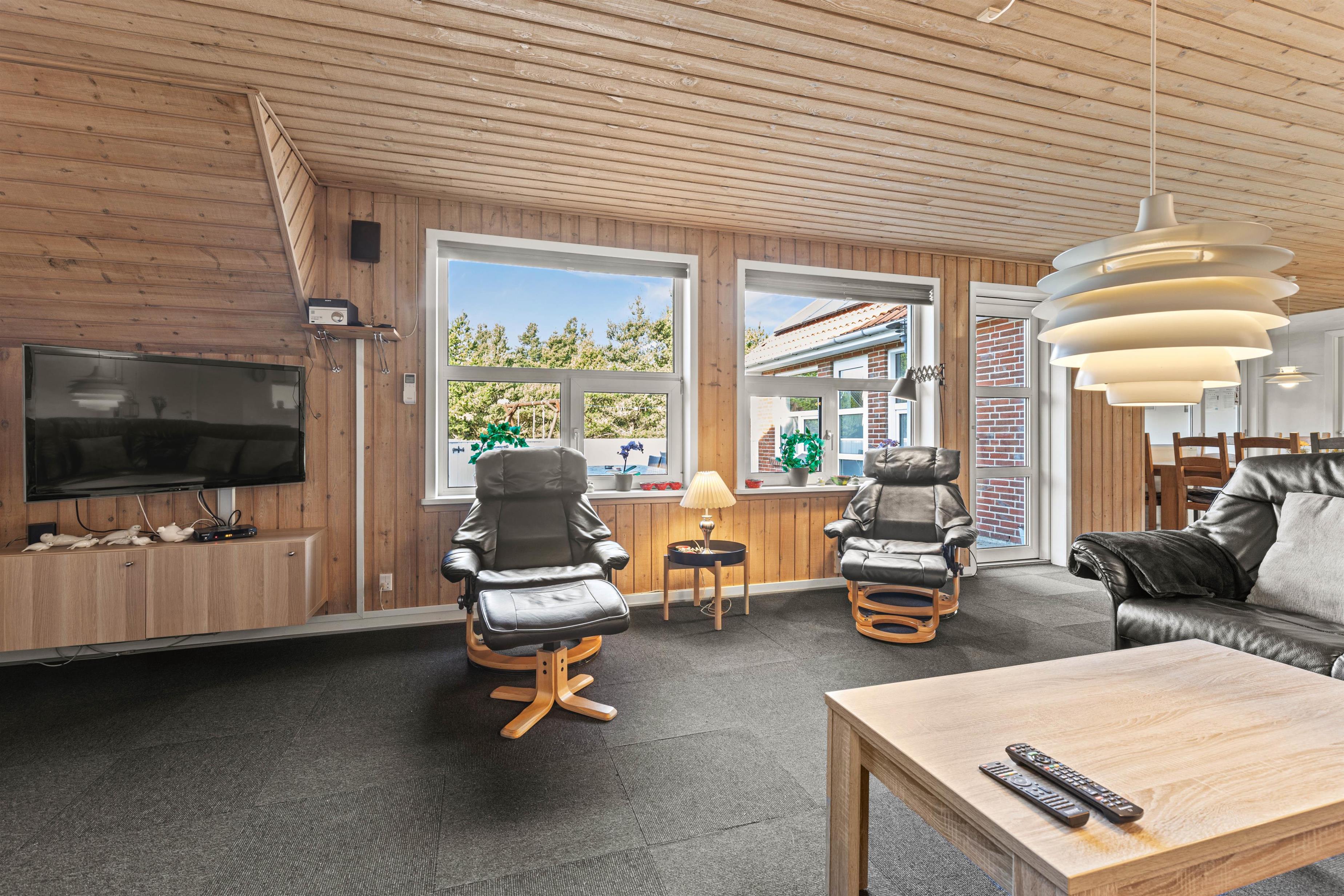 The living room forms the heart of this 190-square-metre holiday home. Comfortably furnished with carpeting, a wood-burning stove, large flat-screen TV, sofa and armchairs, it provides an excellent base for extended relaxation. A particularly practical feature is the direct access to the furnished, well-sheltered terrace.