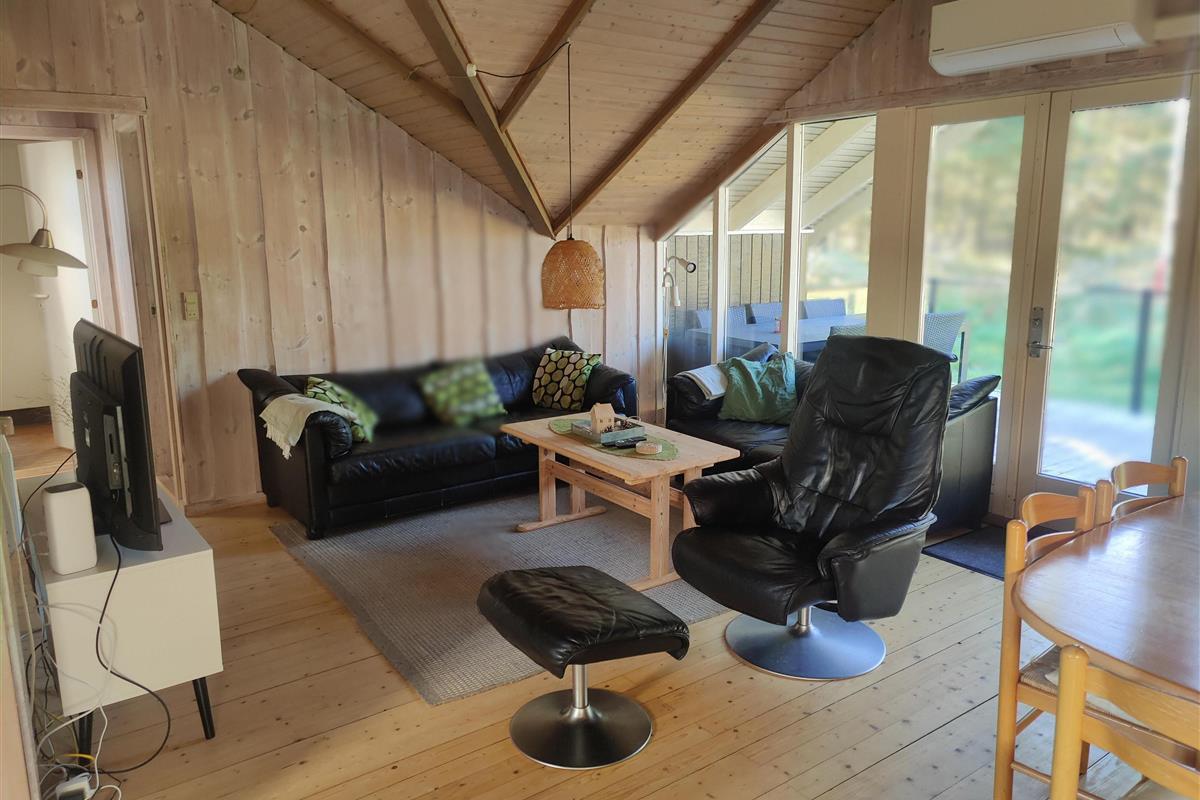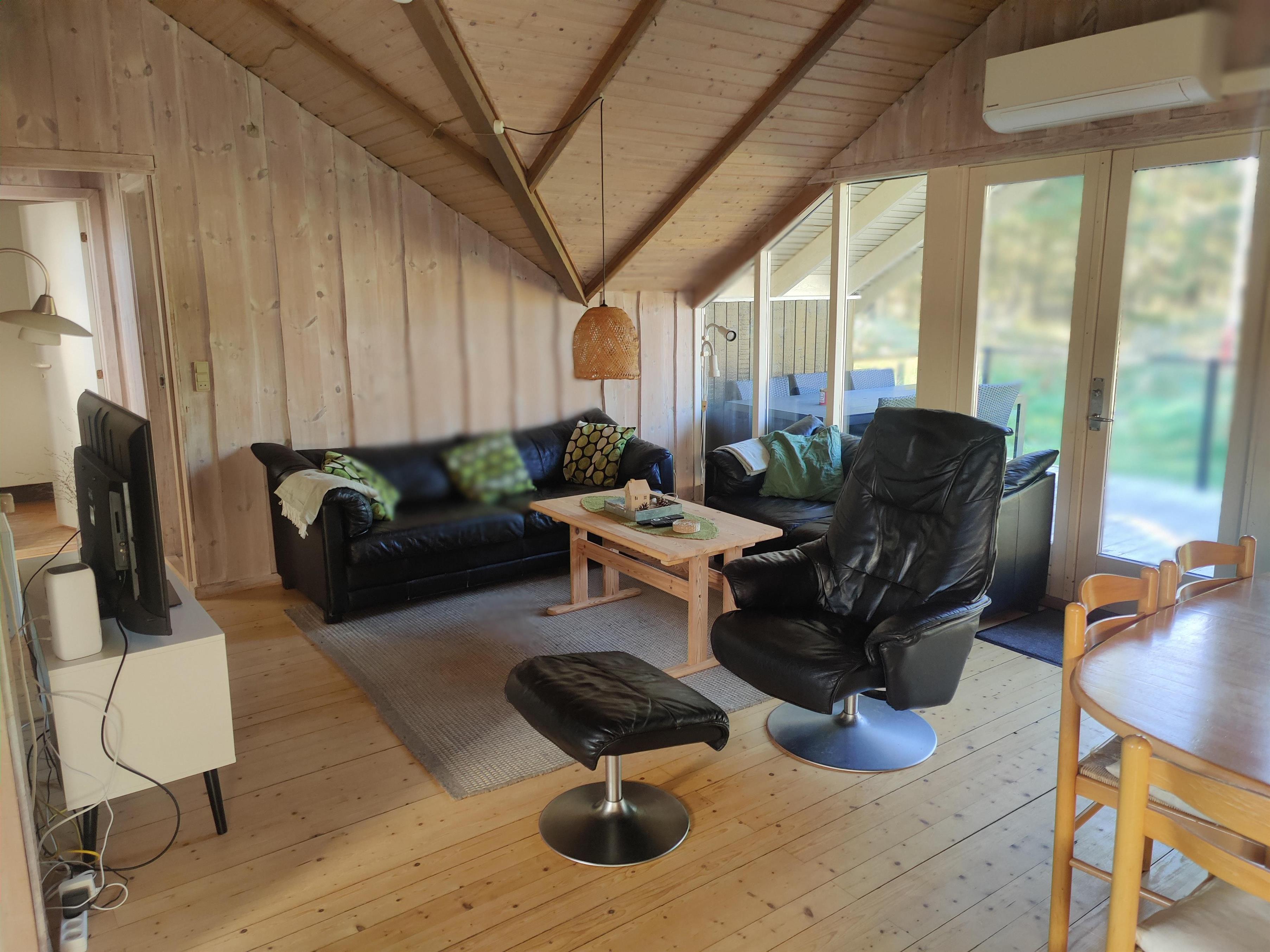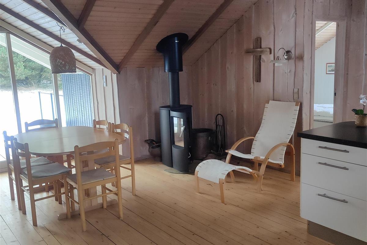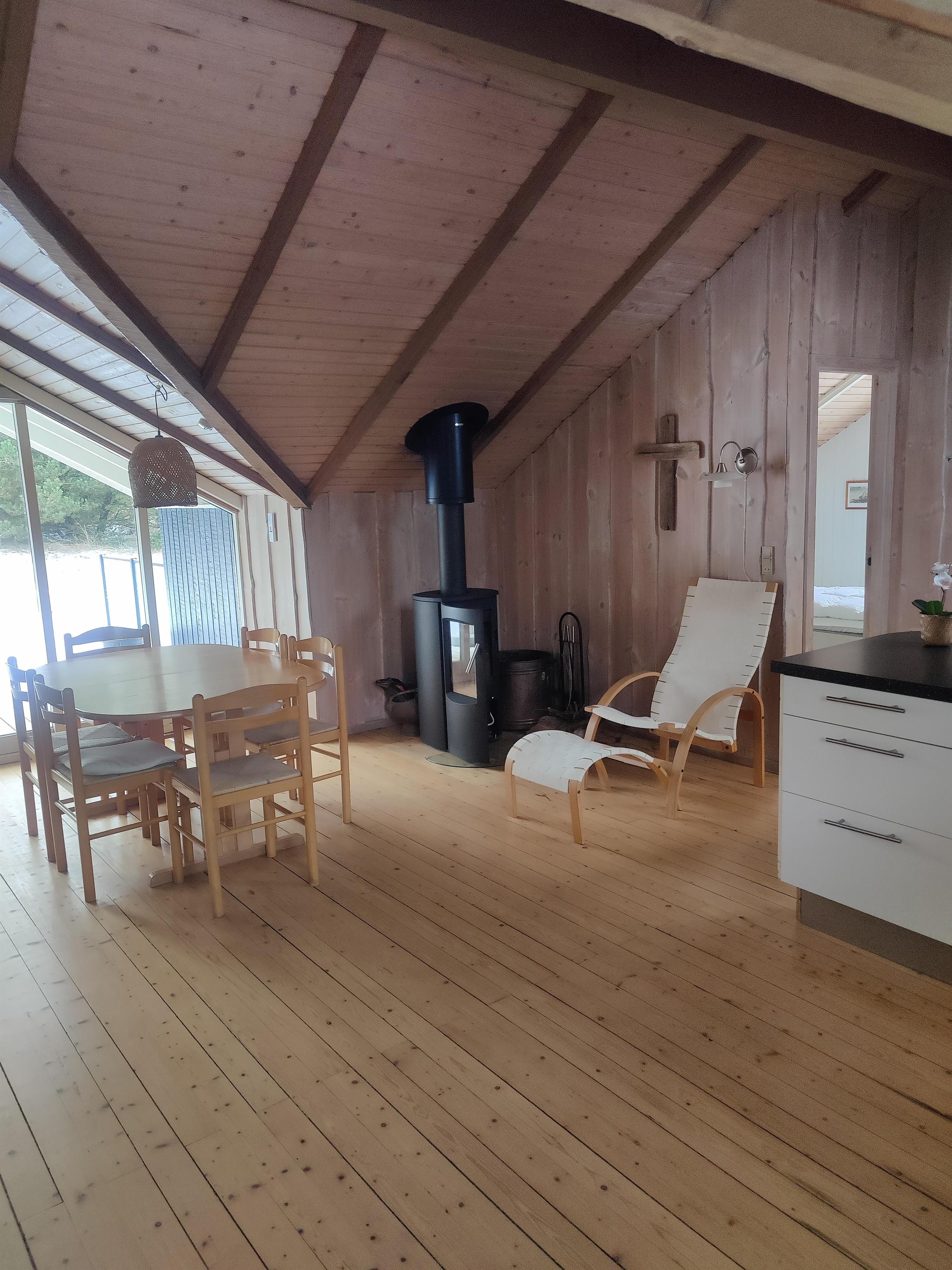 The holiday home also features a well-equipped kitchen with an induction hob, a dishwasher and a small freezer, making cooking a breeze; there is also a 100-litre freezer in the shed. Delicious meals bring everyone together around the dining table, after which you can enjoy the evening with board games or relax on the sofa with a good movie. There is also an energy-efficient heat pump ensuring a comfortable indoor climate – and on cooler days you can light the cosy wood-burning stove.