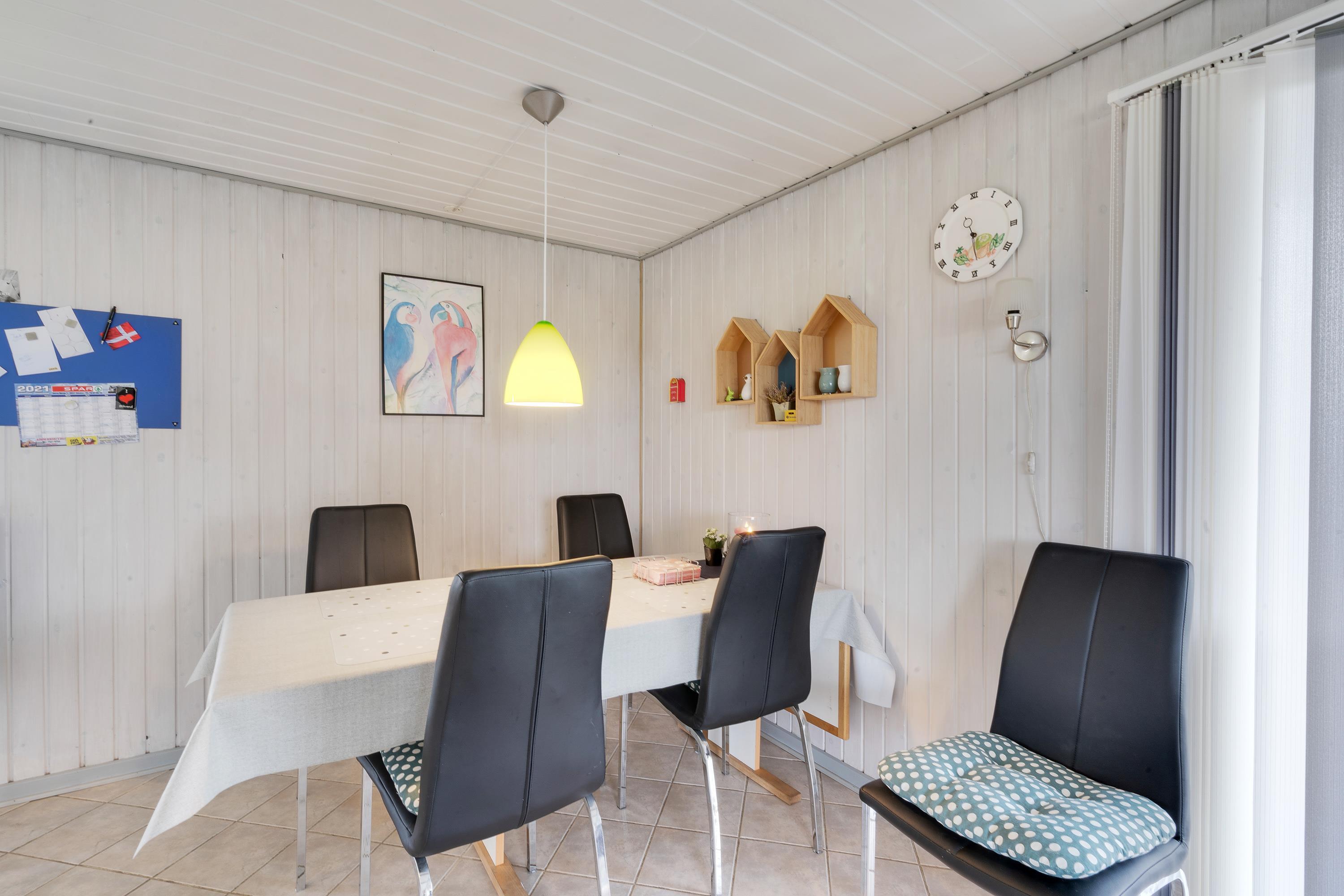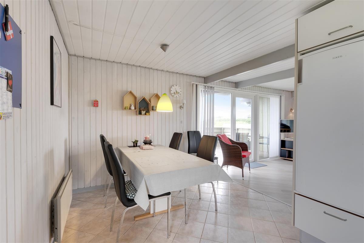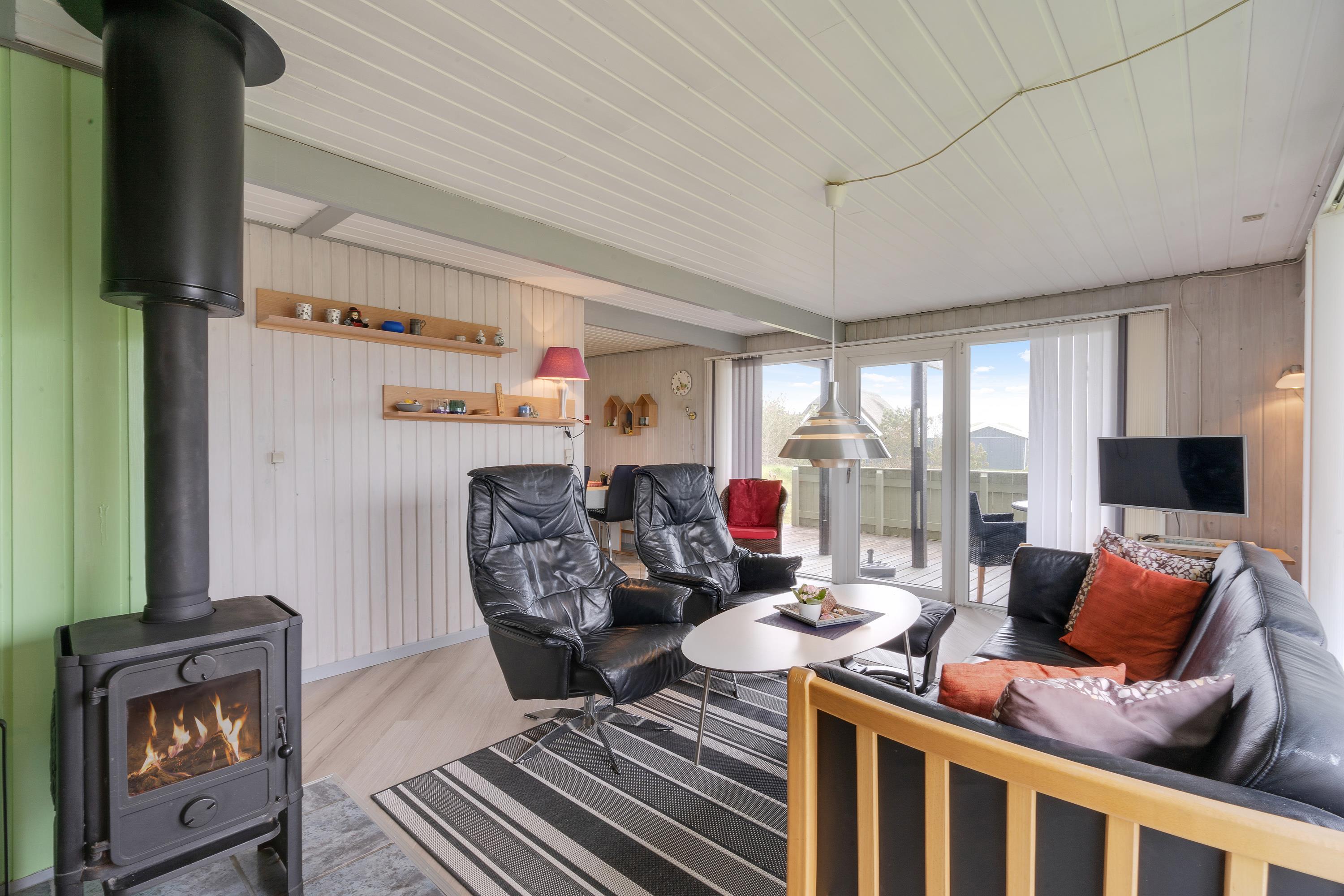 The main living space centres around an open-plan living and dining area with integrated kitchen. Here you can enjoy lovely views over the surroundings and neighbourhood - it's truly the heart of the home. Whether you're cooking together, relaxing, playing games or watching your favourite programme on TV - the choice is yours. The wood-burning stove provides comfortable warmth, adding to the cosy holiday home atmosphere.