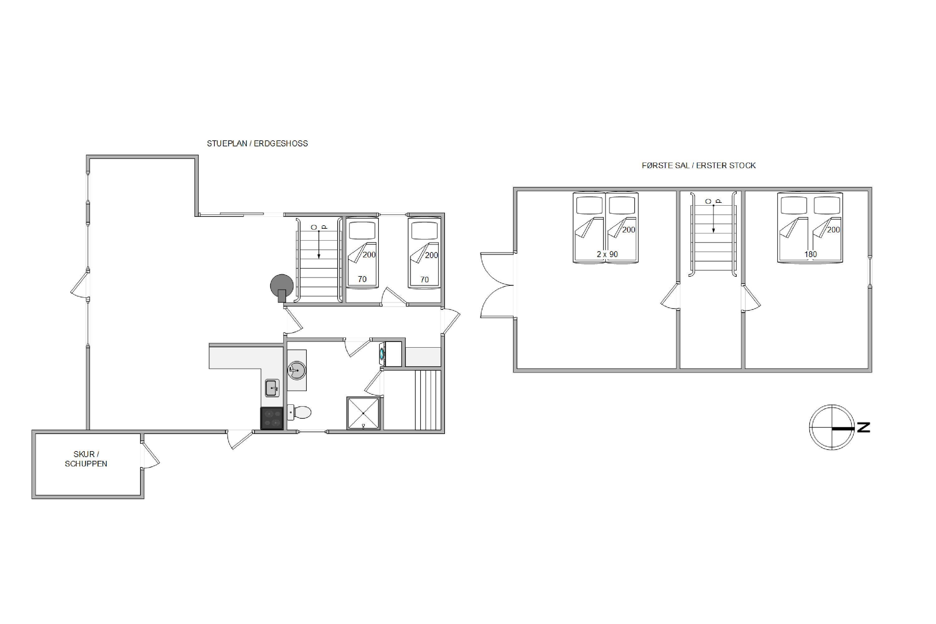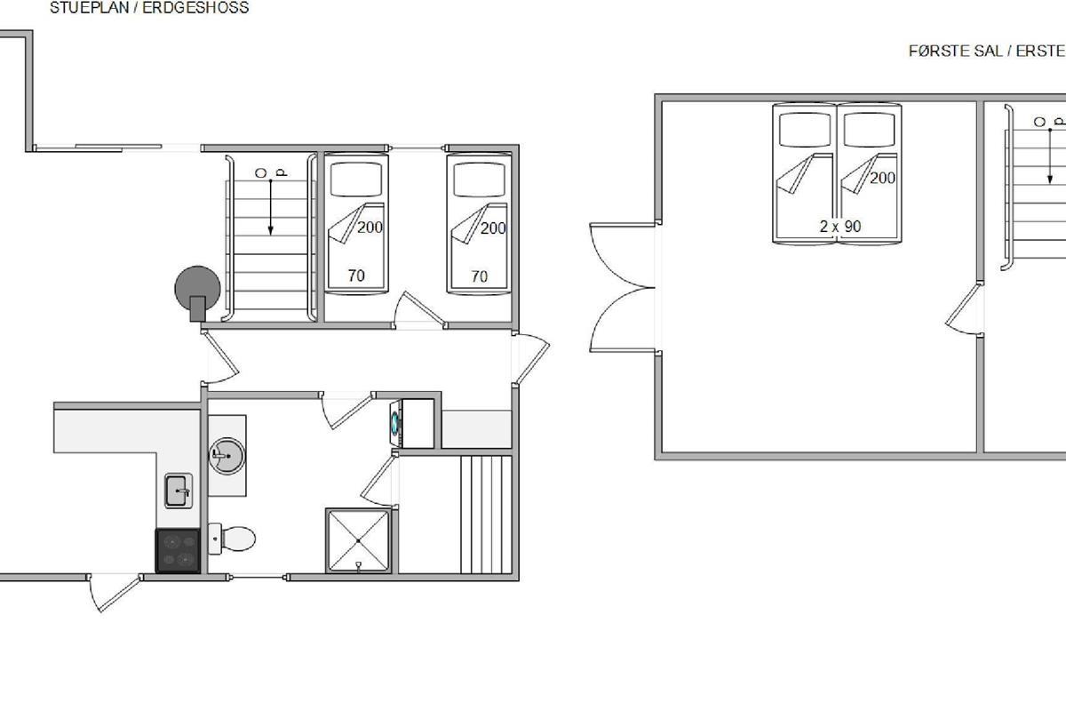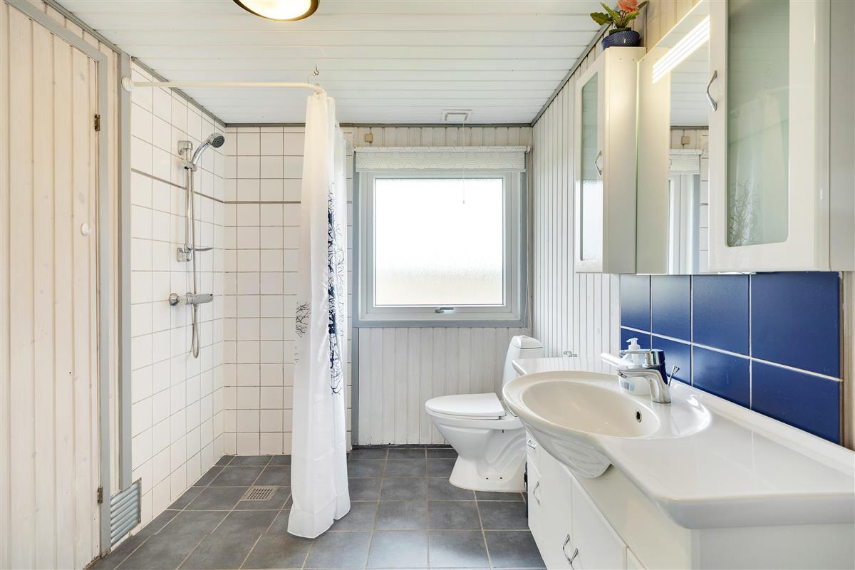 The main living space centres around an open-plan living and dining area with integrated kitchen. Here you can enjoy lovely views over the surroundings and neighbourhood - it's truly the heart of the home. Whether you're cooking together, relaxing, playing games or watching your favourite programme on TV - the choice is yours. The wood-burning stove provides comfortable warmth, adding to the cosy holiday home atmosphere.