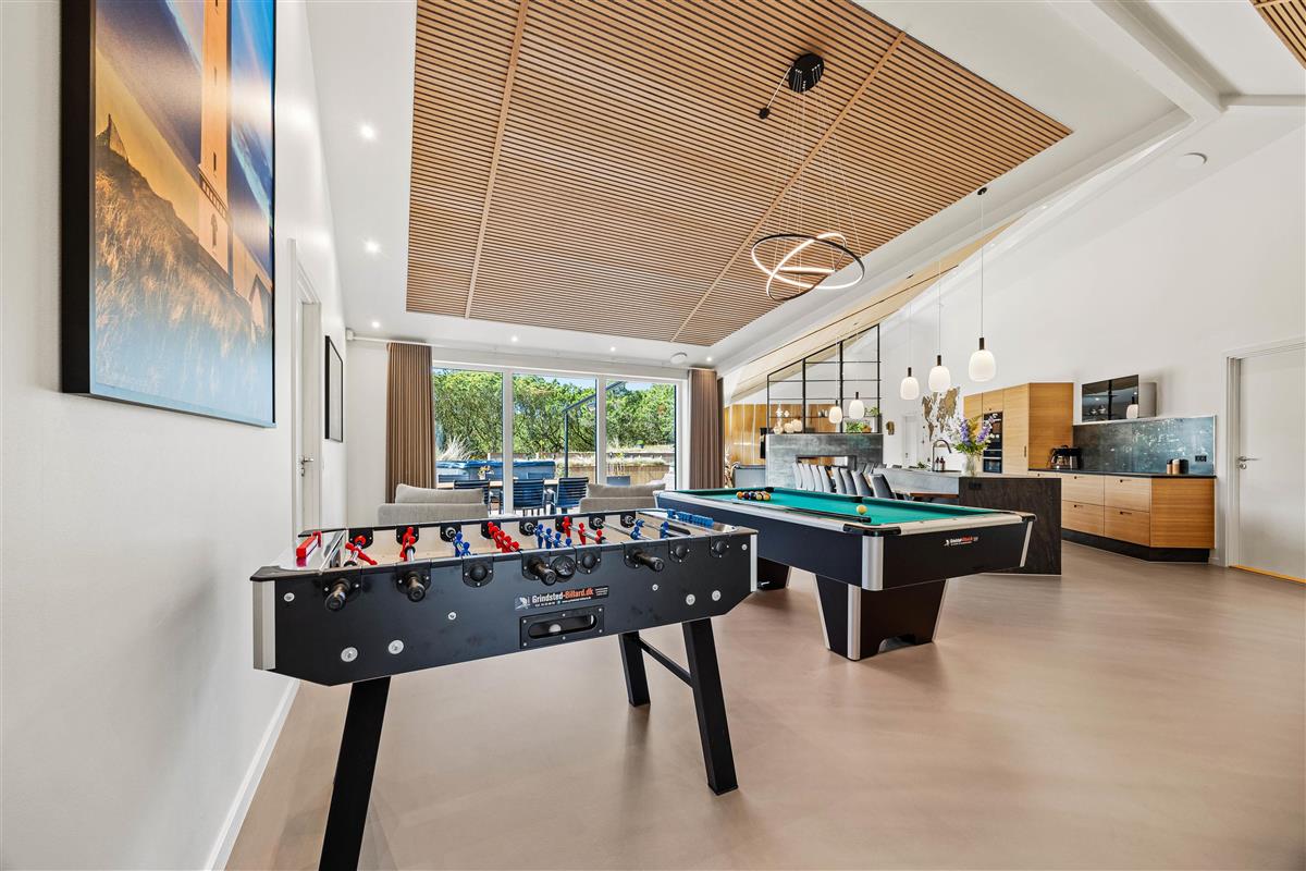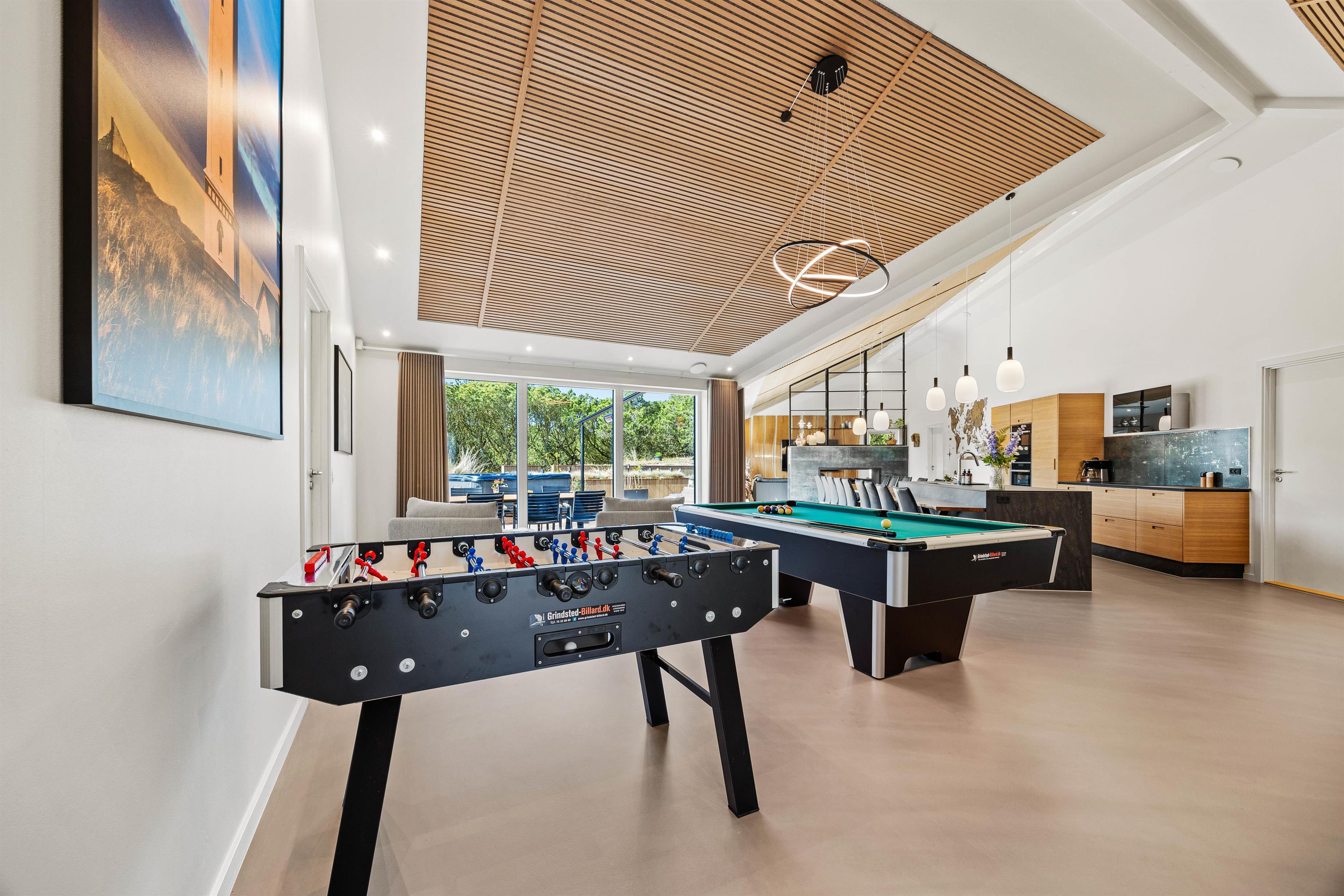 Die Küche des Hauses ist mehr als großzügig ausgestattet - ein Muss für leidenschaftliche Köche, sogar mit Weinkühler und Combi-Ofen. Mit einer modernen Spülmaschine und einem 140-Liter-Gefrierschrank ausgestattet, lässt es Euch an nichts fehlen. Nutzt die Gelegenheit, im offenen Wohnbereich spannende Billardspiele am Poolbillardtisch zu erleben oder euch gemütlich mit den Lieben zu entspannen. Mit Waschmaschine und Trockner sind selbst lange Aufenthalte bequem gestaltet.