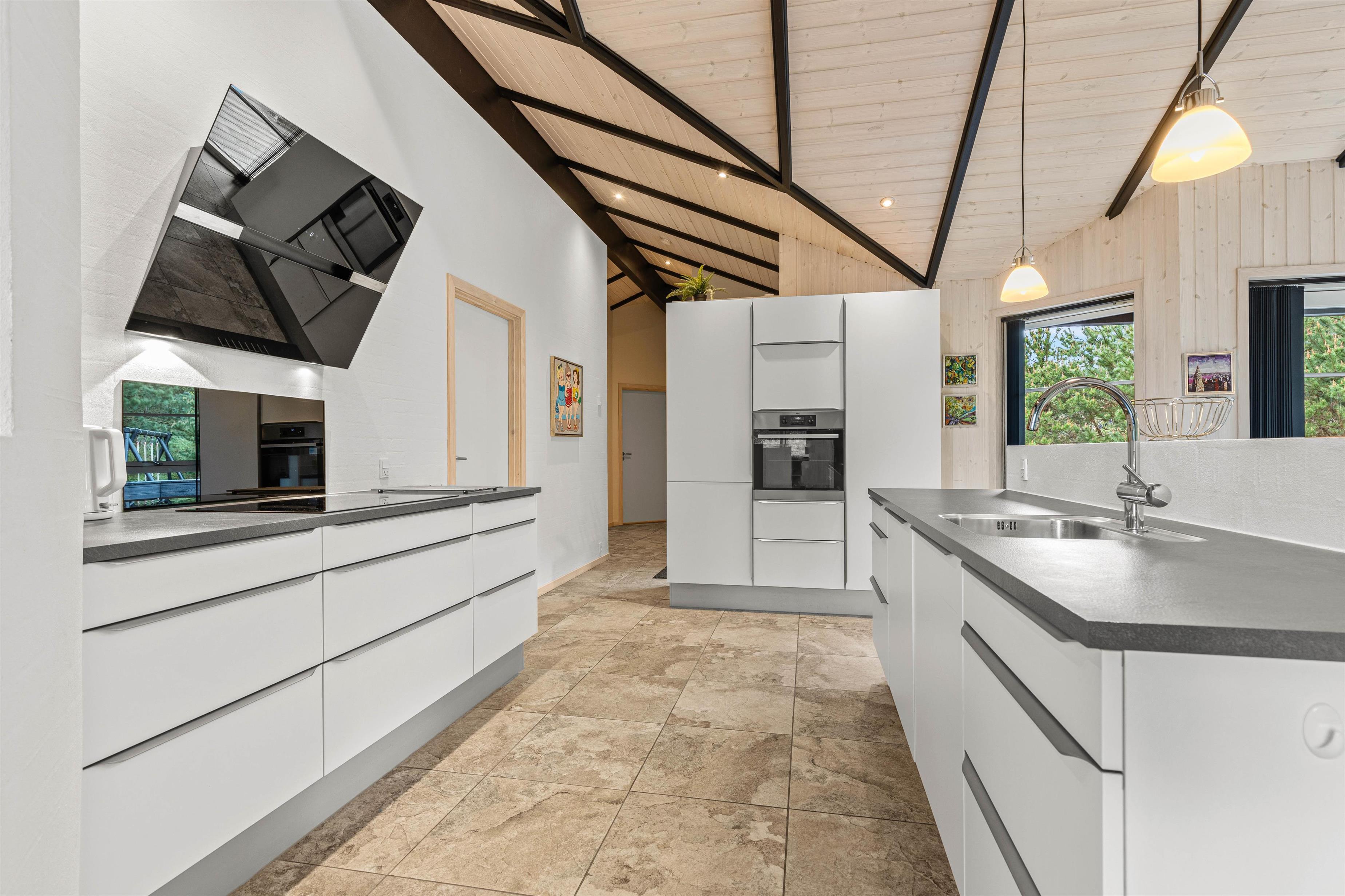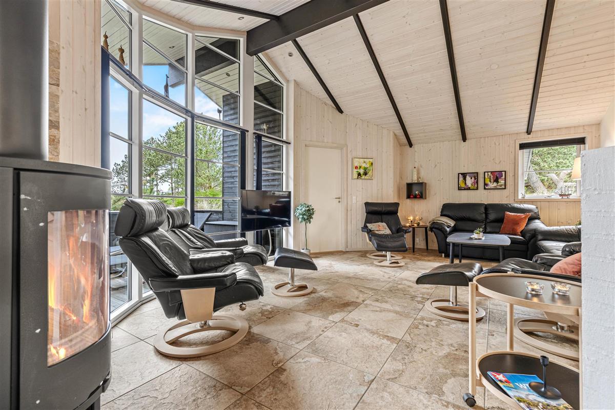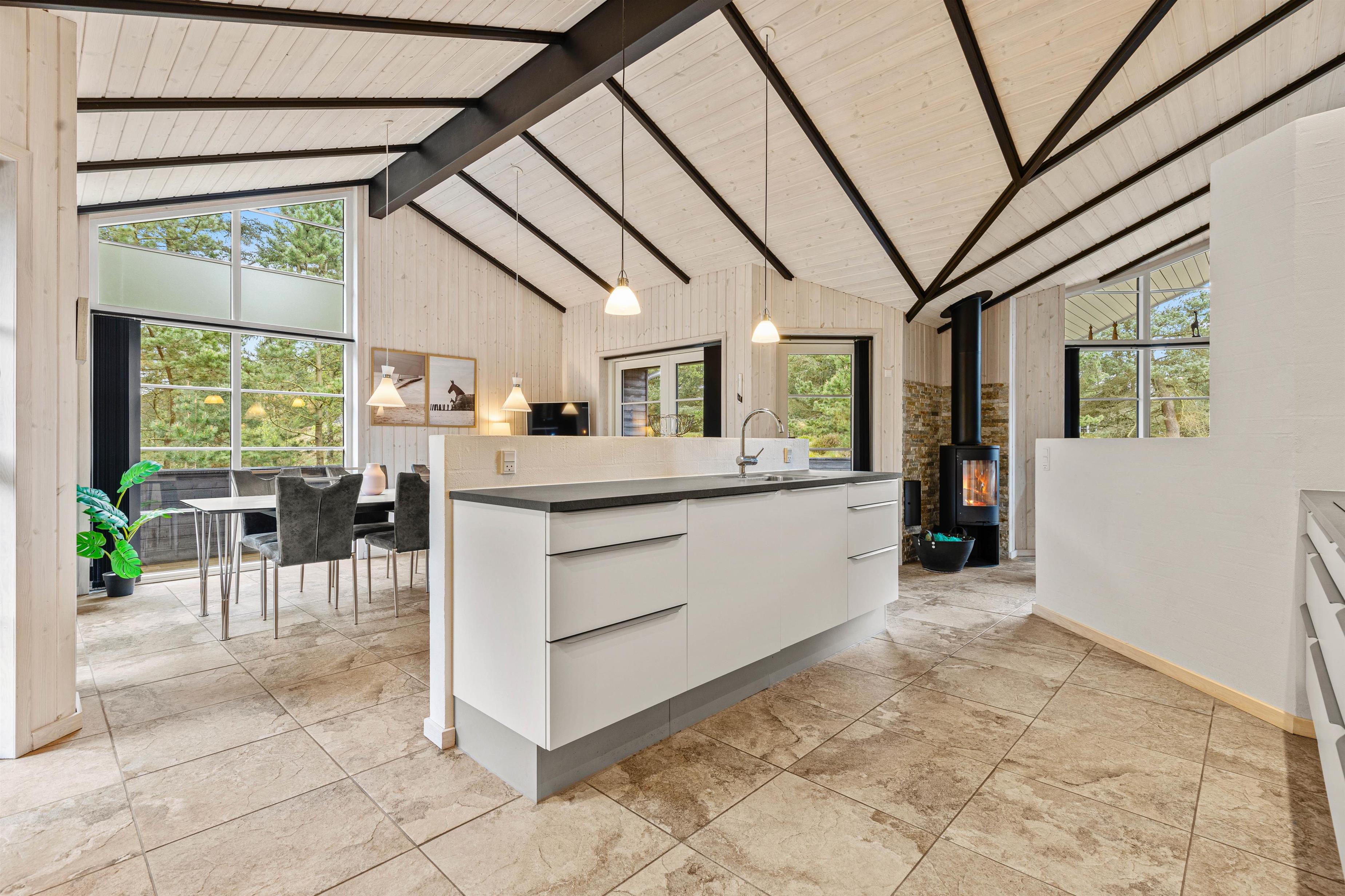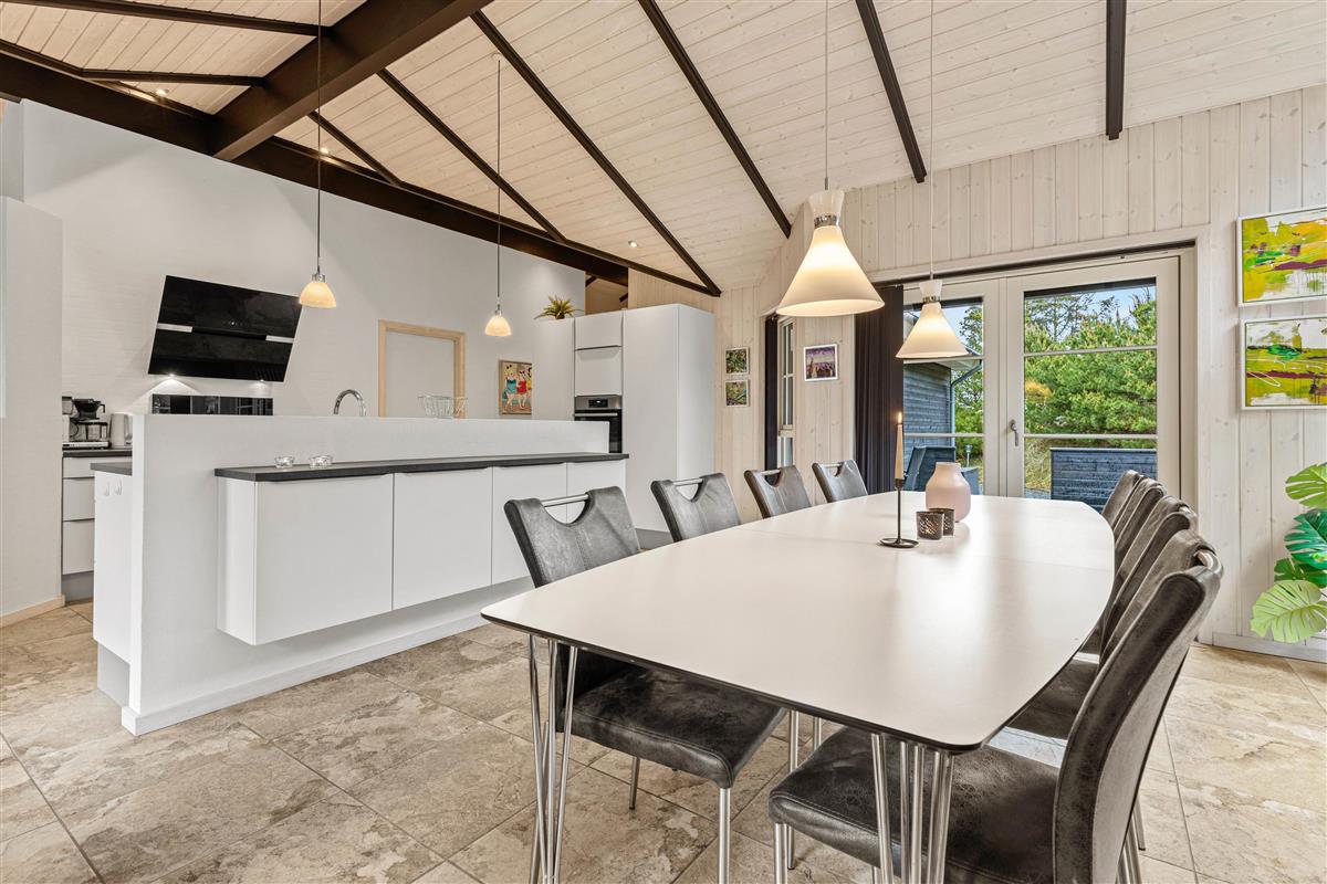 The central space of the holiday home at Blavandvej 52A features an open-plan layout combining kitchen, dining area and living room. All eight guests can comfortably gather in the corner sofa arrangement – with the armchair beside the crackling wood-burning stove being the prime spot. Light colours create a sense of space, while dark wooden beams add elegant character.