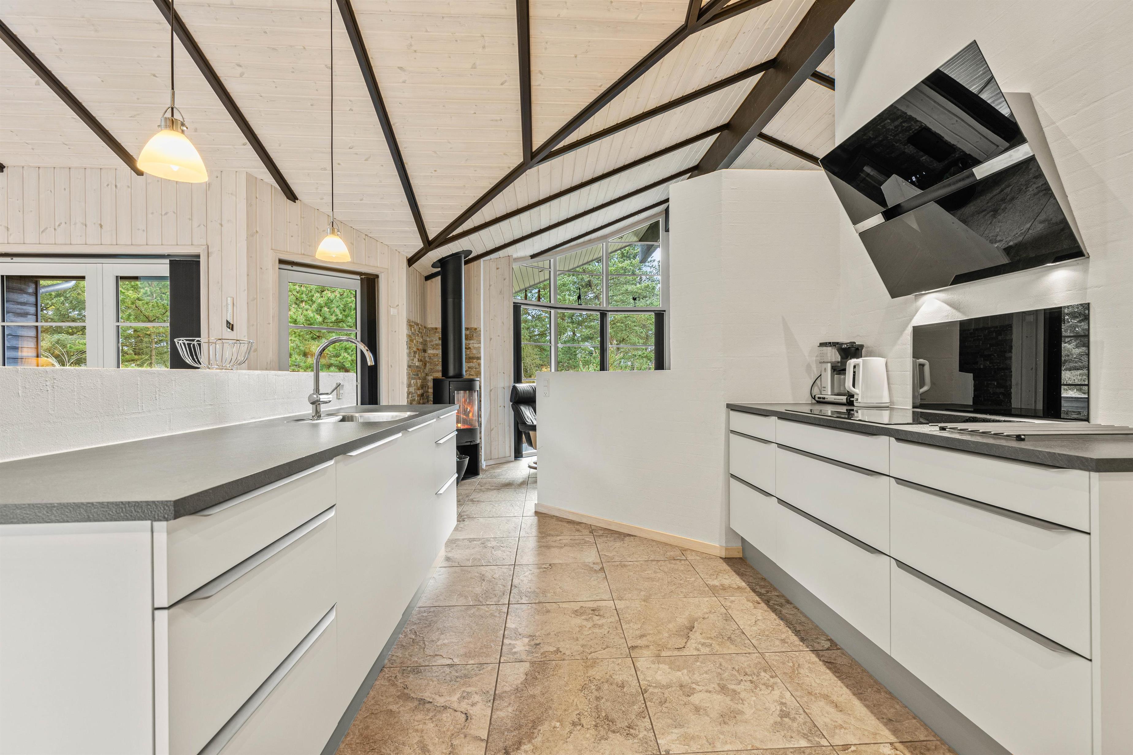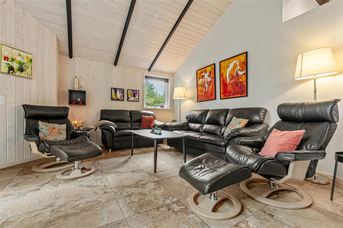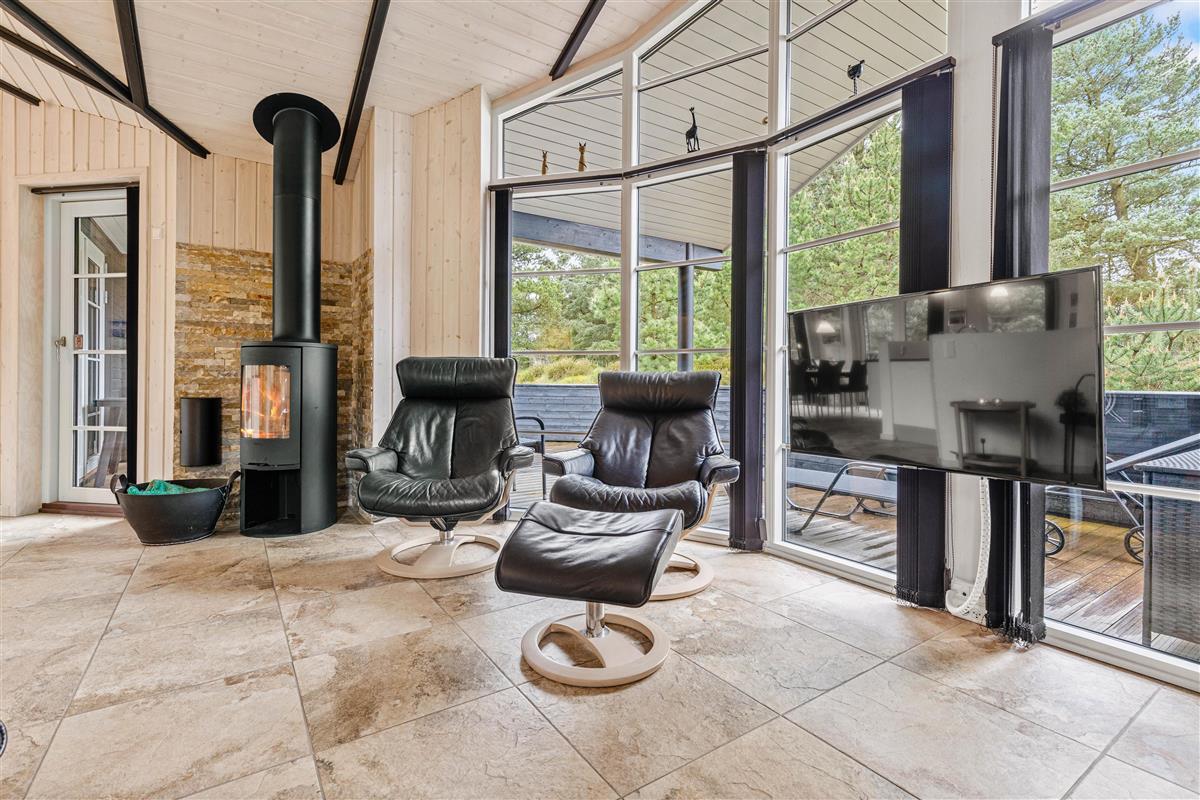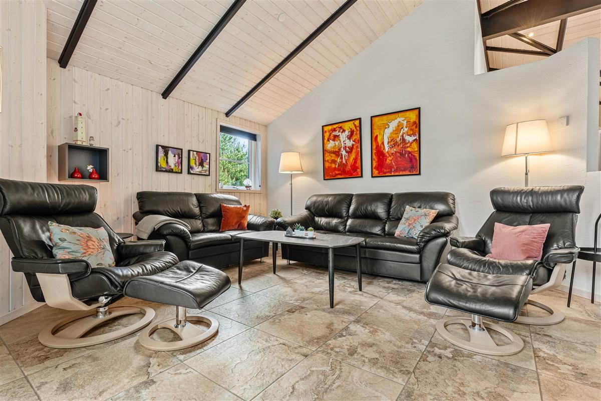 The central space of the holiday home at Blavandvej 52A features an open-plan layout combining kitchen, dining area and living room. All eight guests can comfortably gather in the corner sofa arrangement – with the armchair beside the crackling wood-burning stove being the prime spot. Light colours create a sense of space, while dark wooden beams add elegant character.
