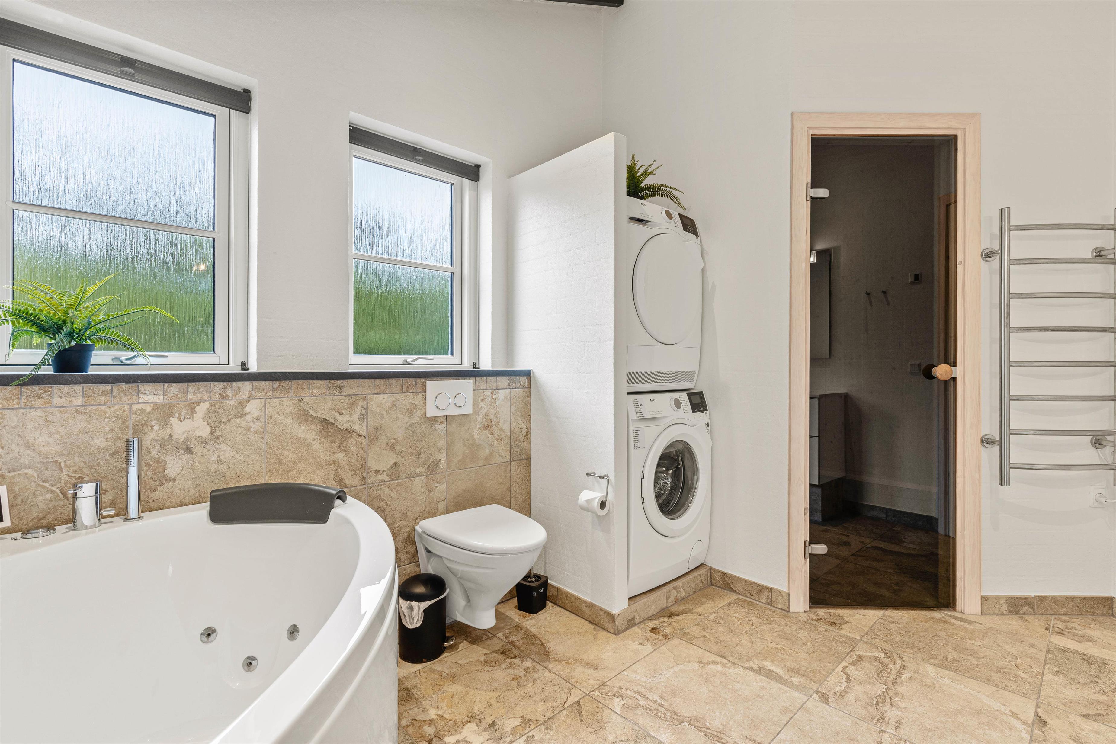 The larger of the two bathrooms, complete with underfloor heating, houses the whirlpool and sauna, promising hours of relaxation. This space also accommodates a washing machine and tumble dryer. The holiday home benefits from eco-friendly ground source heating.