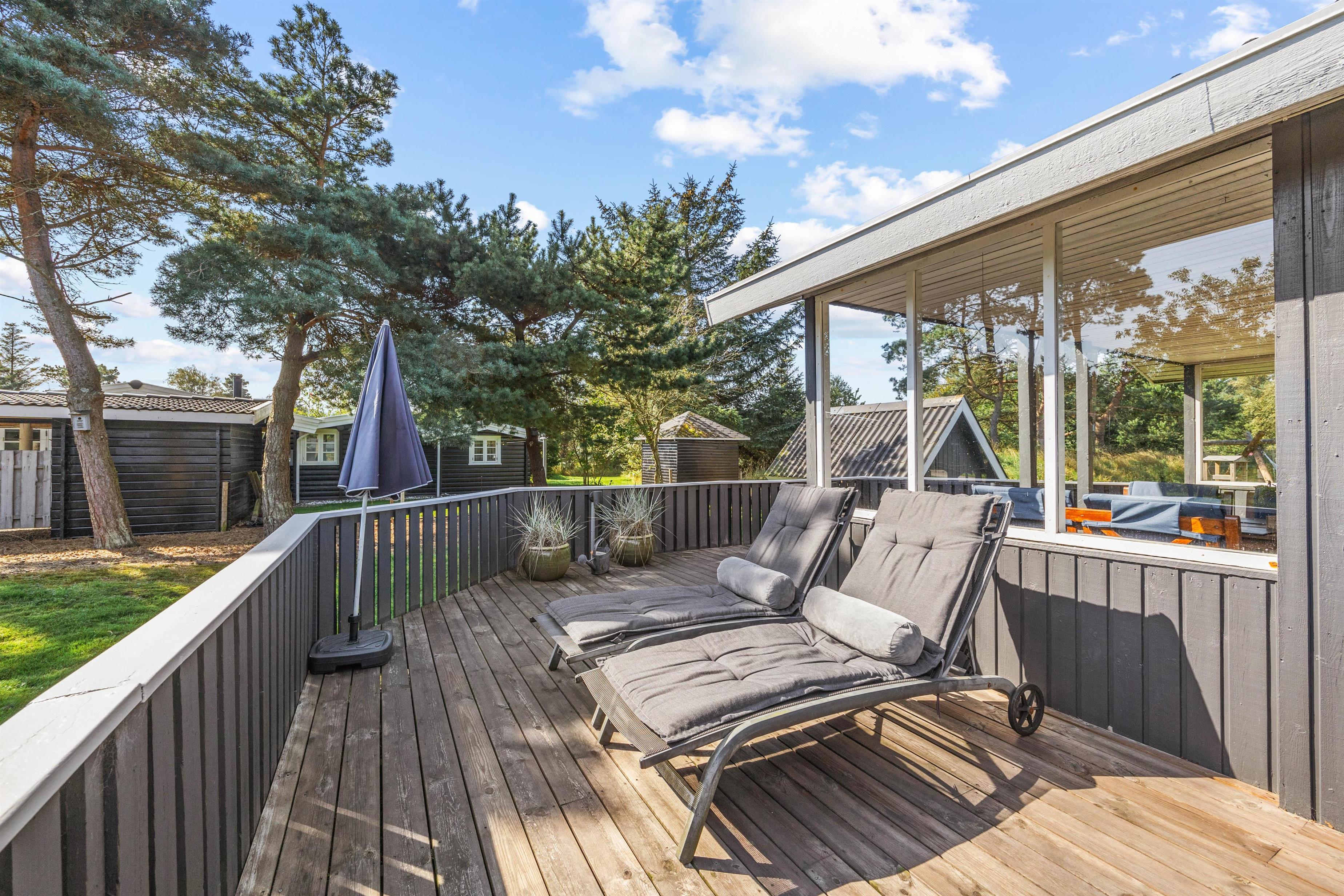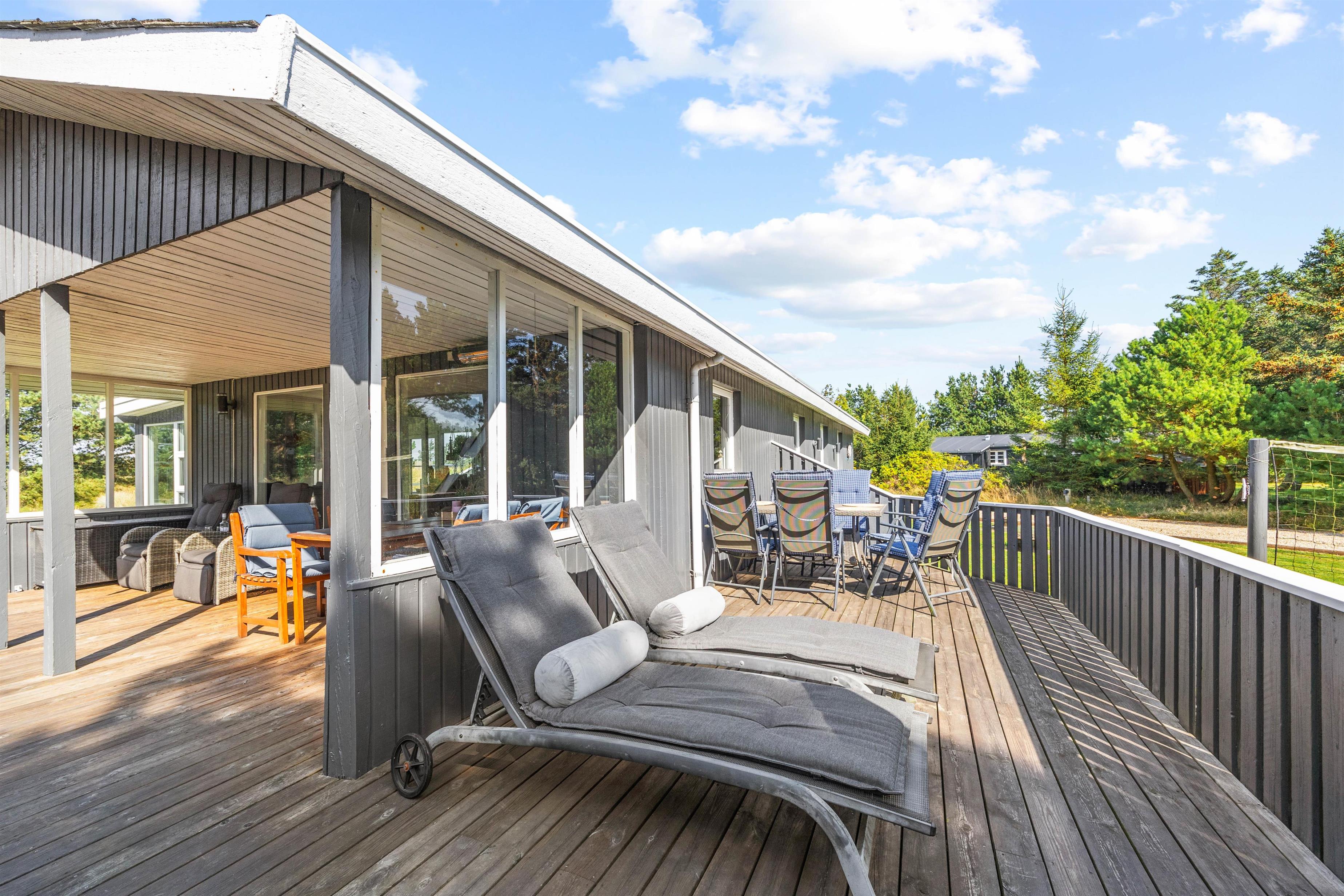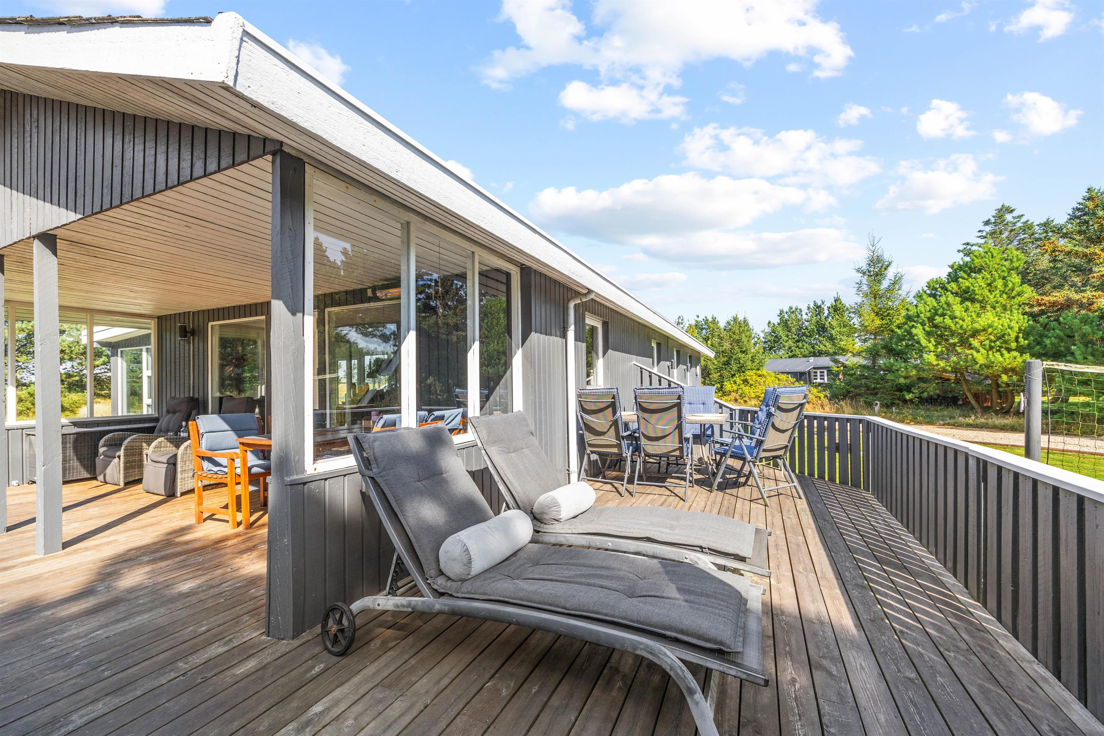 The conservatory, accessed directly from the living area, offers wonderful natural light - an ideal retreat for reading. From here, you can access one of several wooden terraces surrounding this beautiful holiday home. The enclosed terrace provides perfect security, ensuring neither small children nor dogs can wander off alone. If the midday sun becomes too warm, you can retreat to the alternative terrace.