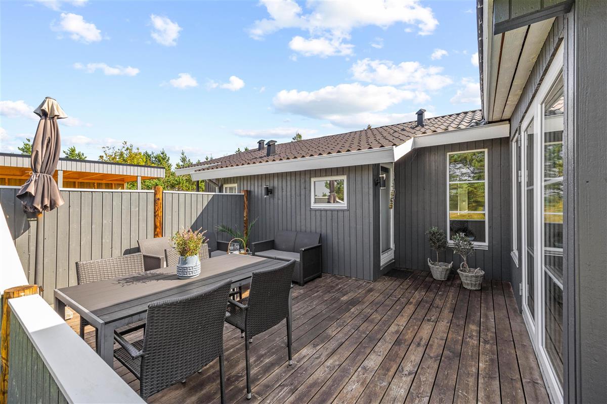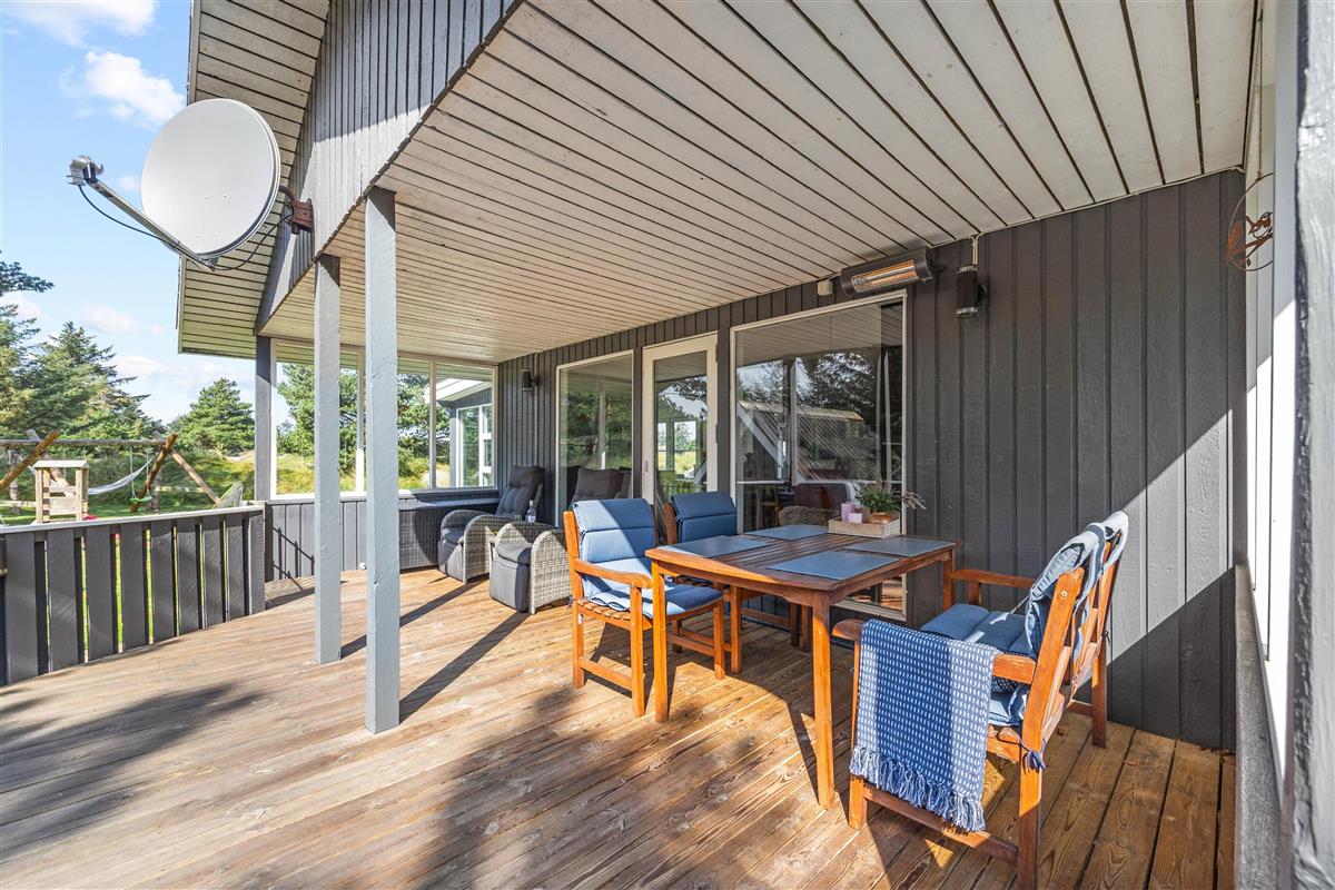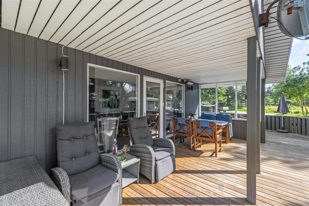 The conservatory, accessed directly from the living area, offers wonderful natural light - an ideal retreat for reading. From here, you can access one of several wooden terraces surrounding this beautiful holiday home. The enclosed terrace provides perfect security, ensuring neither small children nor dogs can wander off alone. If the midday sun becomes too warm, you can retreat to the alternative terrace.