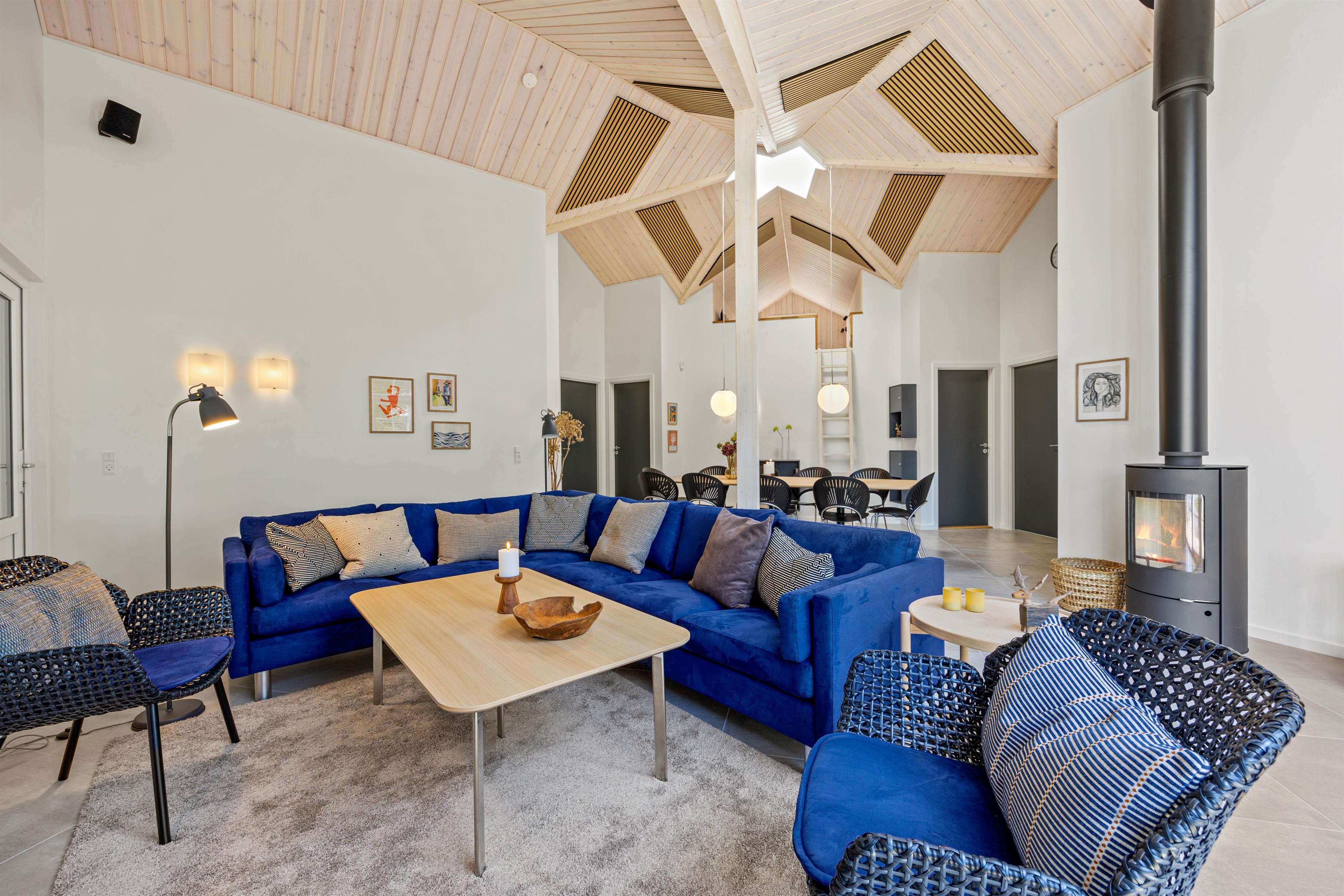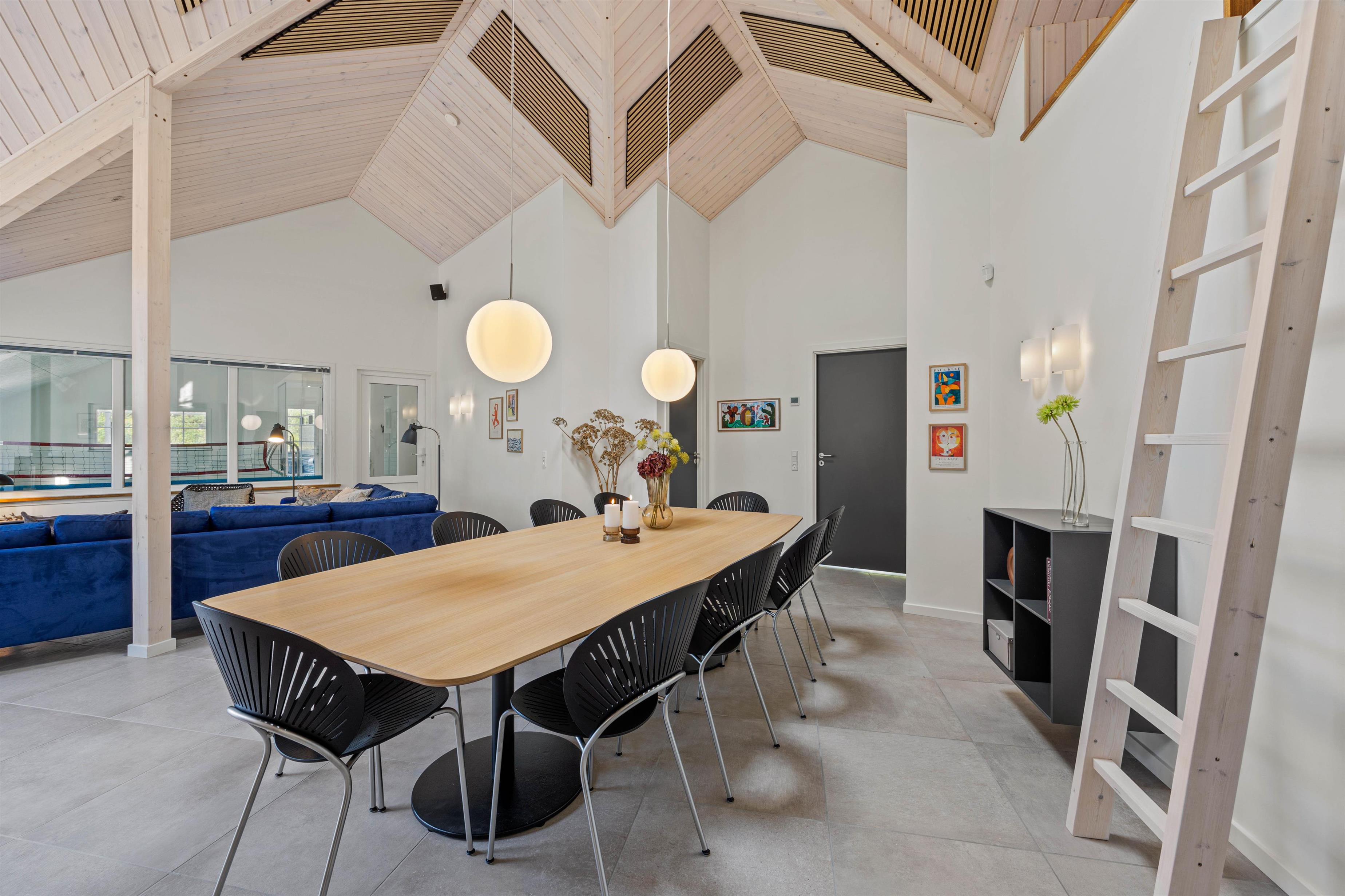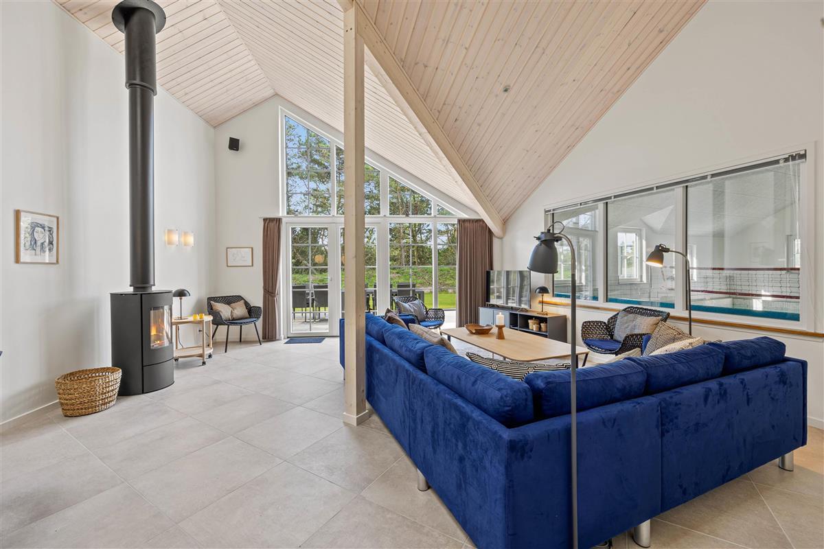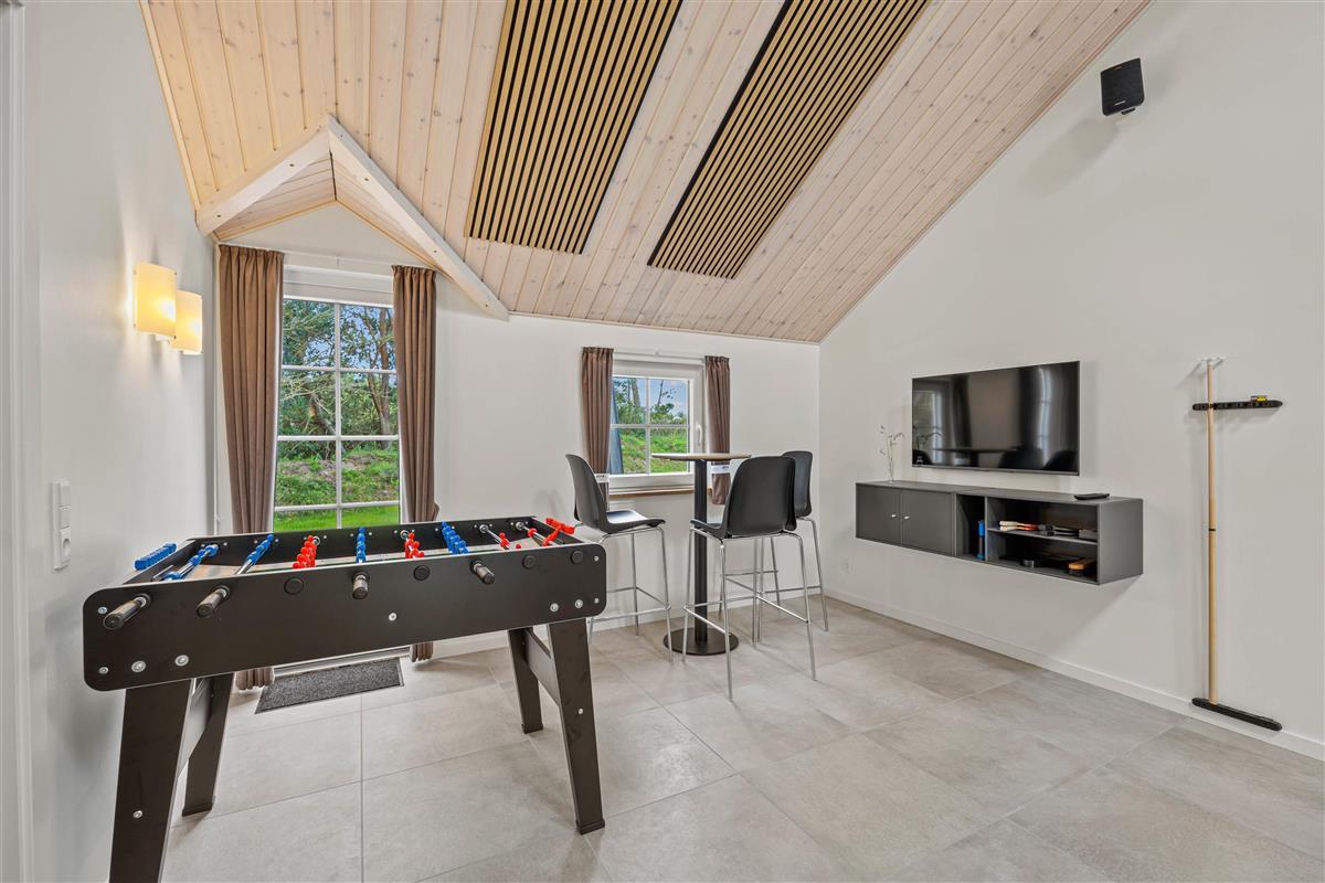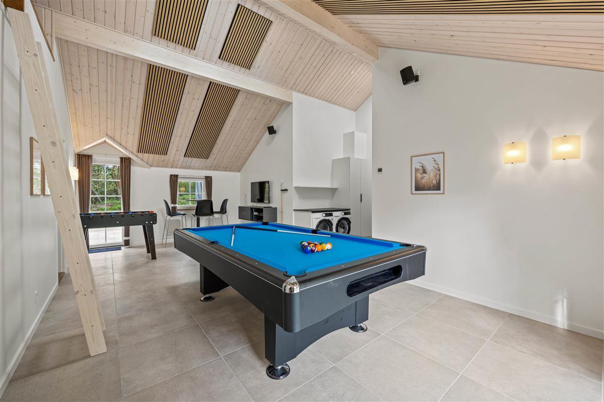 Bright, light-filled rooms with high ceilings welcome you upon entering the holiday home at Pouls Bjerge 6. The spacious open-plan area combining kitchen, dining space and living room forms the heart of the house - perfect for spending quality time together. A modern, well-equipped kitchen, games room with pool table and table tennis, and a pool area with steam room ensure an unforgettable holiday experience.