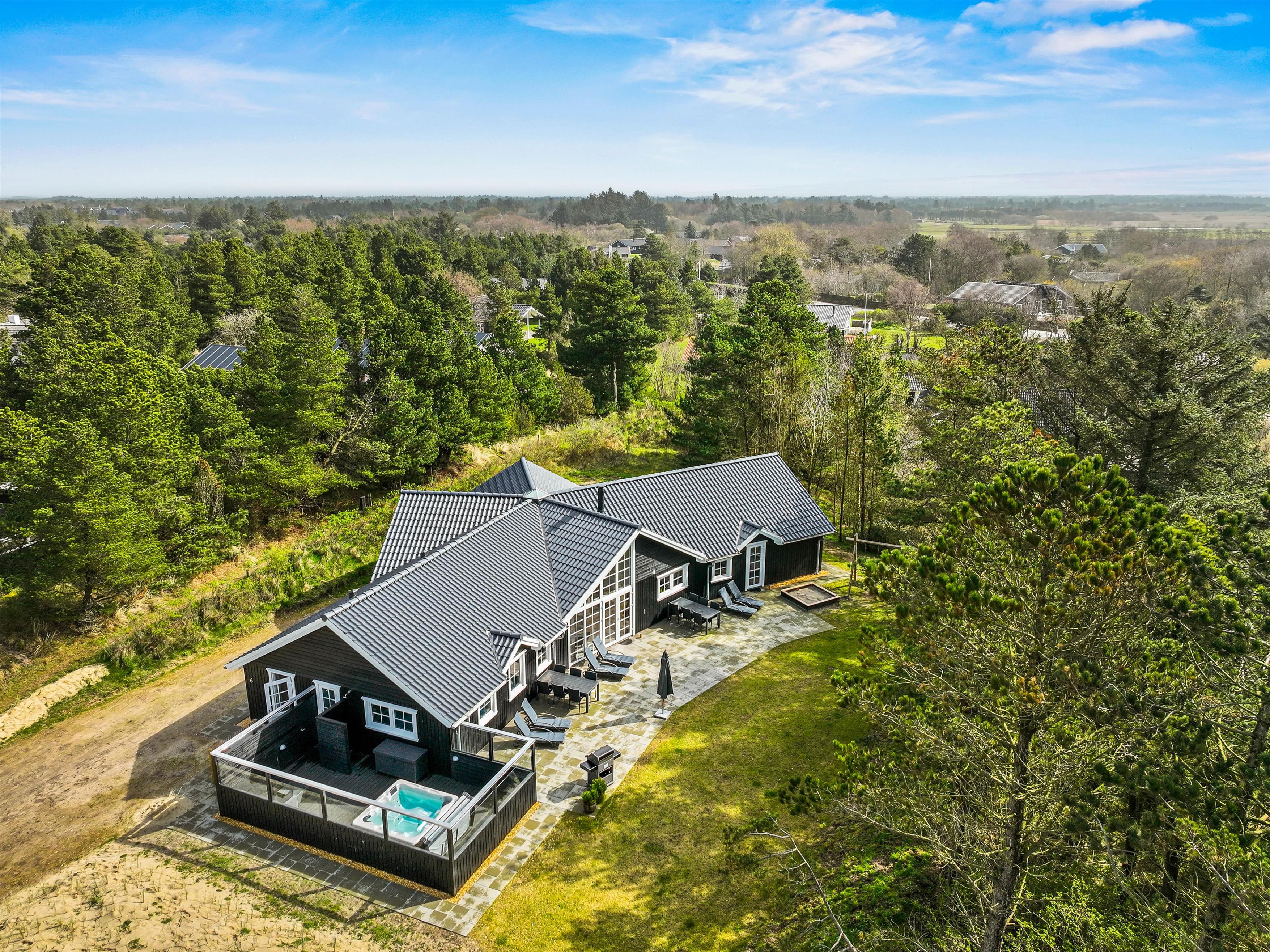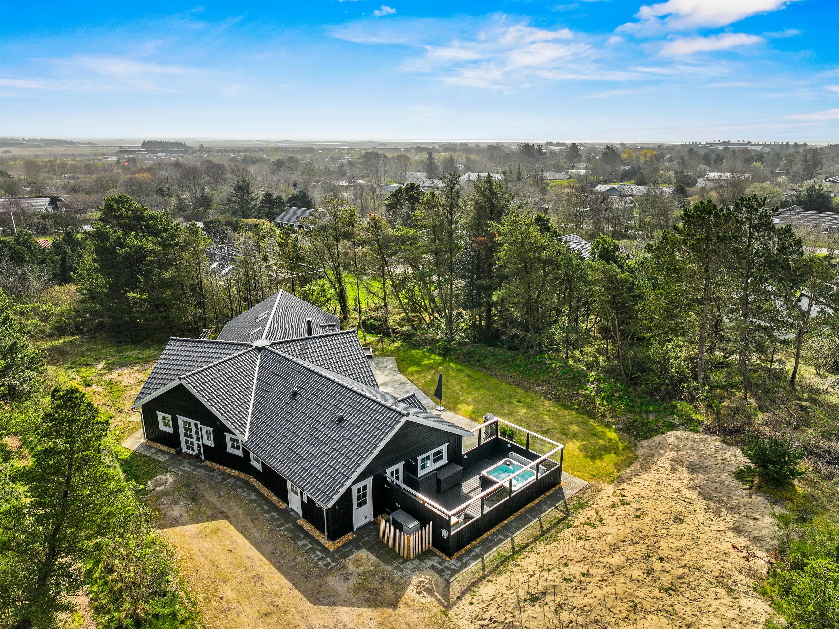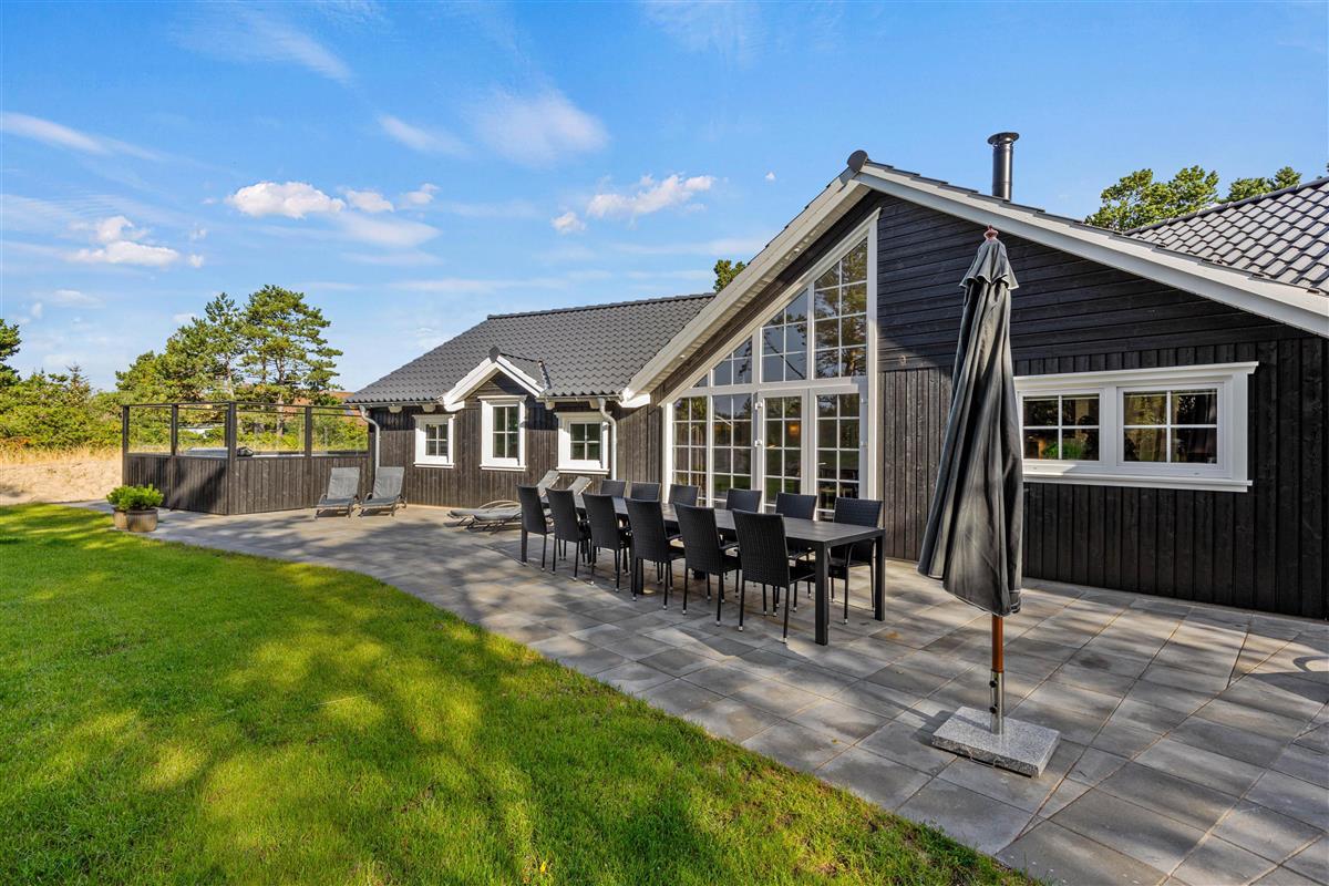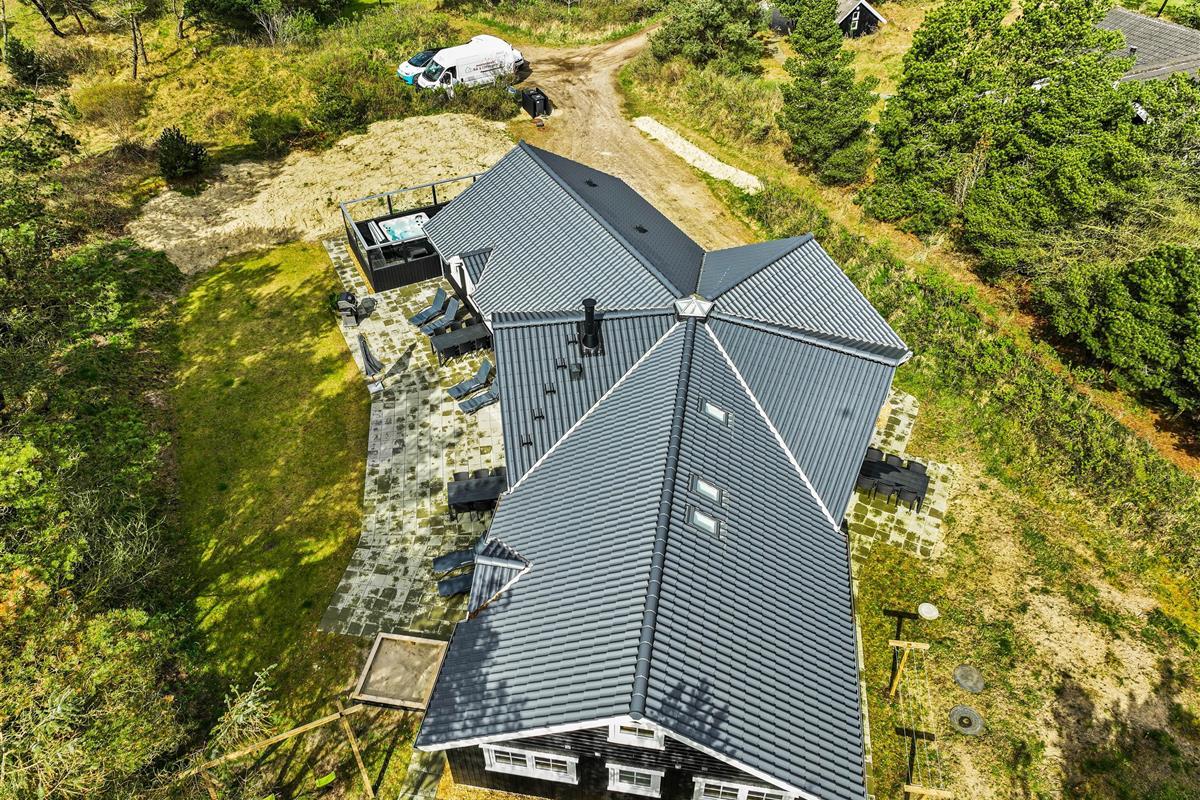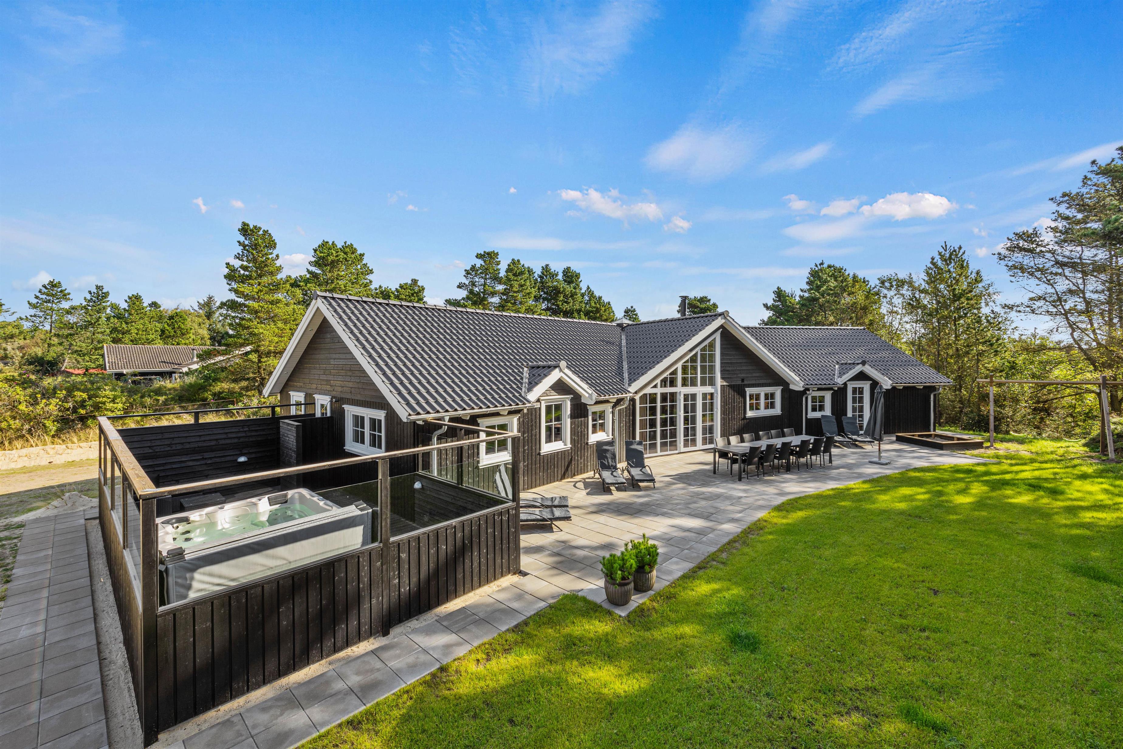 This spacious holiday home, newly built in 2023 in Scandinavian style, is located close to the centre of Blåvand at Pouls Bjerge 6. Perfect for holidays with friends or multiple families, this holiday home offers outstanding features including a steam room, swimming pool, outdoor hot tub, pool table and table tennis. Electric car charging is available on-site for guests arriving in electric vehicles.