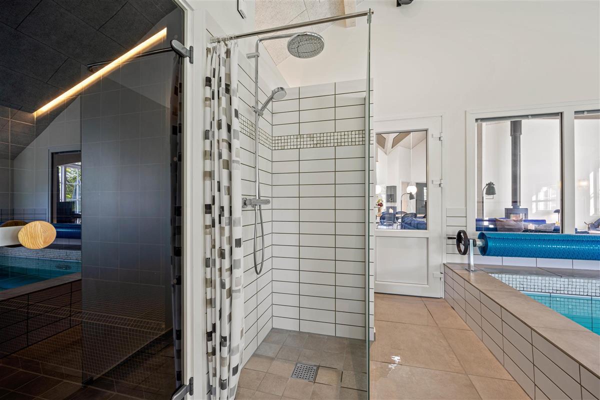 The pool features an automatic chlorine dosing system to minimise chlorine vapours in the air. From the pool room, you can access a fenced terrace with an outdoor hot tub, outdoor shower and lounge sofa. Whether you want to splash about or relax in the water or on the sofa - everything is possible here.