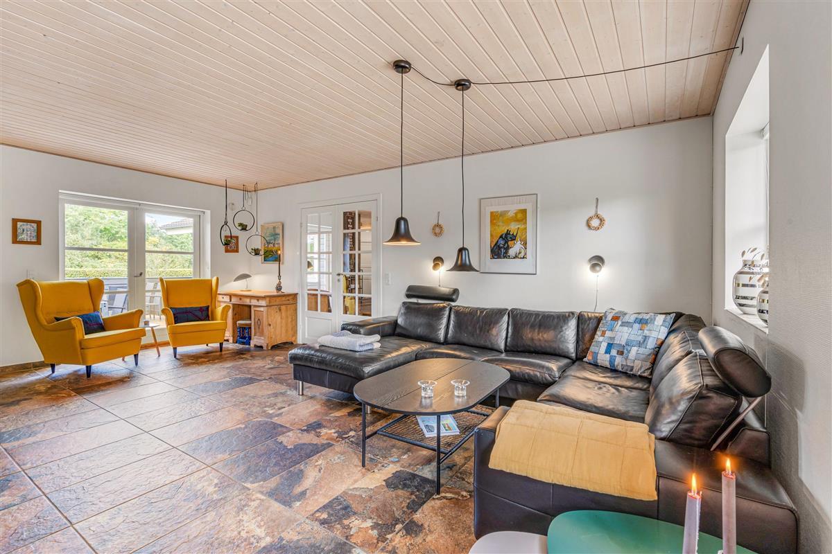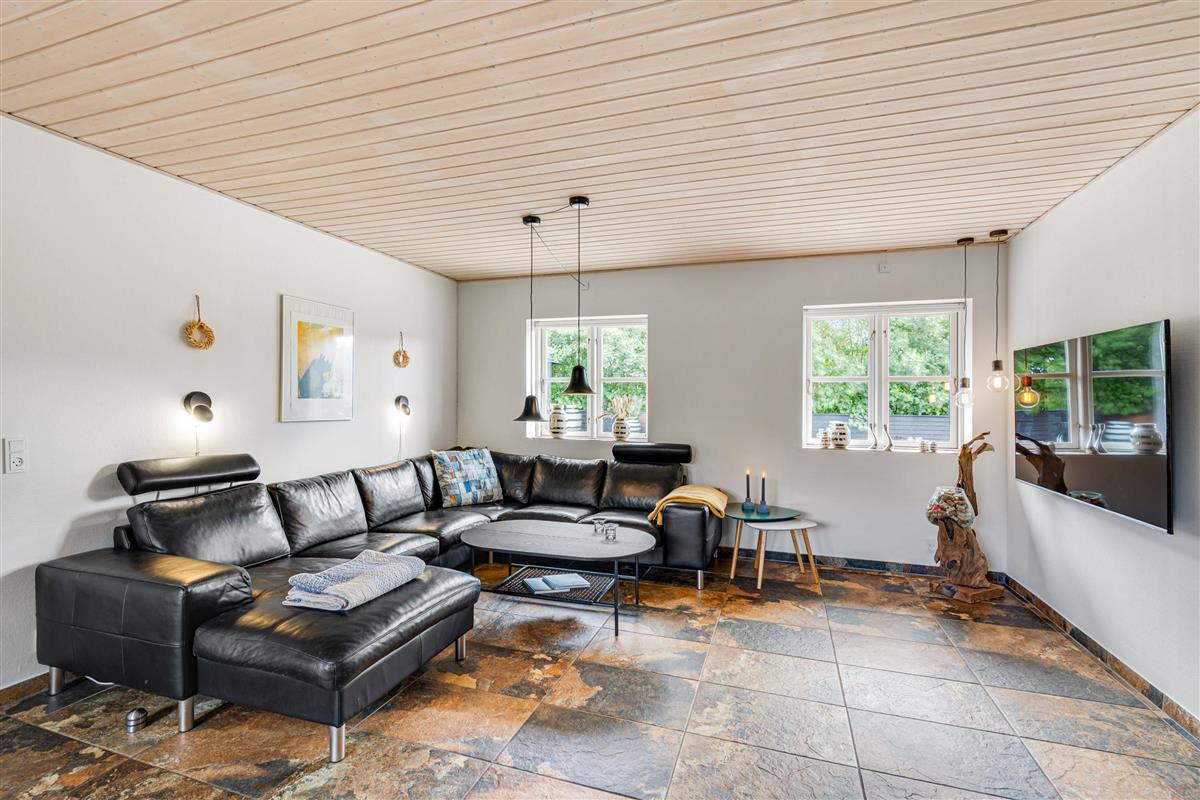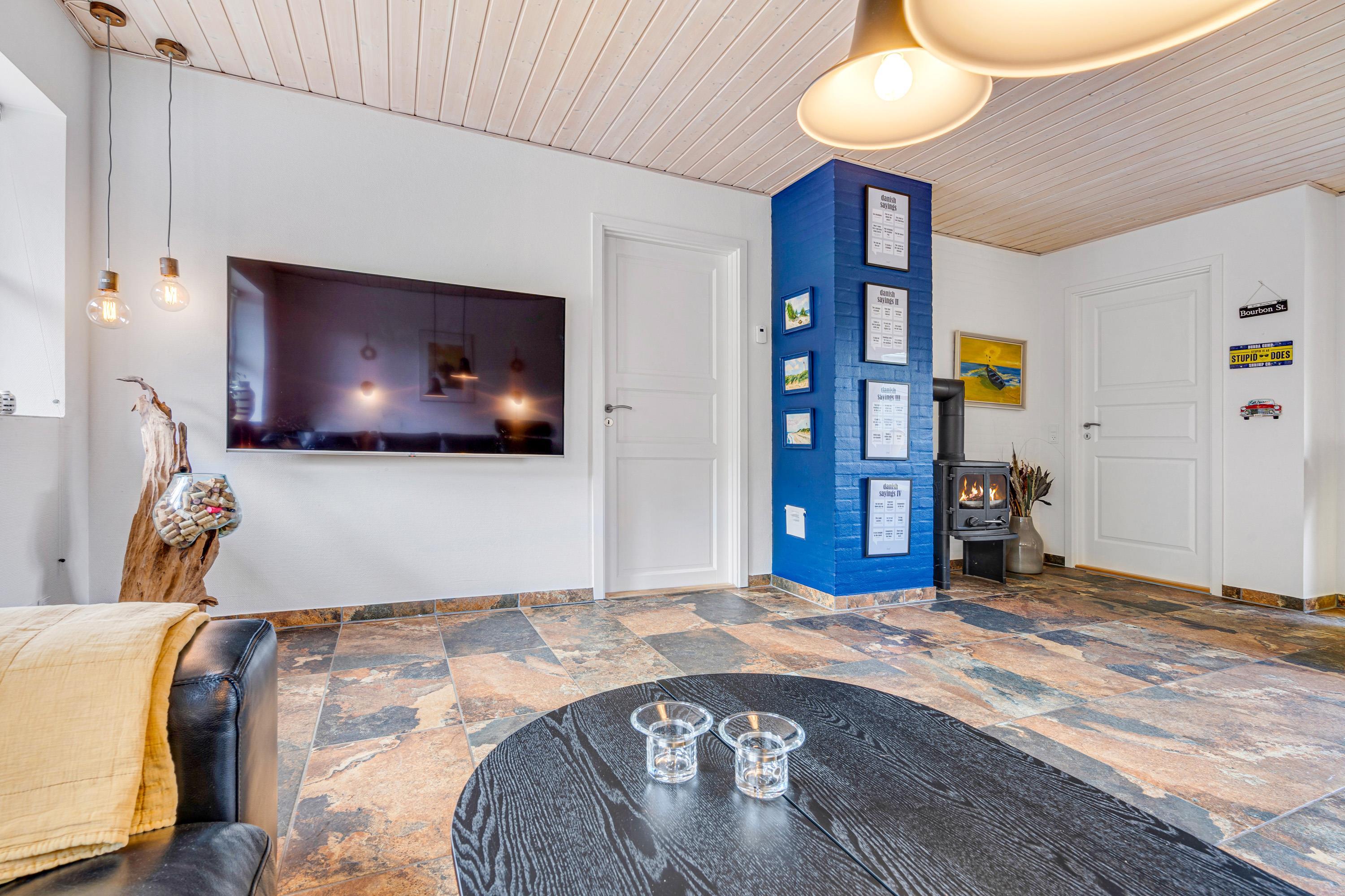 The holiday home at Bytoften 1 is ideal for socialising whilst offering plenty of private space. With five televisions and Chromecast available, there's no need to compromise on entertainment choices. The crackling wood-burning stove adds to the cosy atmosphere in the living room.
