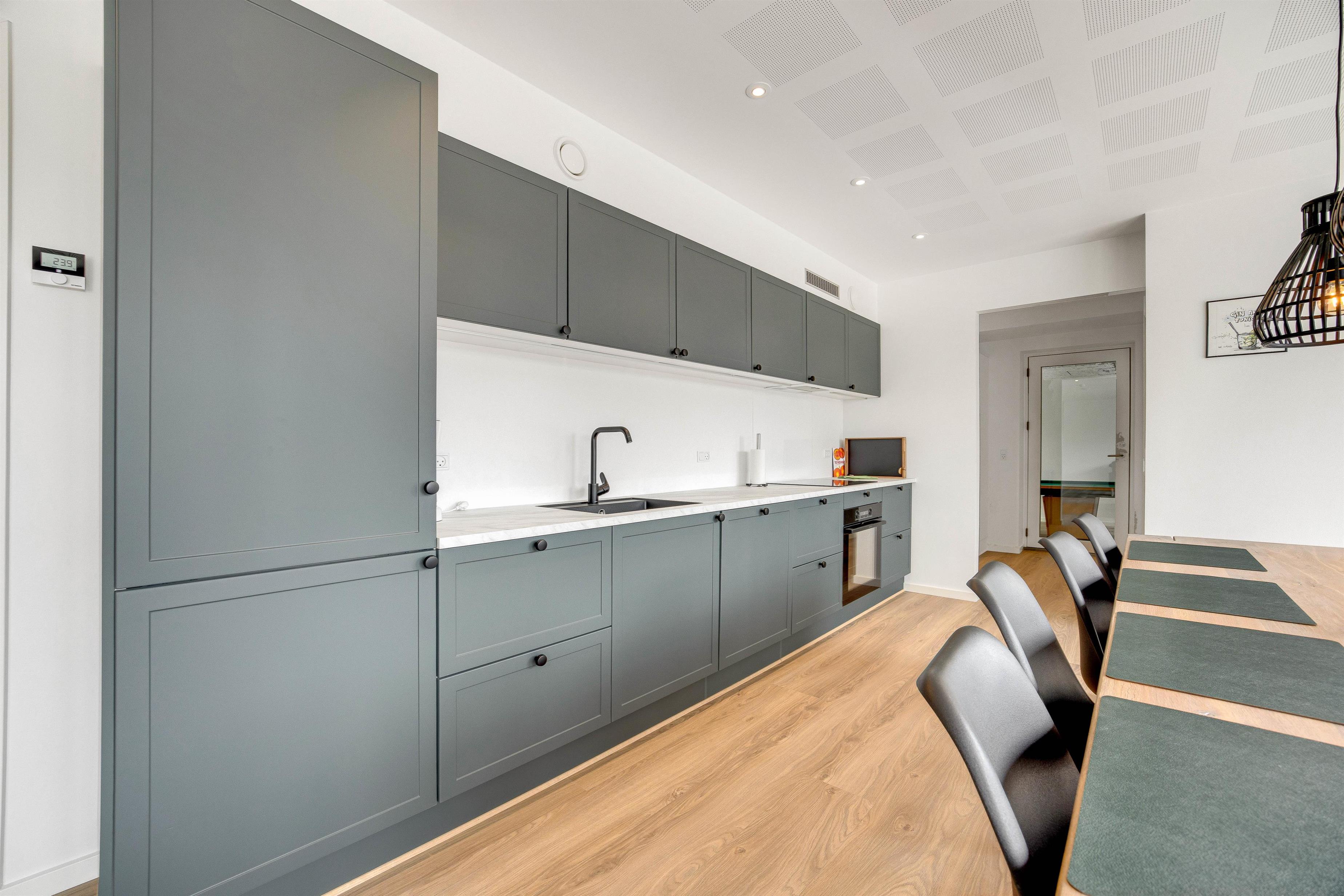 During cooler seasons, the apartment is heated by an energy-efficient heat pump. A dishwasher, washing machine and tumble dryer are also provided.