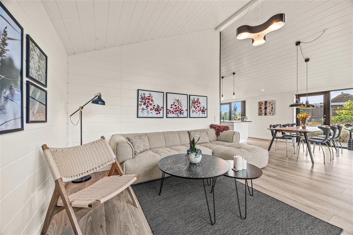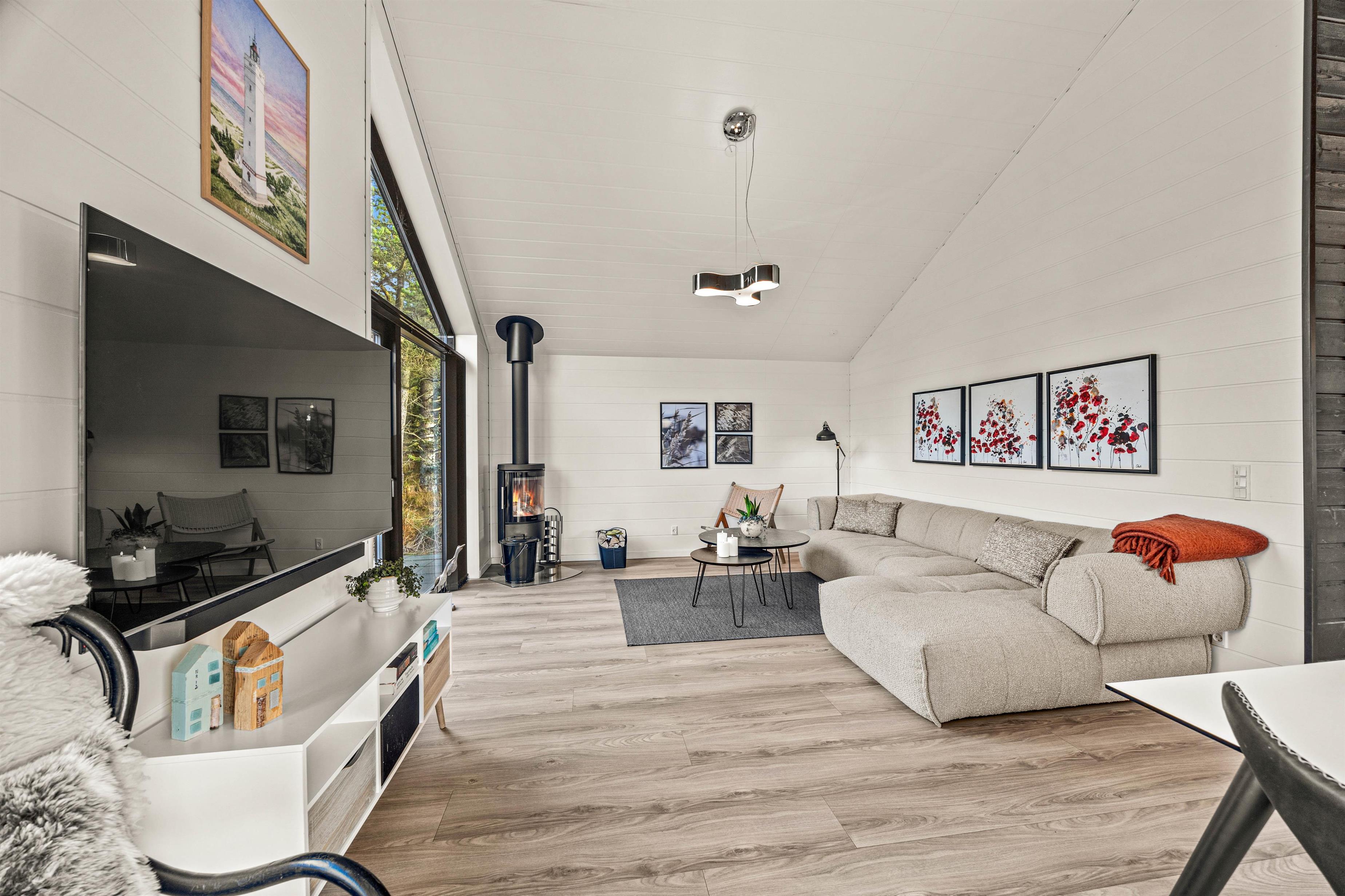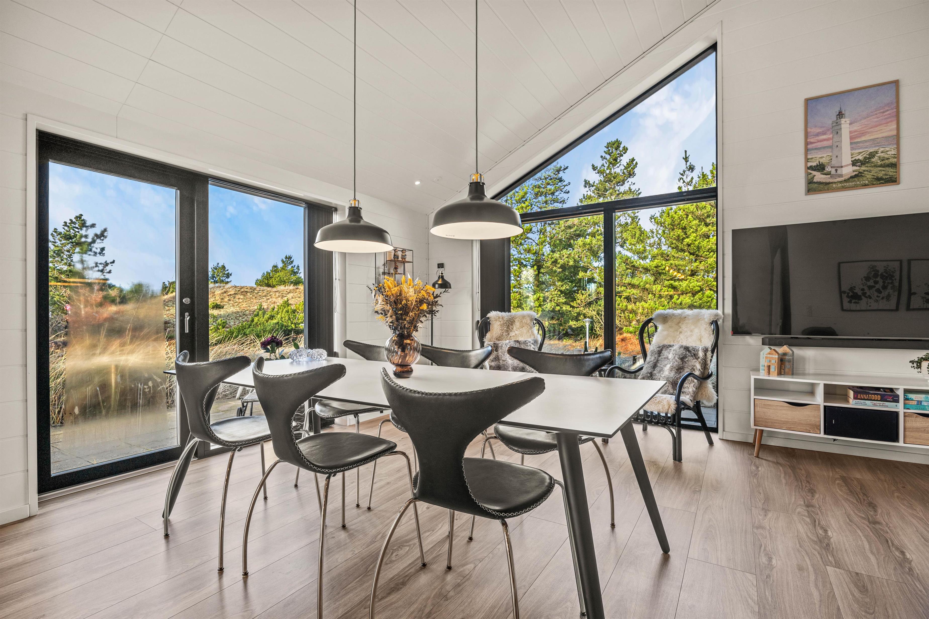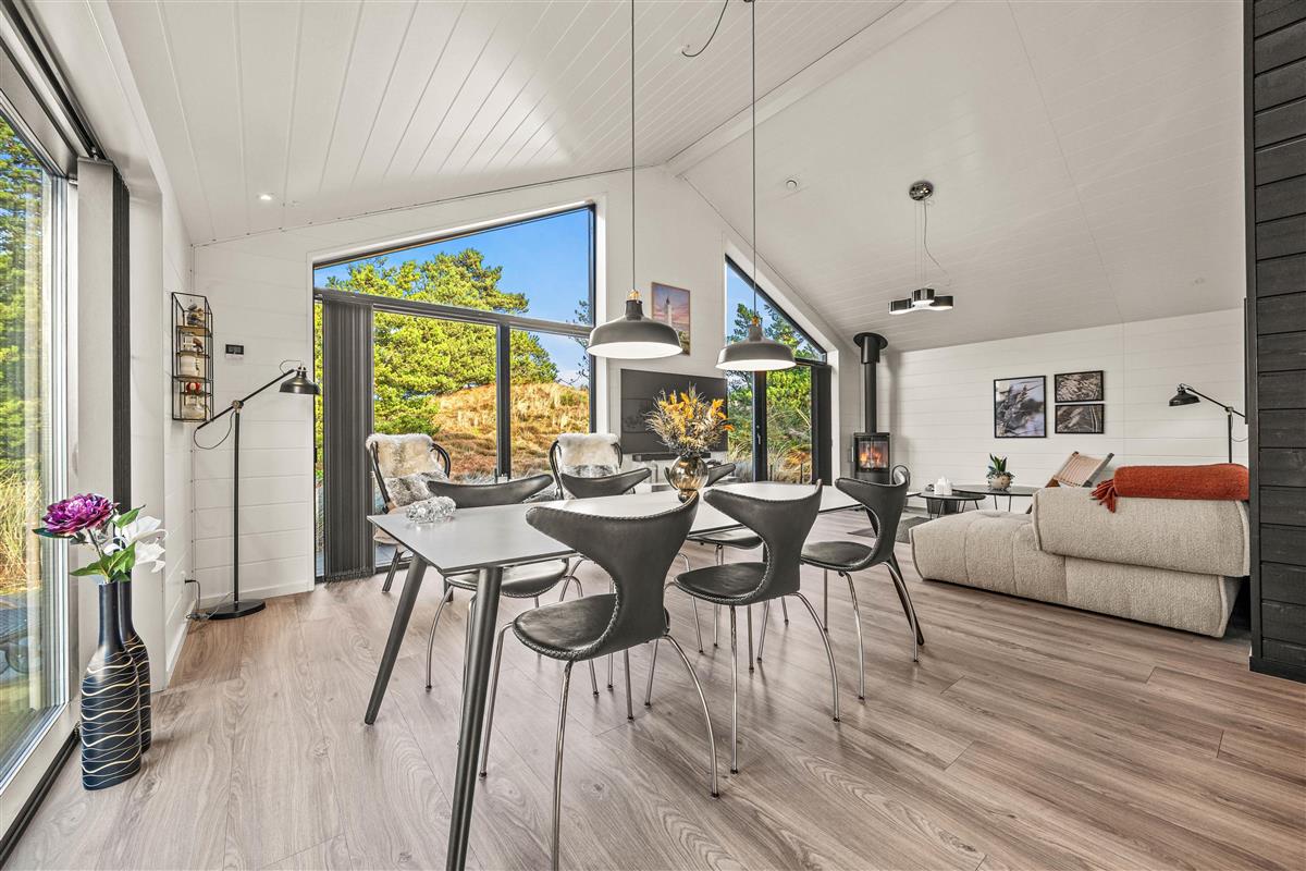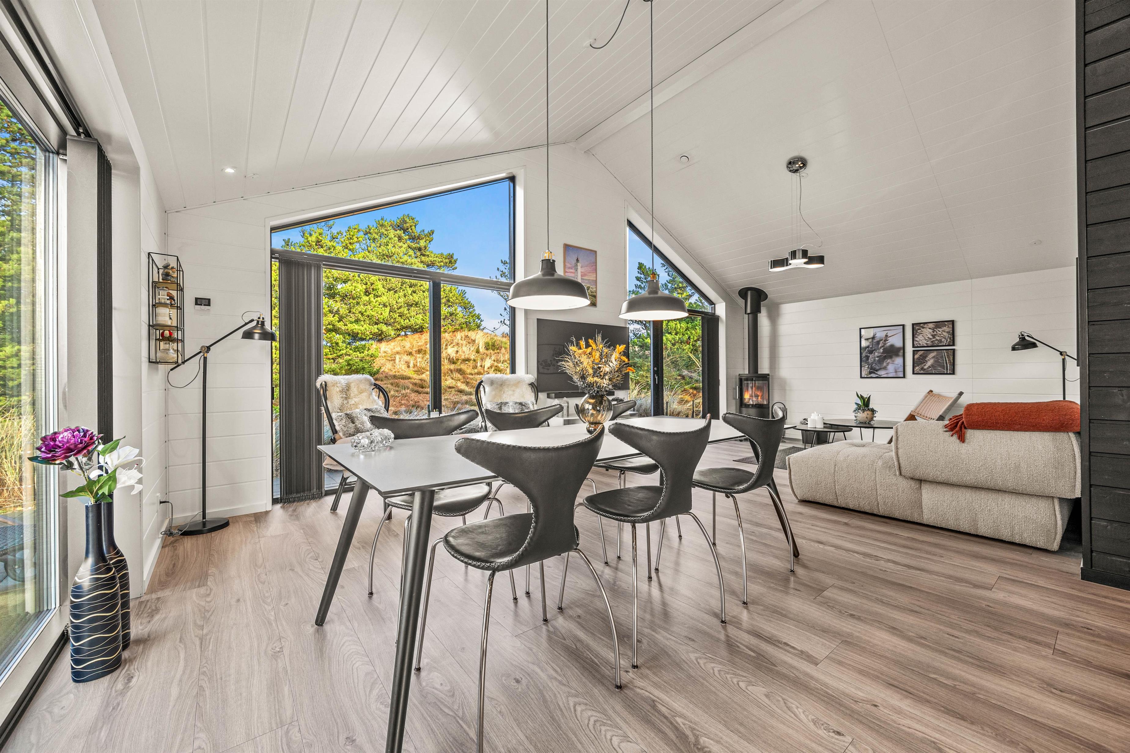 You'll be impressed by the bright spaces as soon as you enter. The kitchen flows into an open-plan dining and living area. Large windows flood the living area with natural light, enhanced by raised, sloping ceilings. A wood-burning stove creates a cosy holiday atmosphere. The holiday home showcases excellent attention to detail in its interior design.