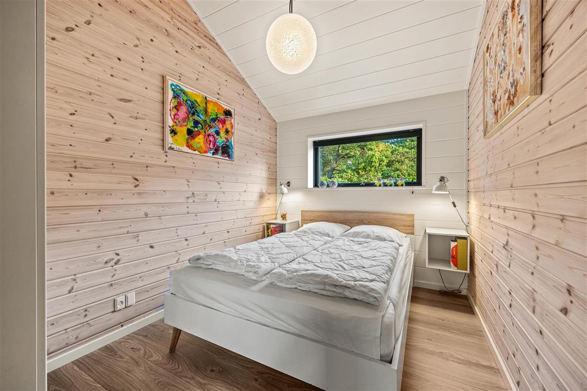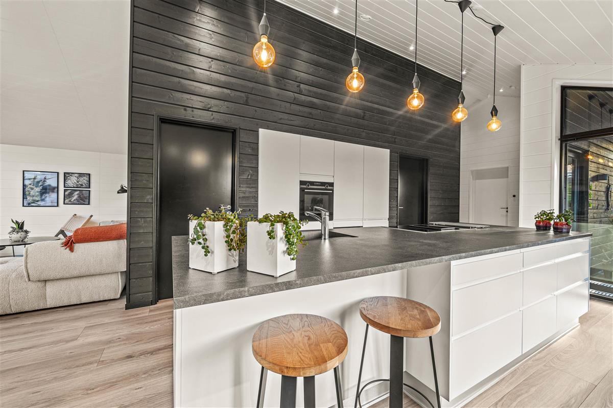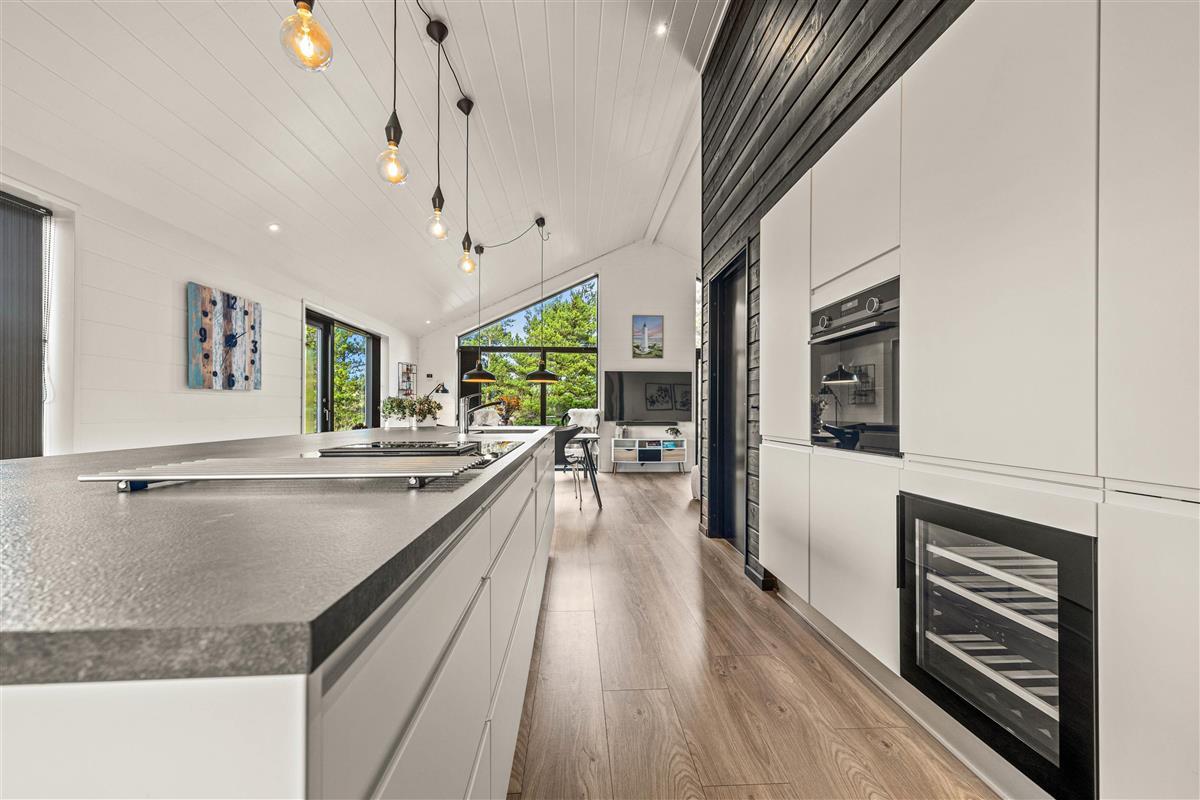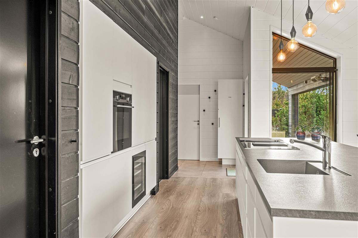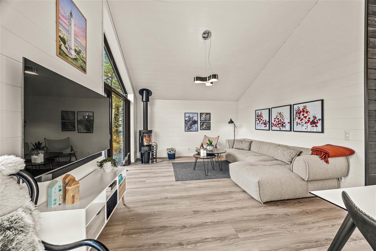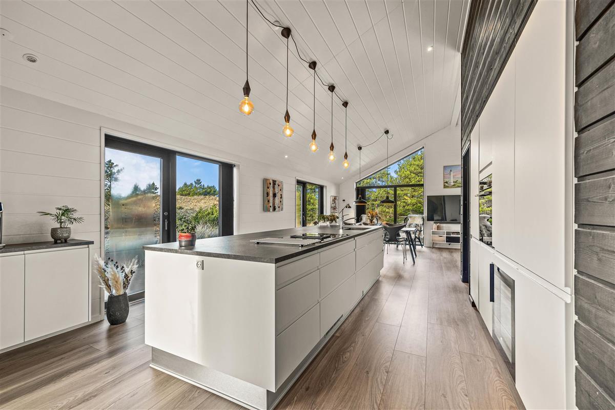 You'll be impressed by the bright spaces as soon as you enter. The kitchen flows into an open-plan dining and living area. Large windows flood the living area with natural light, enhanced by raised, sloping ceilings. A wood-burning stove creates a cosy holiday atmosphere. The holiday home showcases excellent attention to detail in its interior design.