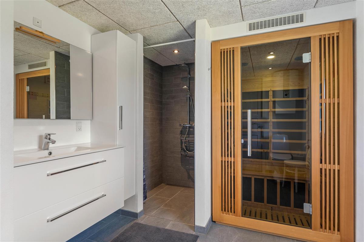 The atmosphere becomes particularly cosy when the fireplace is lit or when you heat up the sauna for deep relaxation. The bathroom is not only spacious enough for all guests – it also features the added luxury of underfloor heating, ensuring comfort even barefoot.