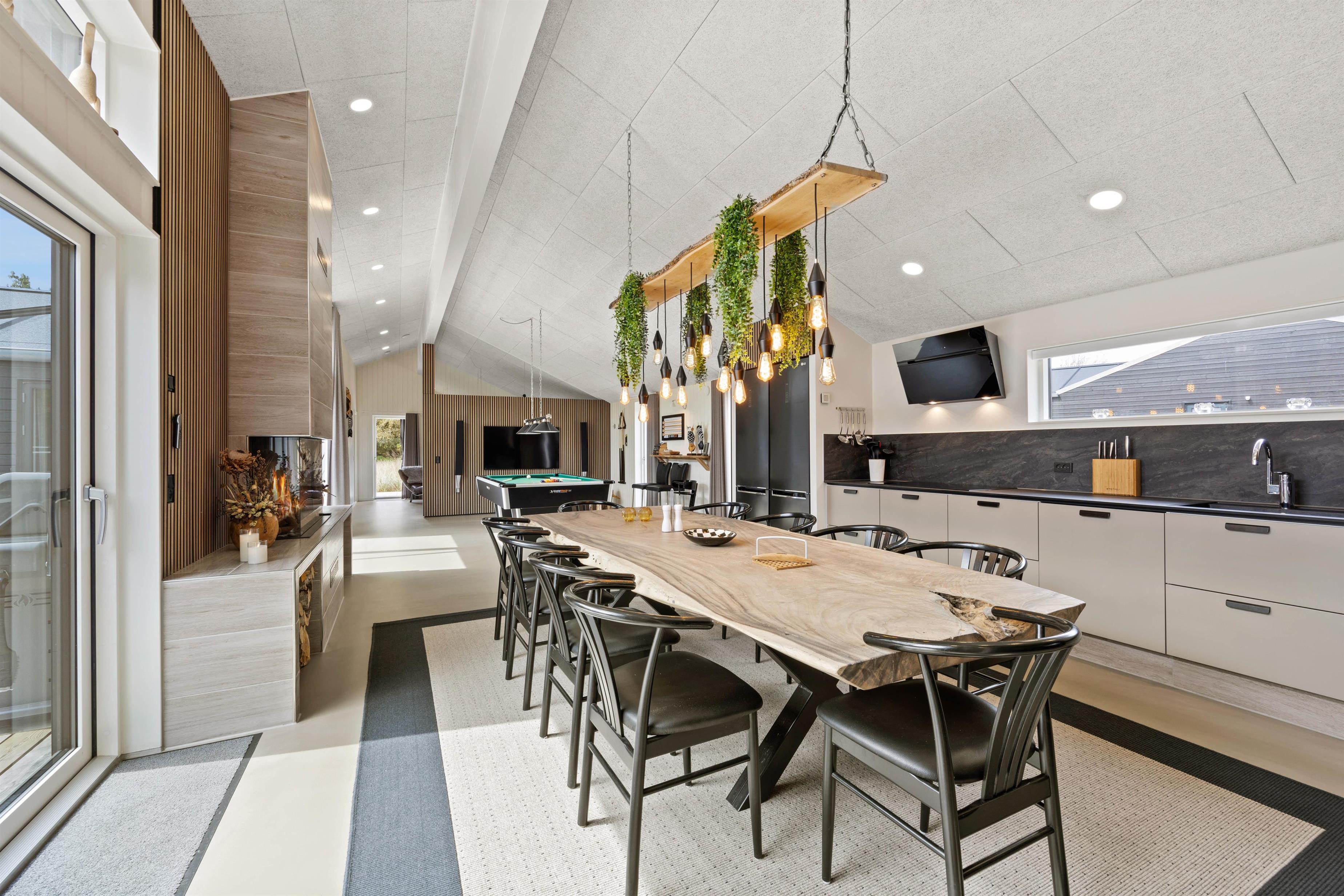At the front, you'll find the modern kitchen equipped with high-quality appliances and a large dining table. Everything needed for cooking and preparing delicious meals together is provided. While dining, you can enjoy views of the gas fireplace, which creates a cosy atmosphere.