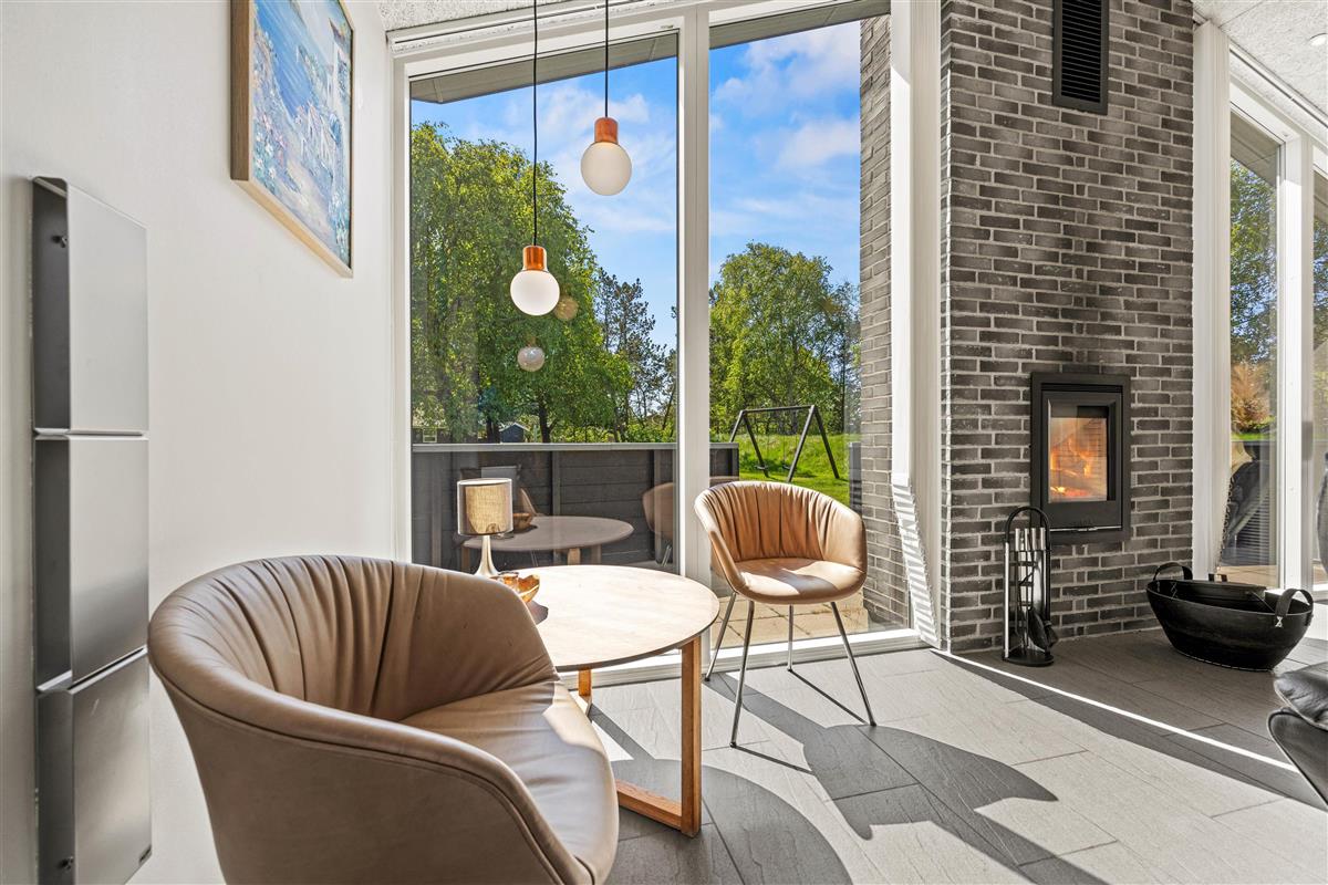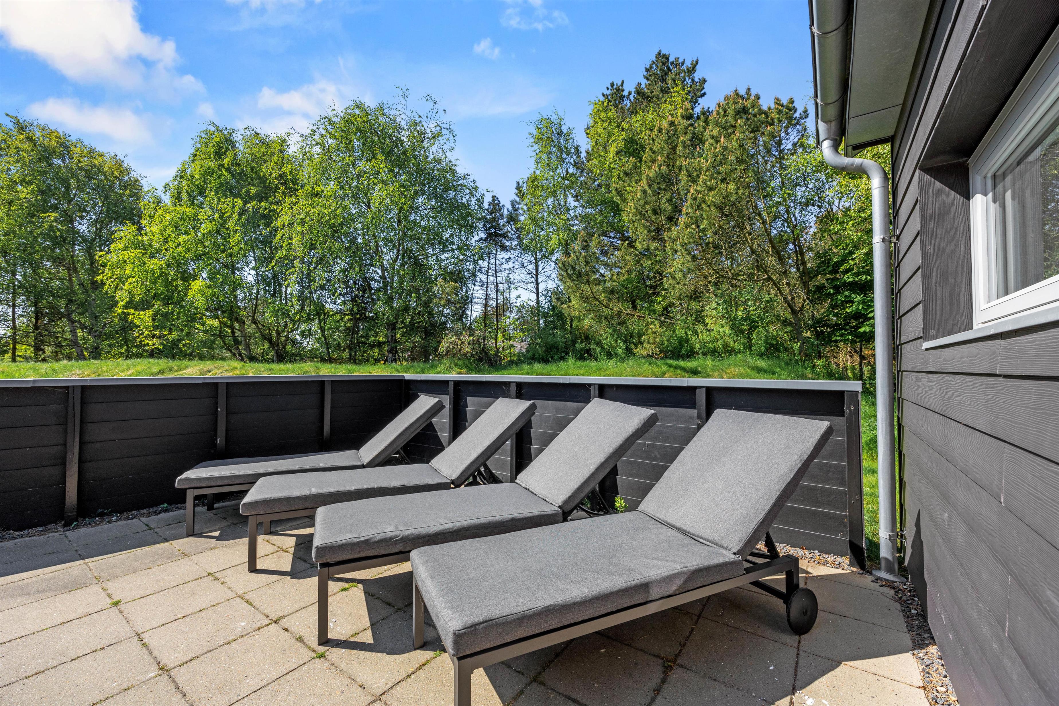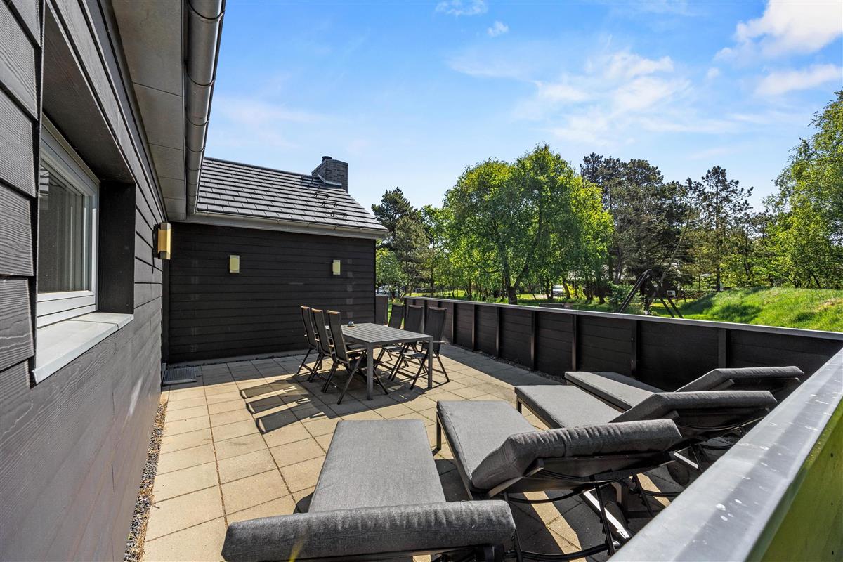 The living room leads to a large, open yet sheltered terrace, well-equipped with garden furniture, sun loungers and a barbecue. On sunny days, you can move your entire living space outdoors.