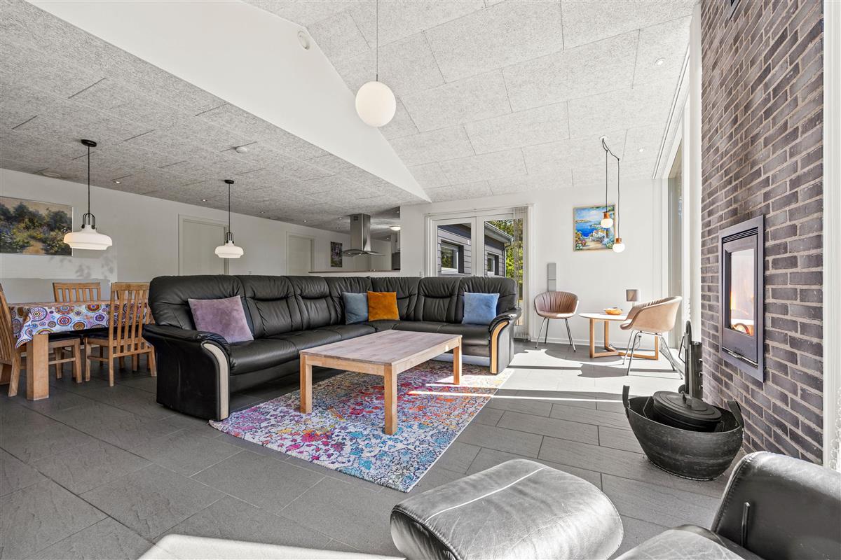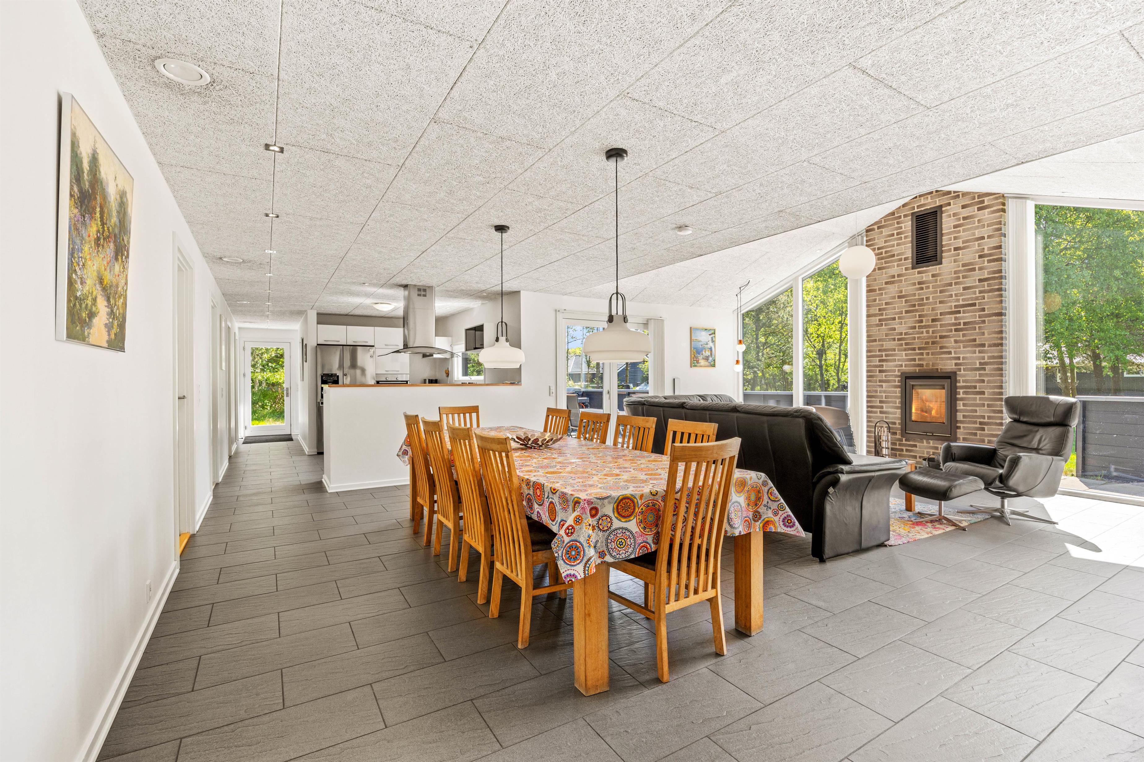 The kitchen opens onto the living room and a large dining area where everyone can gather for meals together. A wood-burning stove provides cosy warmth on cooler evenings, while the energy-efficient heat pump ensures comfortable temperatures throughout.