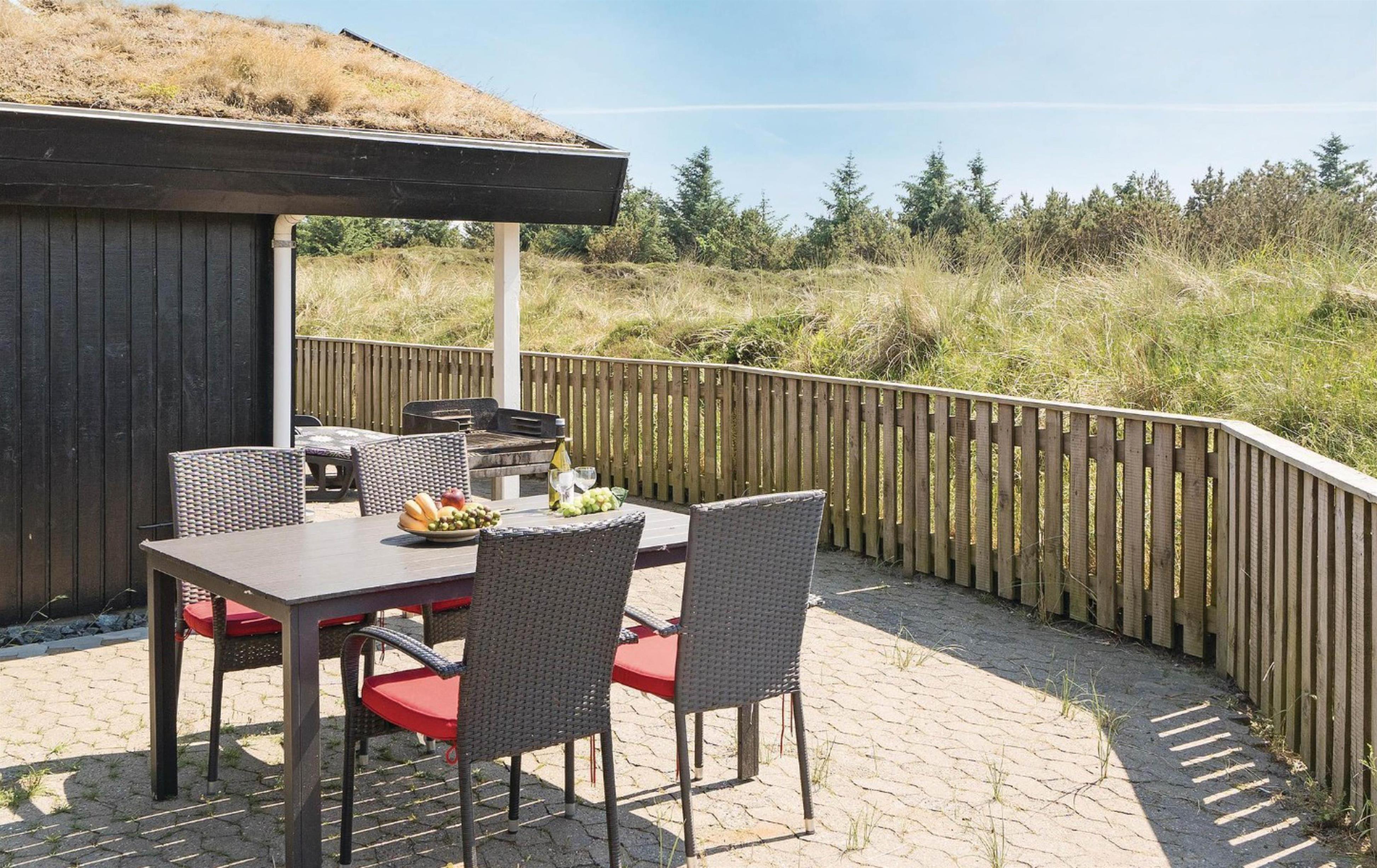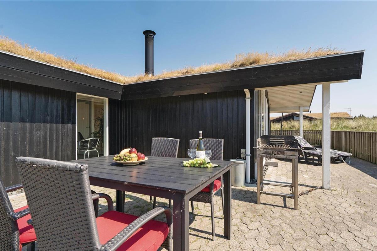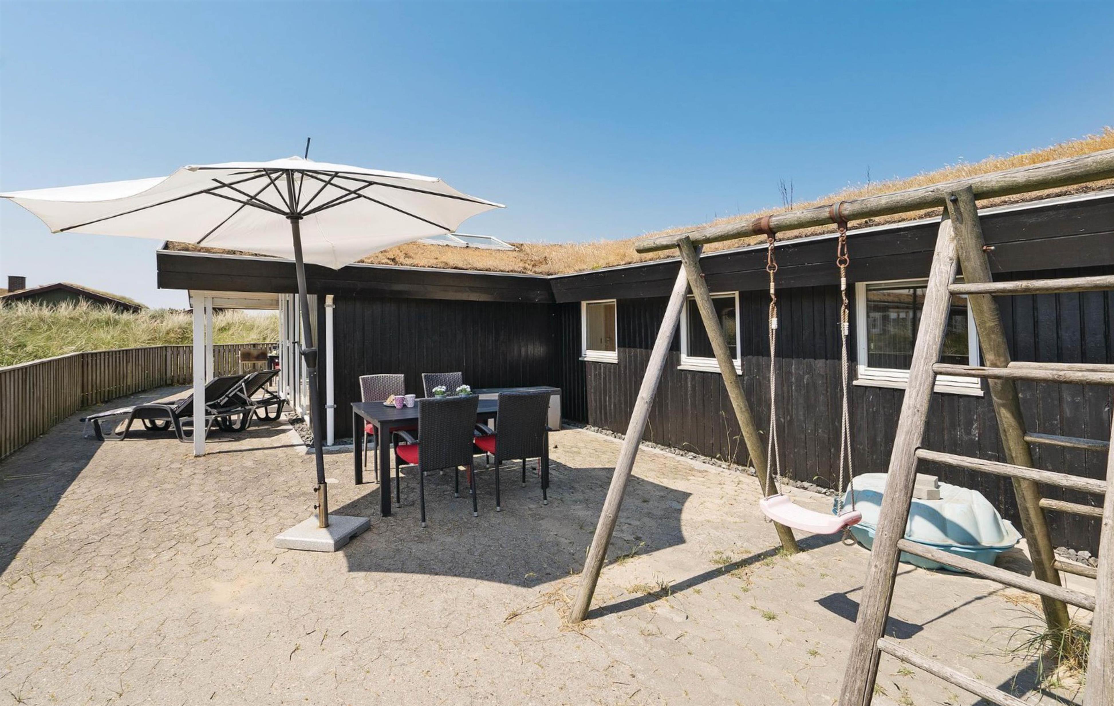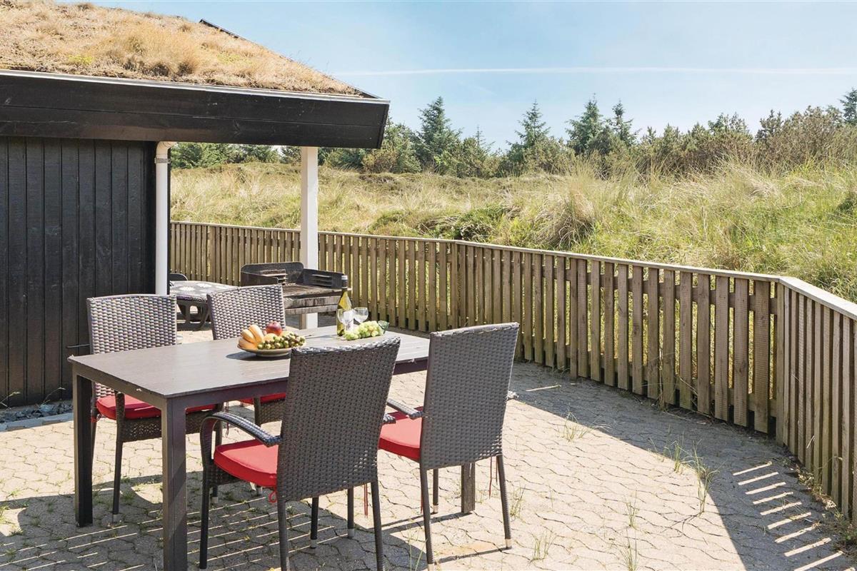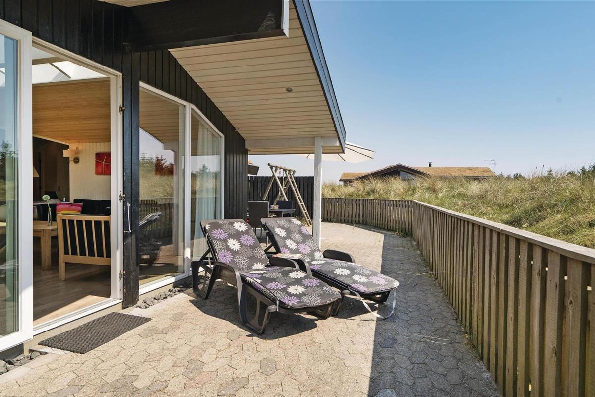 The holiday home is situated in a quiet holiday area, surrounded by West Jutland's beautiful countryside. To the northwest, there's a lovely tiled terrace where you can spend hours enjoying the sunshine and balmy summer evenings with a barbecue. Settle down with a good book on the garden furniture, let the children play and the dogs run free - perfect holiday relaxation. For little ones, there's a small sandpit and swing.