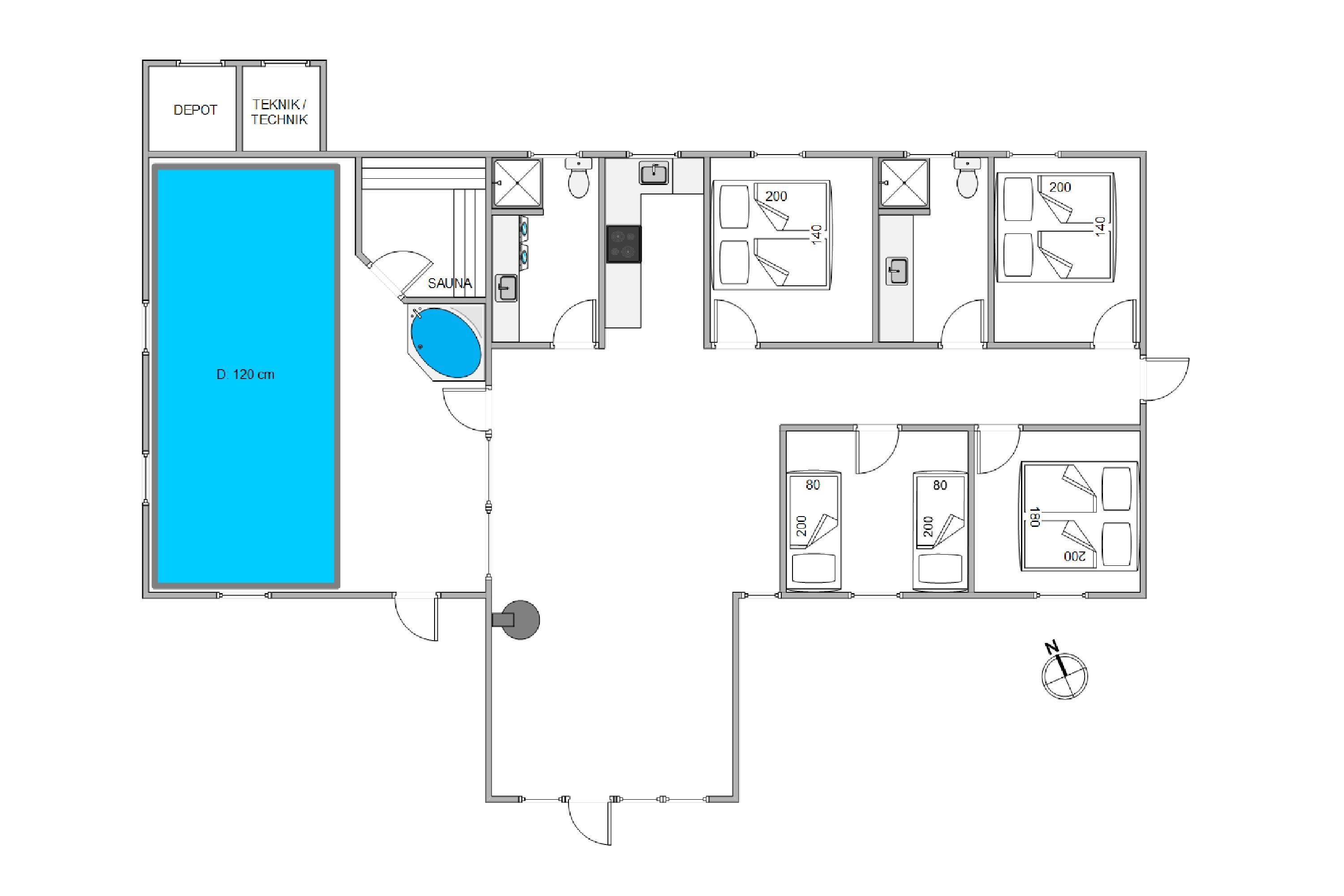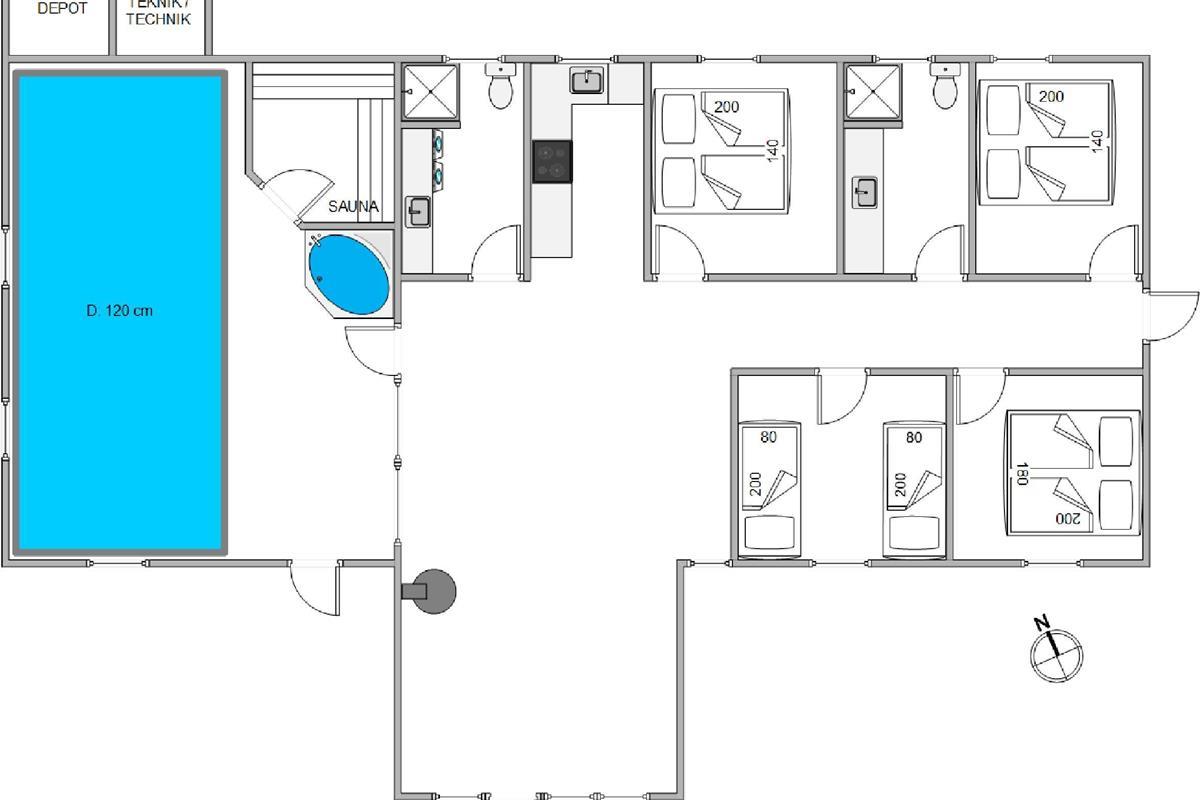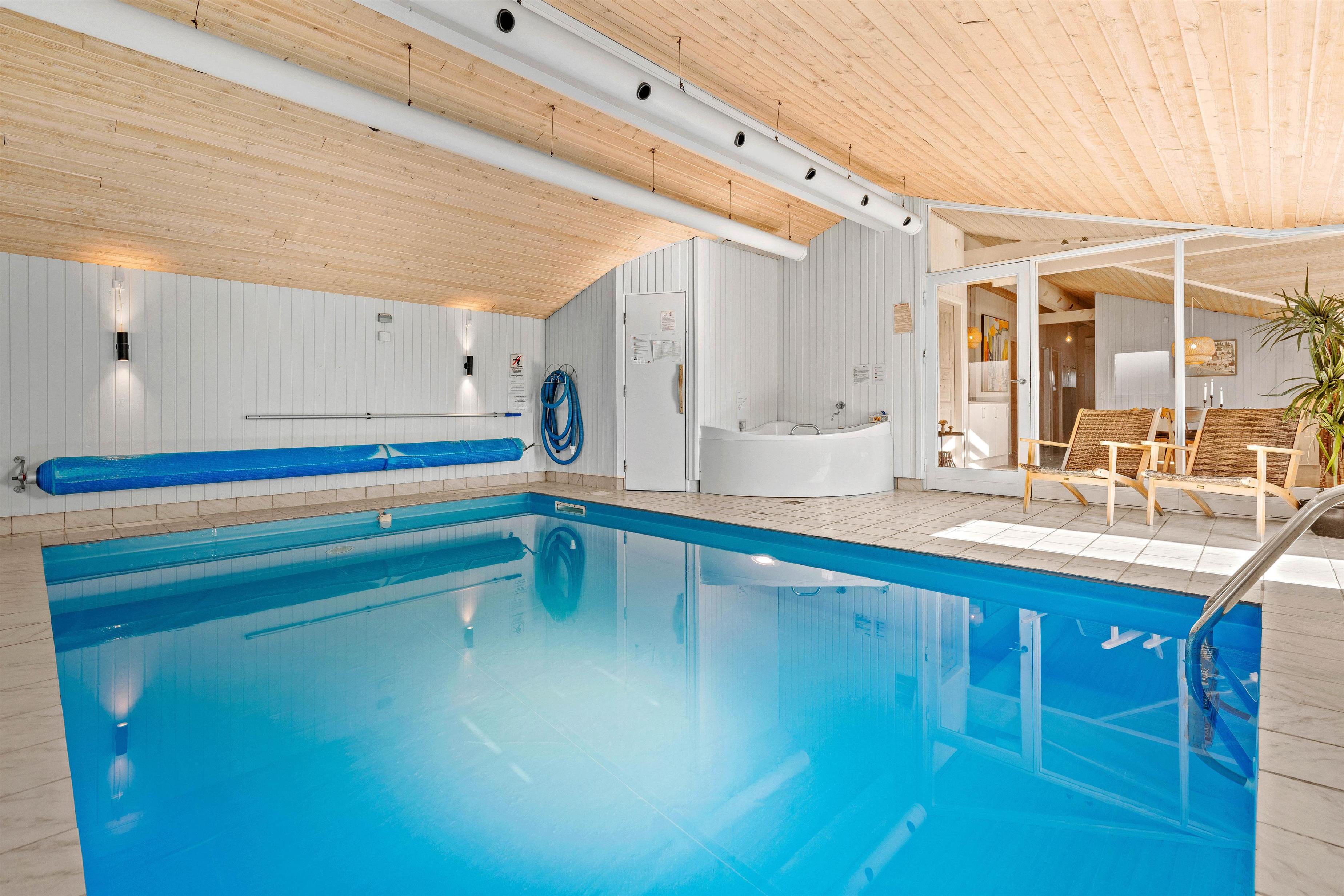 Welcome to this beautiful holiday home in Sydslugen 19, a bright and spacious 165-square-metre holiday home where you can spend many enjoyable hours in the pool room. It's almost like having your own small wellness centre. The 15-square-metre pool is large enough for water games. The house also features a large whirlpool and sauna - ensuring both adults and children will be thoroughly entertained. There's plenty to do even on rainy days.