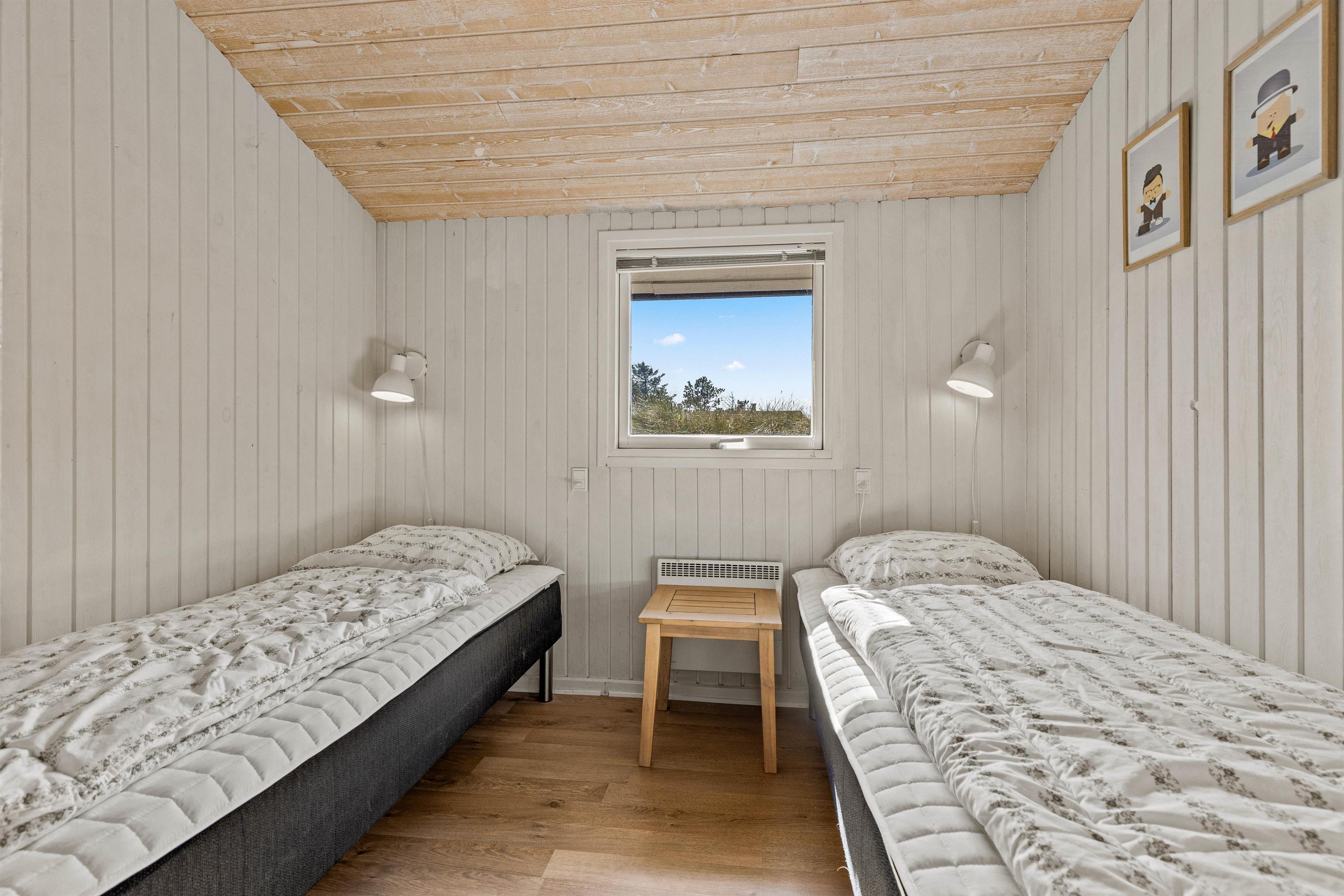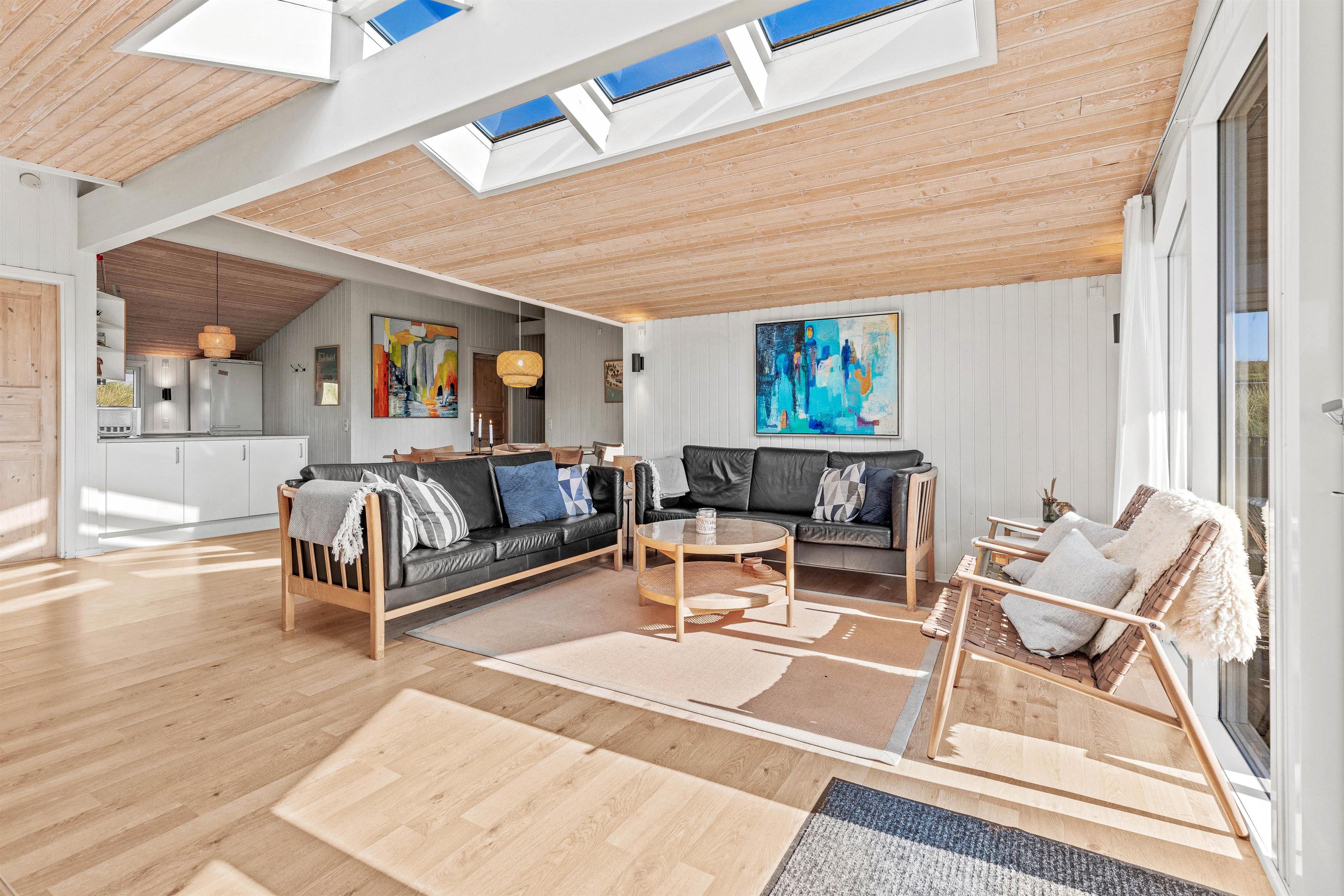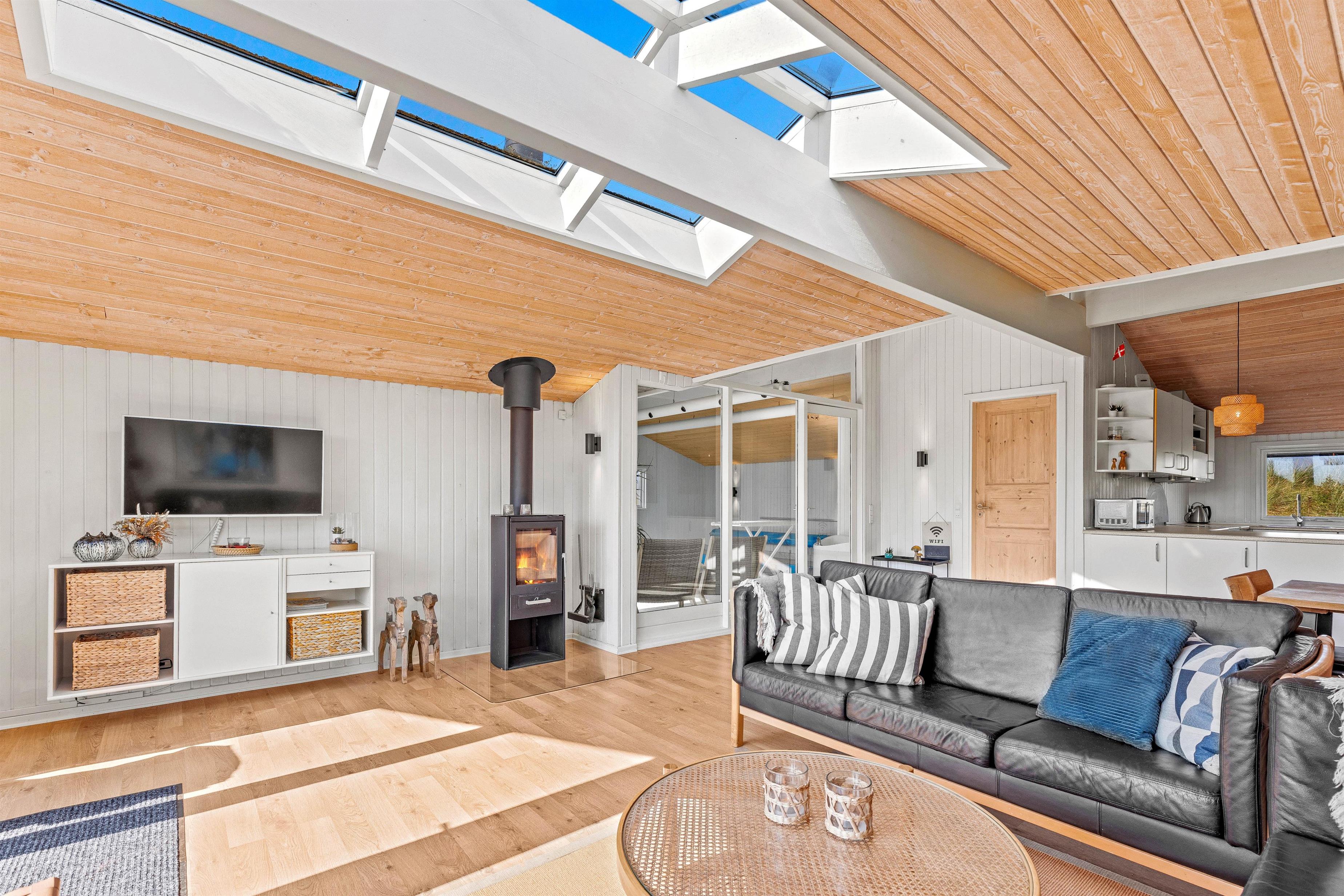 A lovely feature of the living room is its large skylights, flooding the space with natural light. The two bathrooms, complete with underfloor heating, are conveniently located near the bedrooms. All bathrooms and bedrooms are situated at one end of the holiday home. One bedroom has a double bed (180x200cm), two rooms have double beds (140x200cm), while the fourth features 2 single beds (2x80x200cm). This holiday home is truly designed for families.