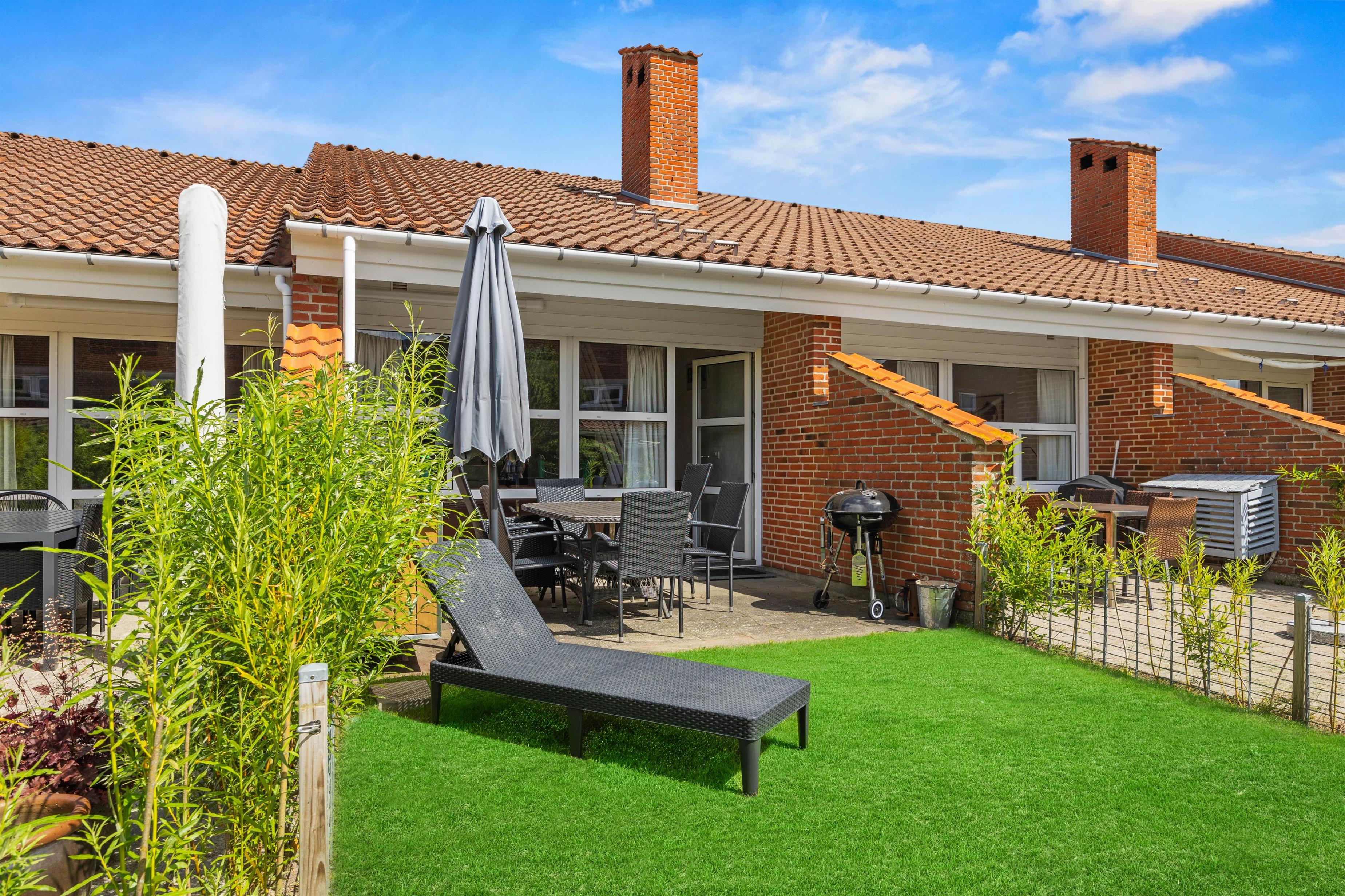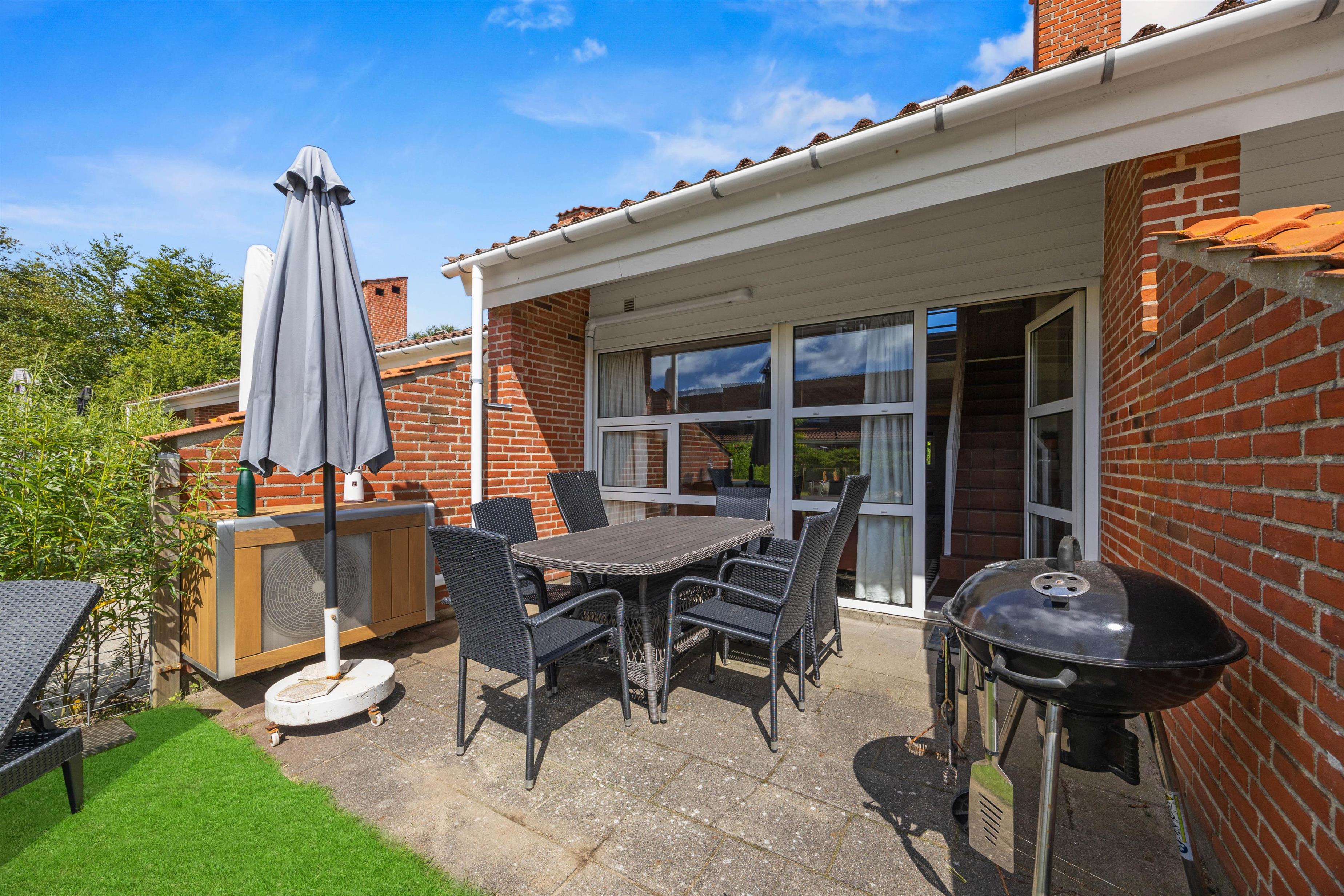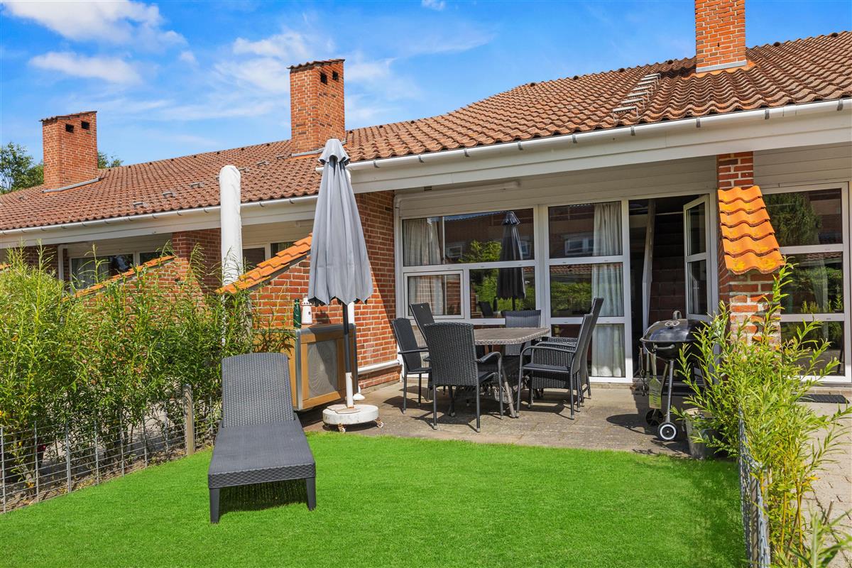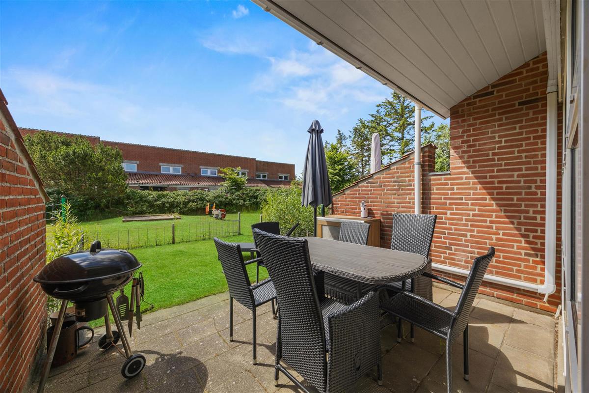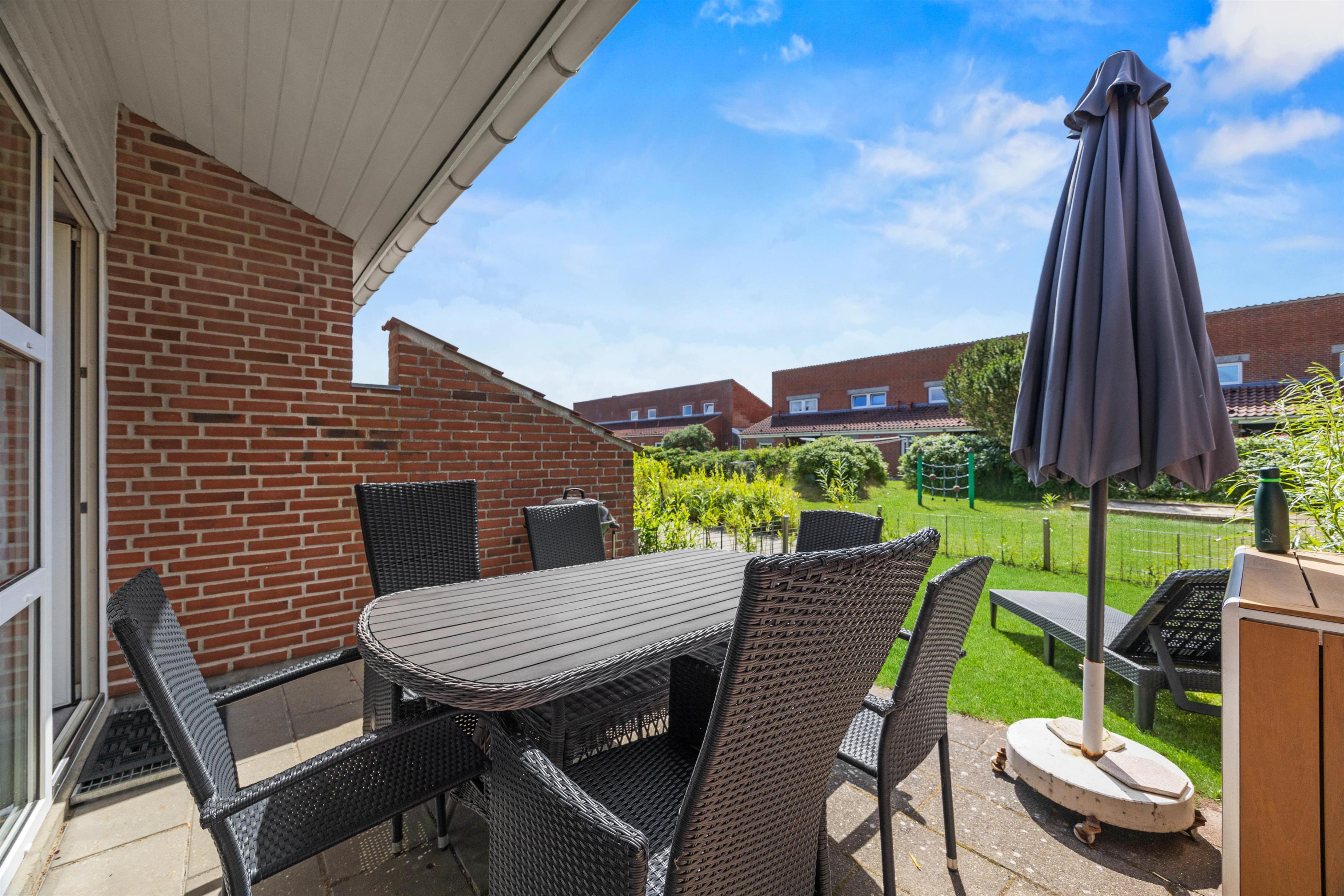The living room opens onto the holiday apartment's terrace. There is a screen between the neighbours, and the small garden is enclosed by a wire fence in the hedge. Garden furniture is also provided so you can enjoy the Danish summer.