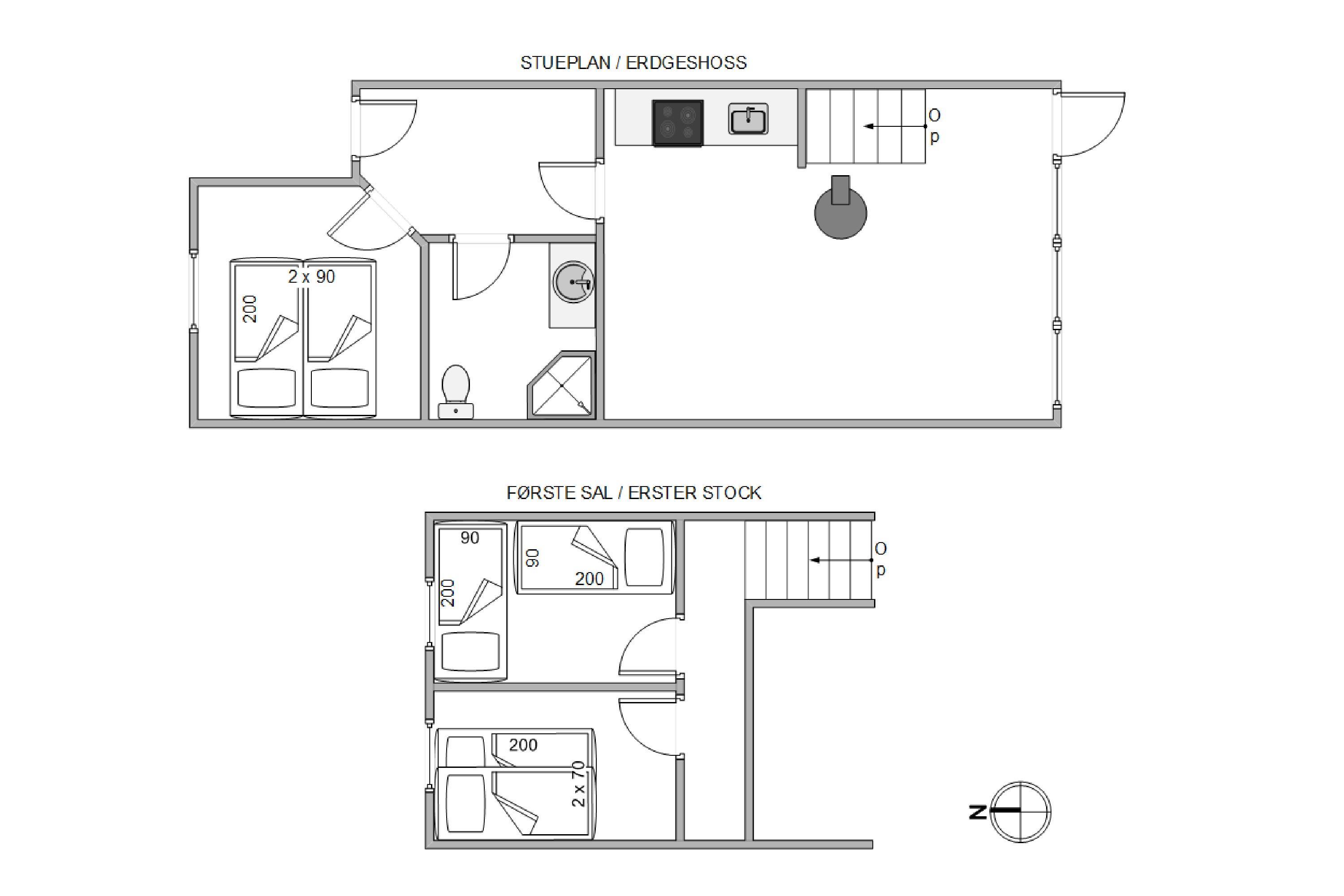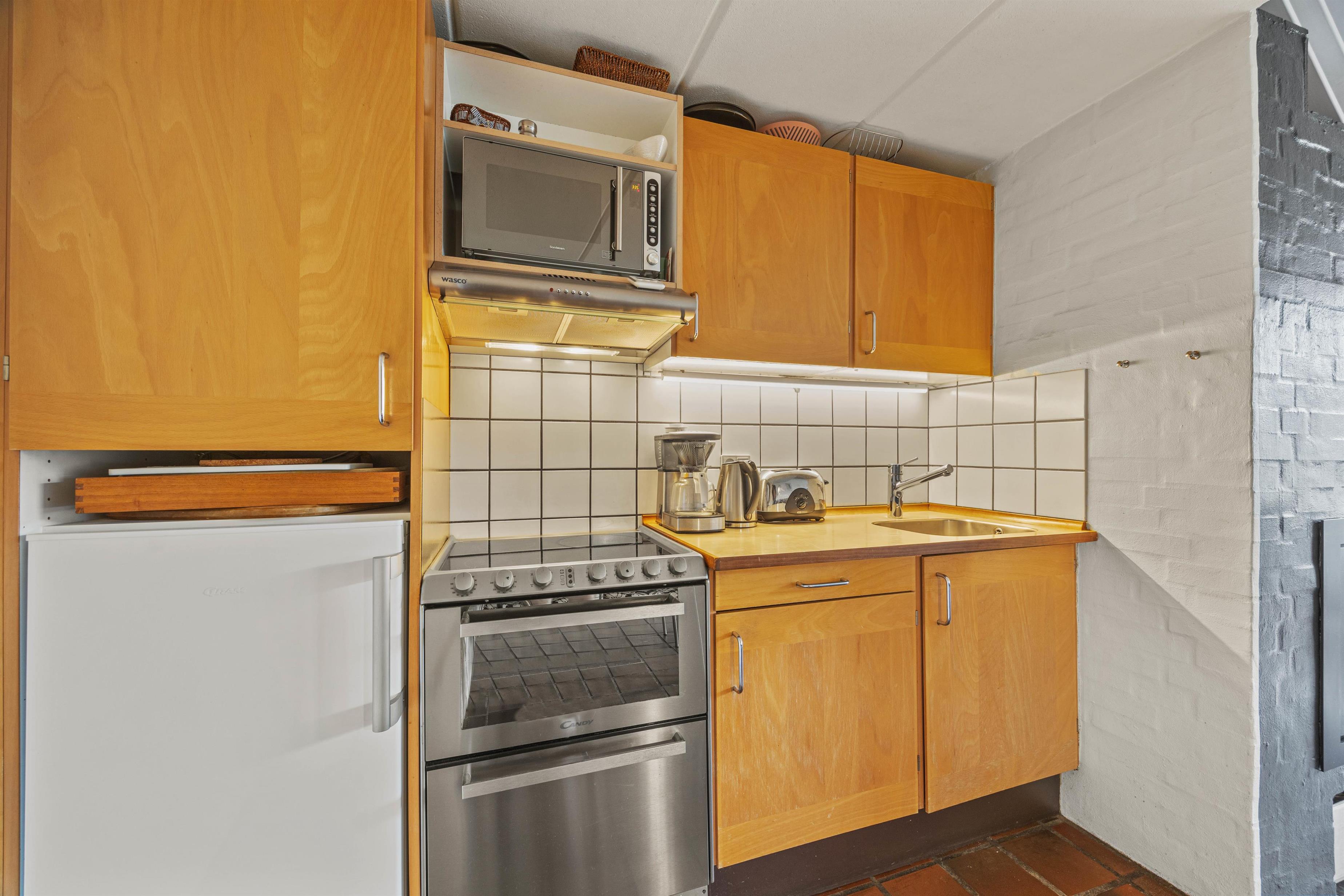 The floor plan includes 3 bedrooms, 1 bathroom and, last but not least, a kitchen/living room with room for everyone. The kitchen is equipped with a microwave and a small oven, as well as a small dishwasher that will wash the dishes for you – instead, you can sit down around the wood-burning stove with a cup of coffee and a book, gather the family for a board game night around the dining table or for a movie night on the sofa.