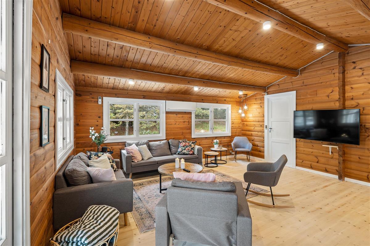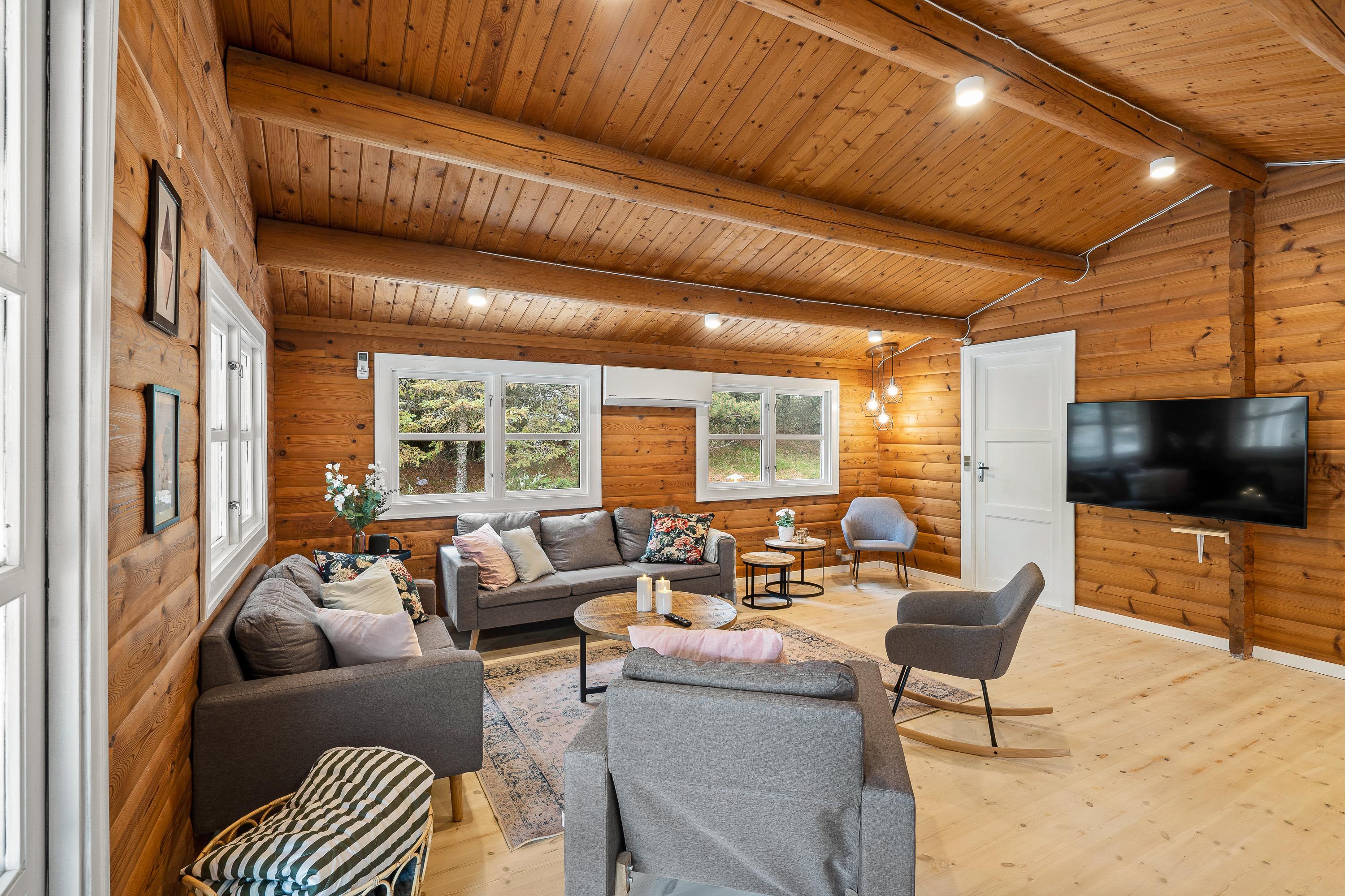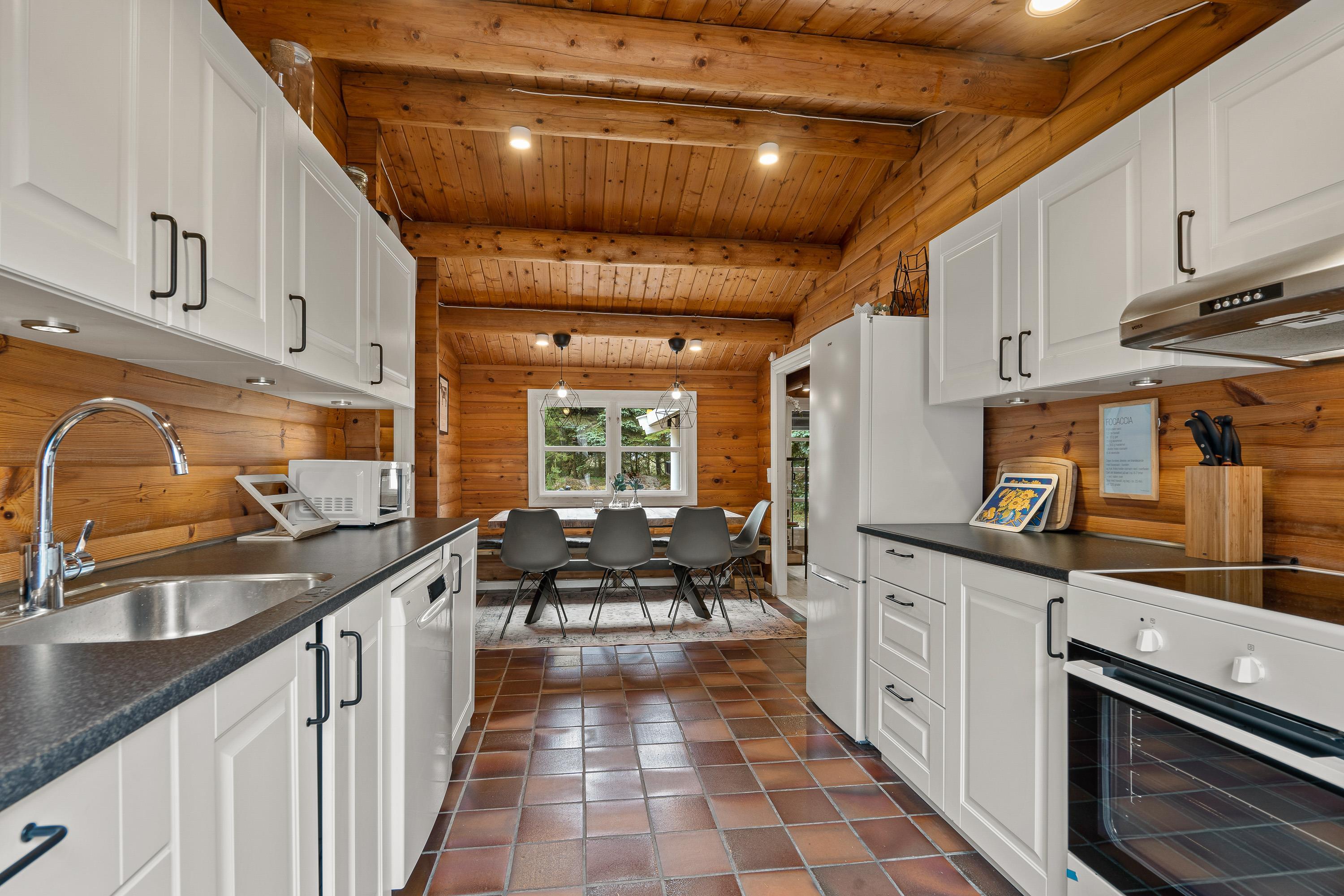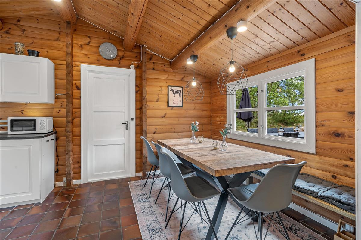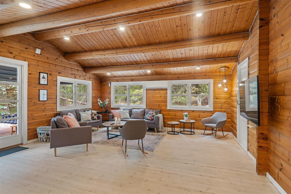 The welcoming living/dining area is perfect for gathering together for delicious meals, games, or a cosy film evening. The crackling of the wood-burning stove in the background provides that characteristic Danish holiday atmosphere.