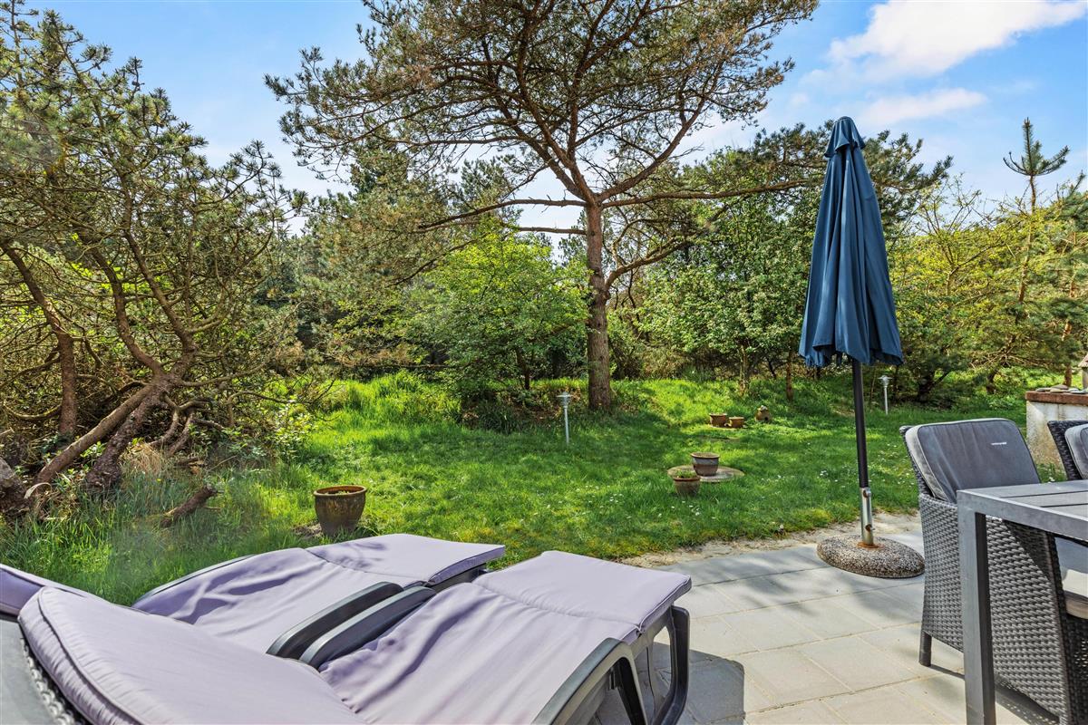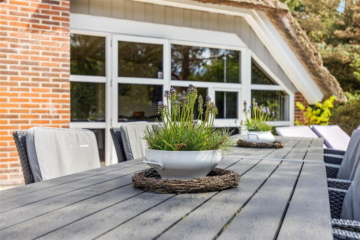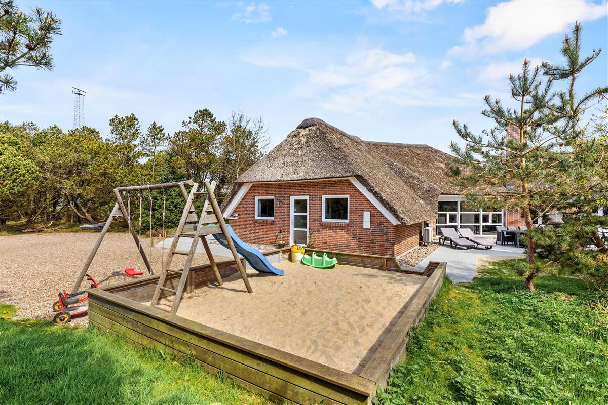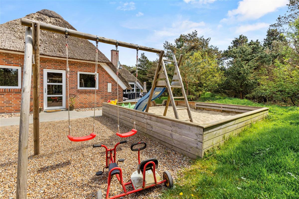 The thatched holiday home at Vestermarken 5B sits on extensive natural grounds, secluded and surrounded by deciduous and coniferous trees. On the open terrace, you can relax on comfortable garden furniture and sun loungers while children enjoy the swing, slide, and sandpit.
