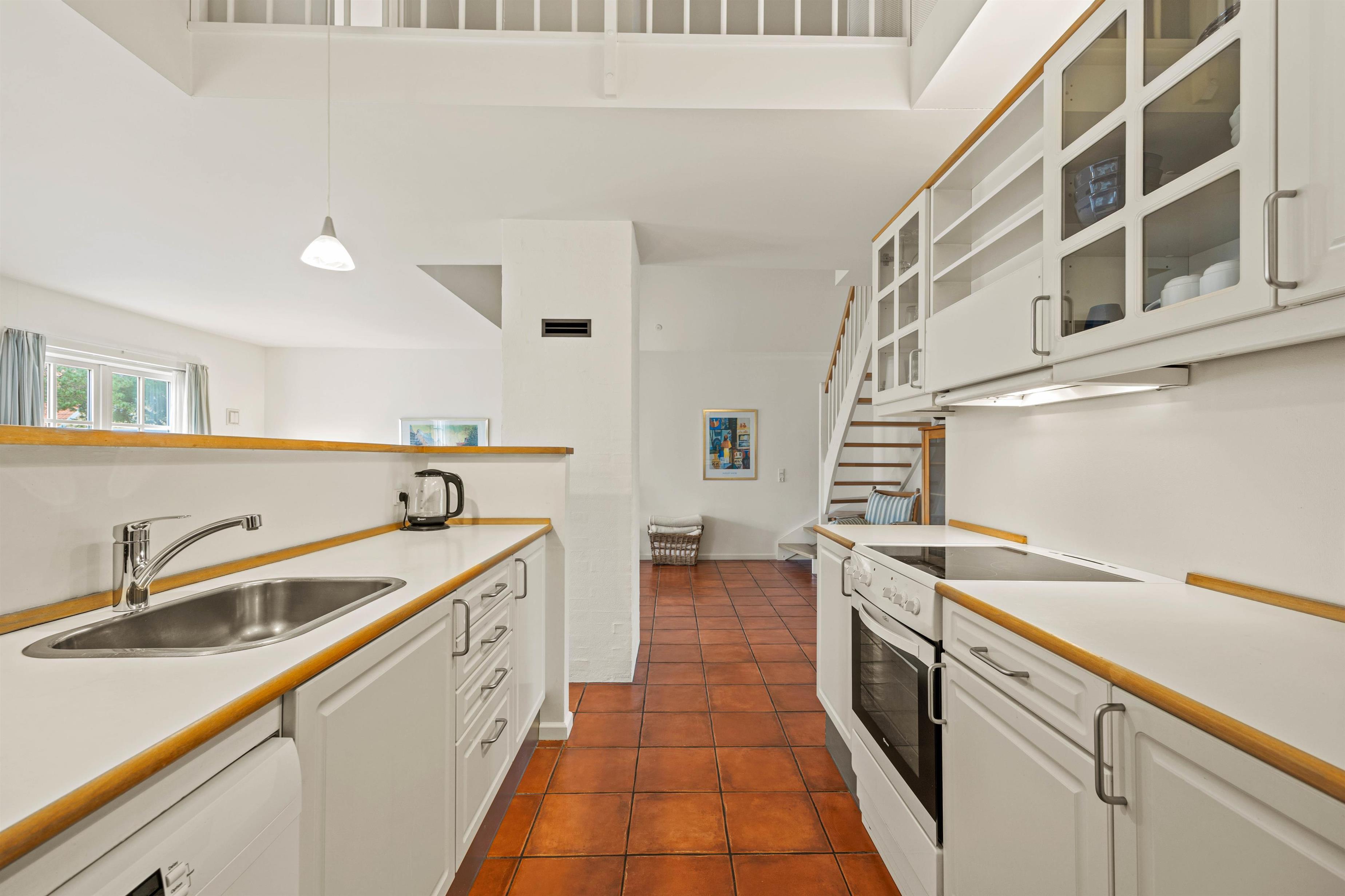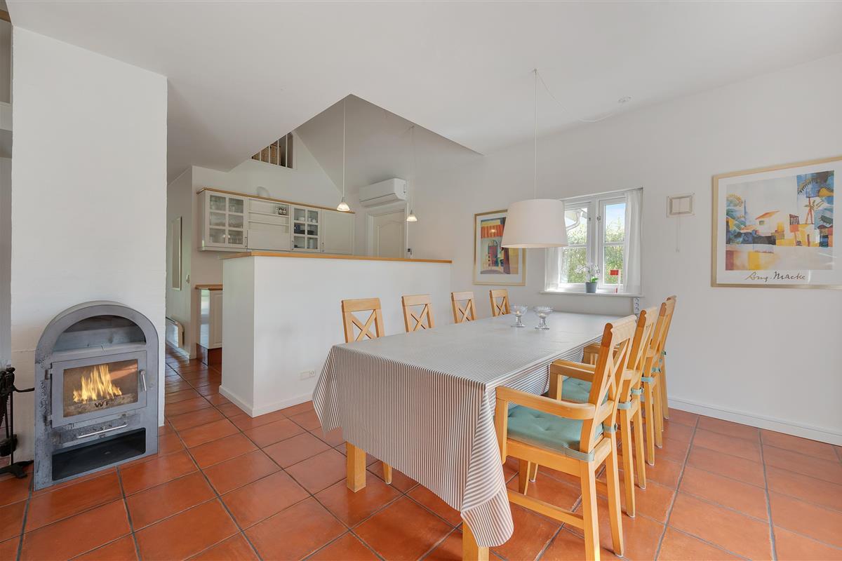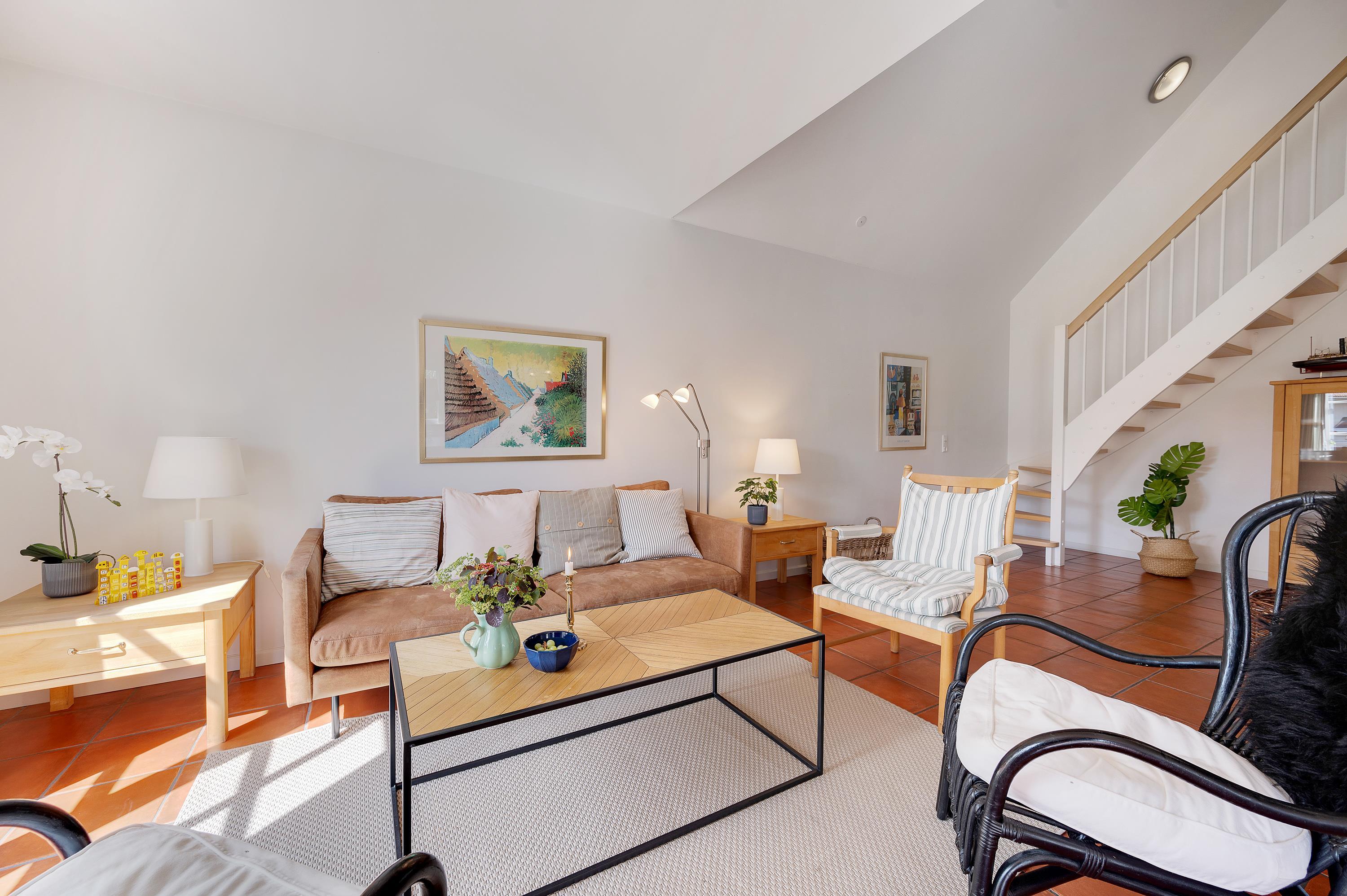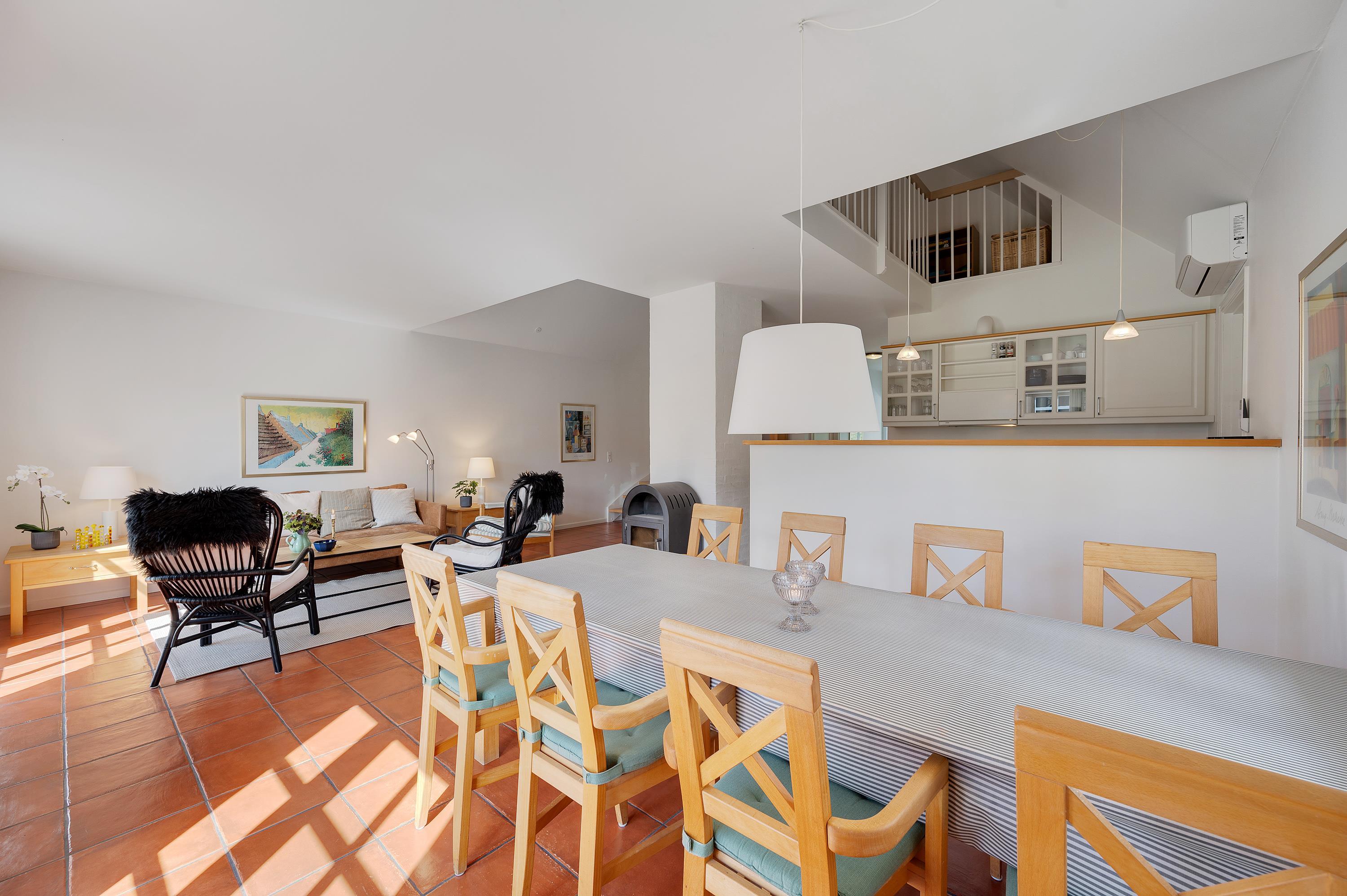 Soft colour schemes, open-plan spaces and wooden features create a wonderfully cosy interior. The heart of the house is the open-plan living room with satellite TV and wood-burning stove, perfect for creating a snug atmosphere on stormy or cool days. While you're out, the energy-efficient heat pump ensures the holiday home stays pleasantly warm. The living room leads directly onto the south-west facing terrace, perfect for soaking up the sunshine on bright days (Note: garden furniture is removed during winter months).