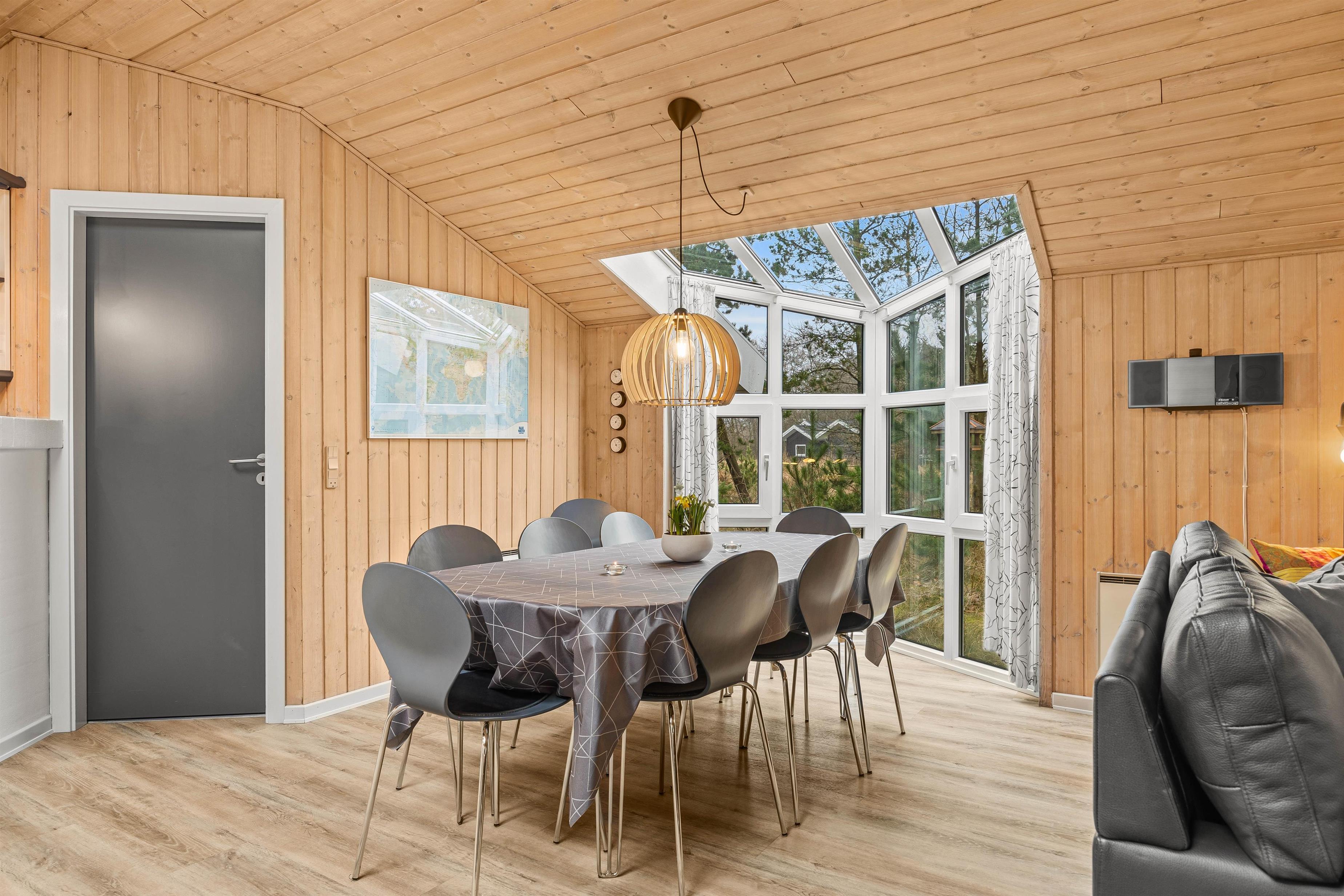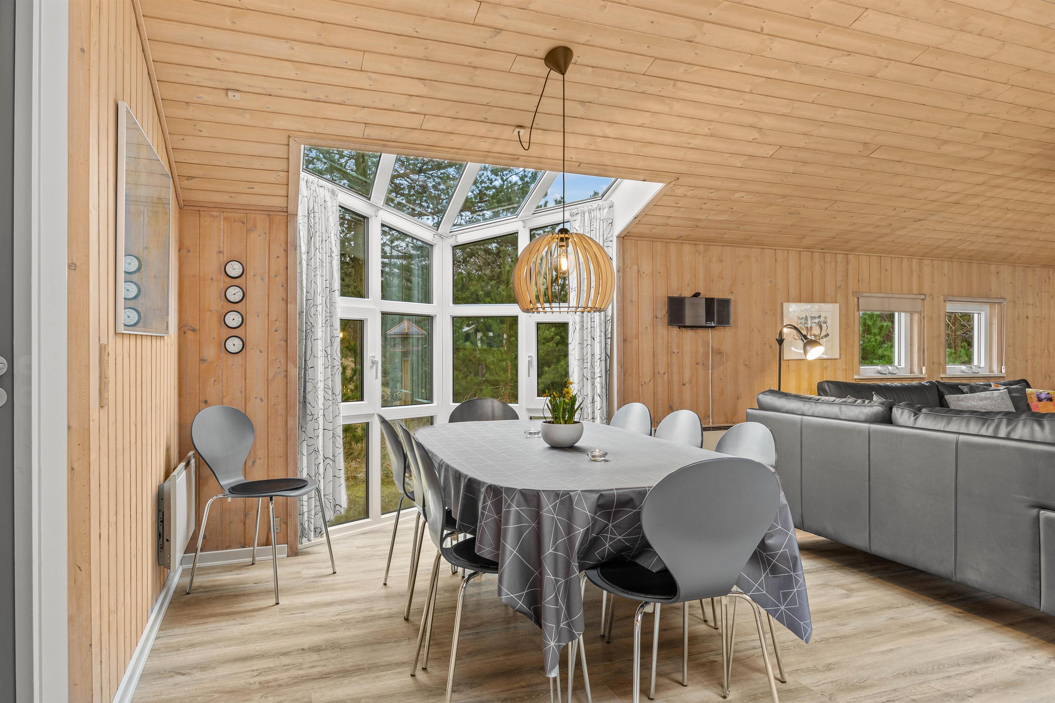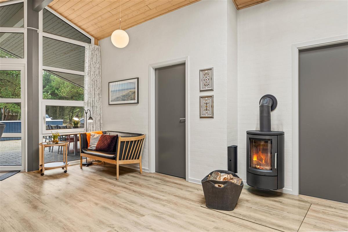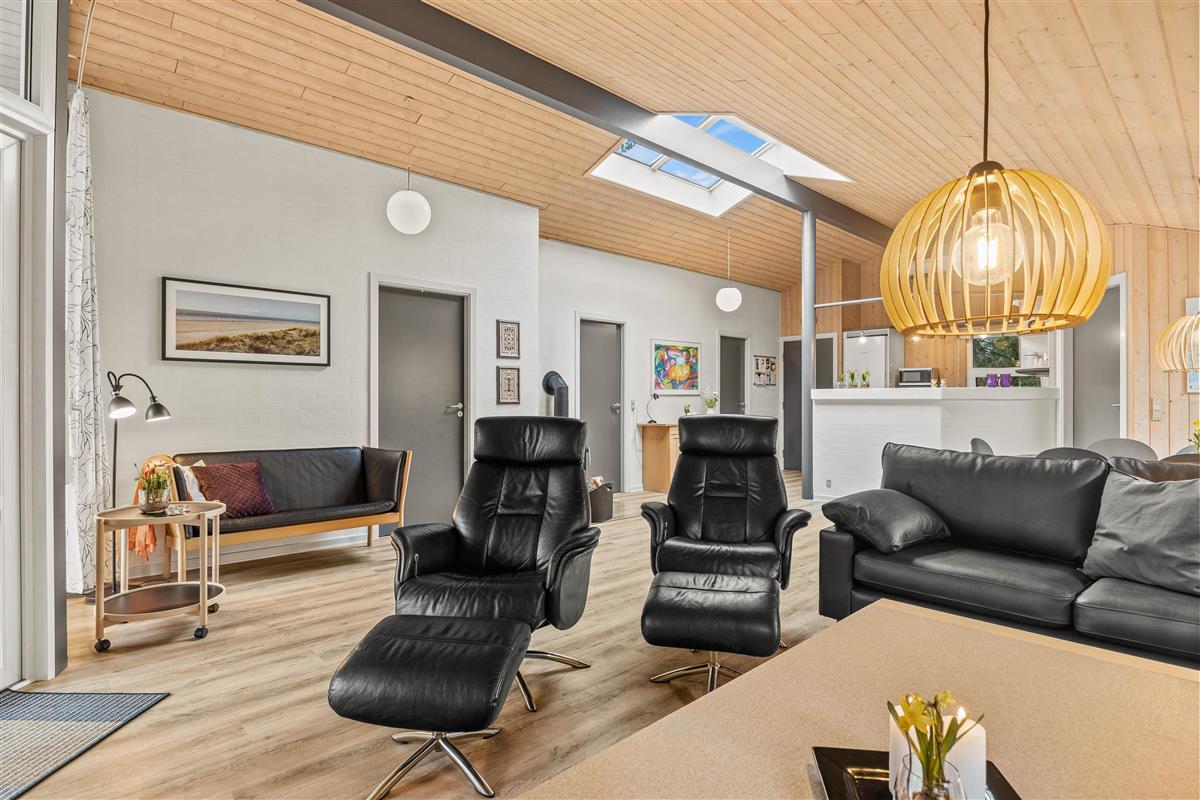 You'll feel at home straight away at Grønnevænget 10 A. The bright, wood-panelled living area forms the heart of the holiday home, where tradition meets modern design. Large windows flood the space with natural light and offer lovely views of the garden. The open-plan space combines the living room, dining area and kitchen.