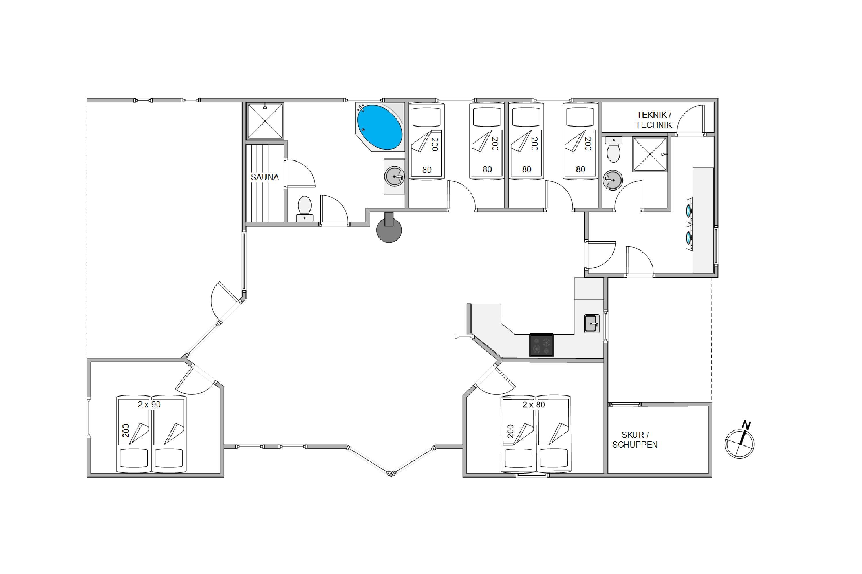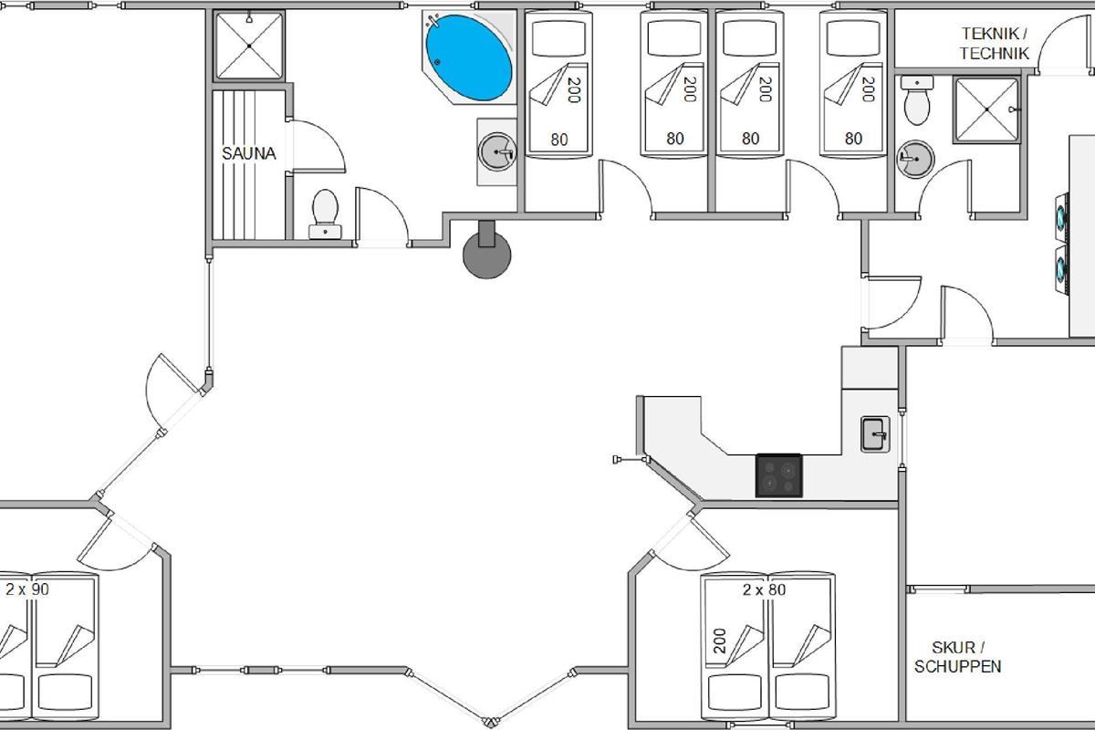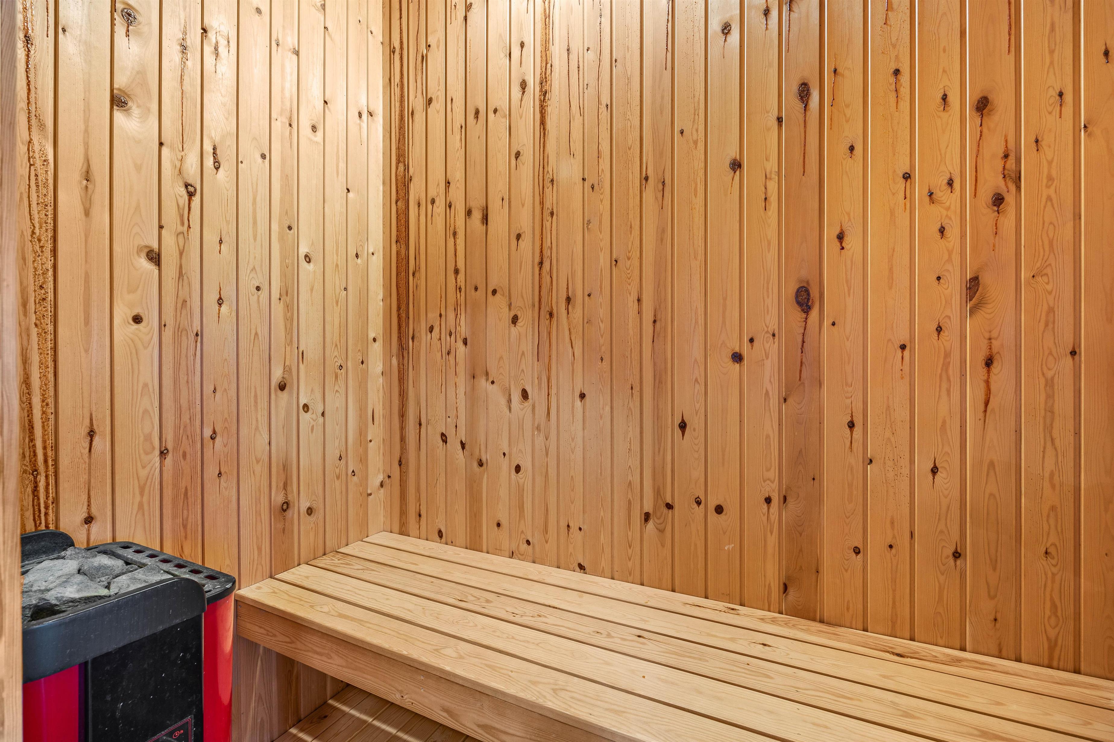 Both light-tiled bathrooms feature underfloor heating and a shower. The main bathroom provides direct access to the holiday home's sauna and two-person whirlpool. For added convenience, there's a washing machine and tumble dryer, plus an energy-efficient heat pump that quickly and efficiently maintains a comfortable temperature throughout.
