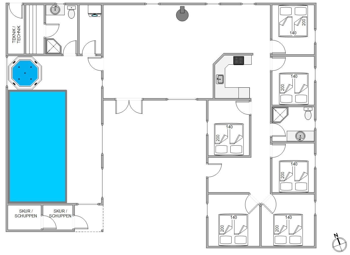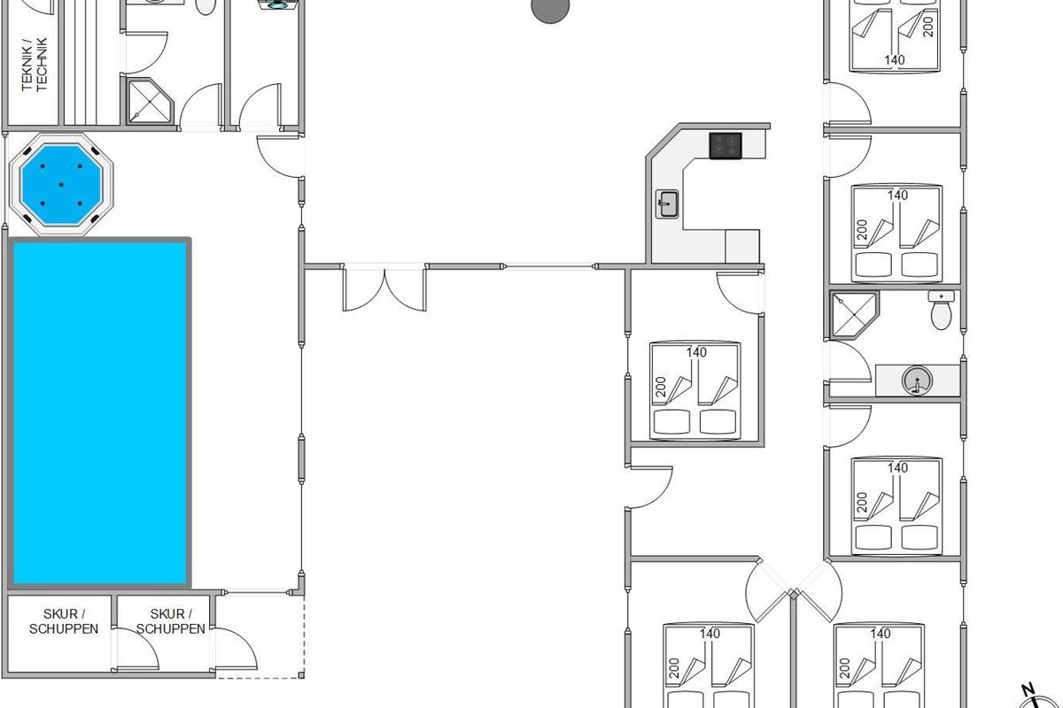 Here you'll also find the sauna and hot tub, perfect for relaxation while children enjoy the pool. The six cosy bedrooms each feature comfortable double beds, ensuring a restful night's sleep for all guests.