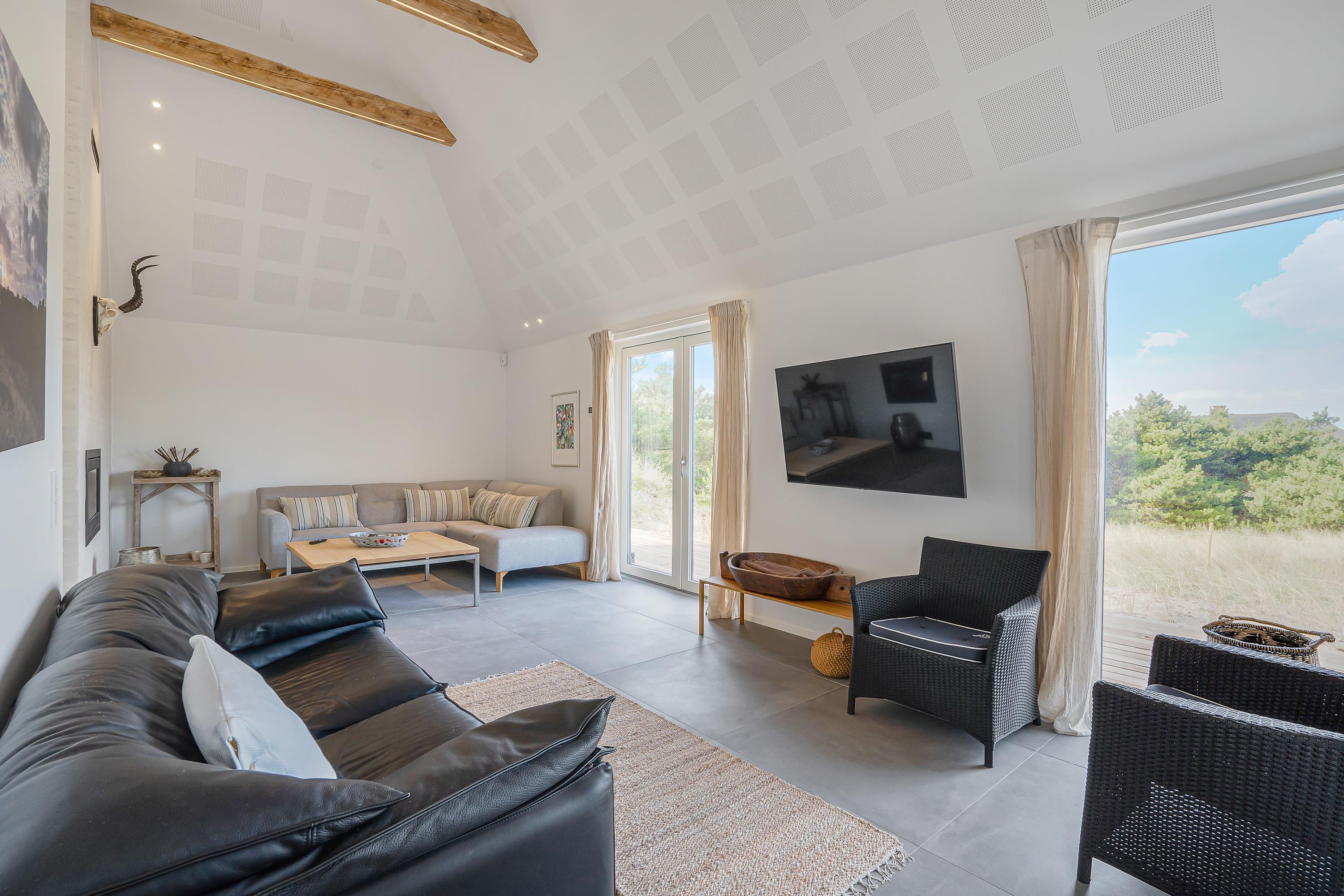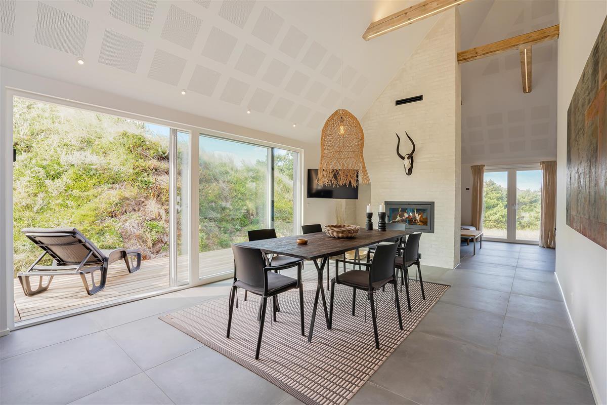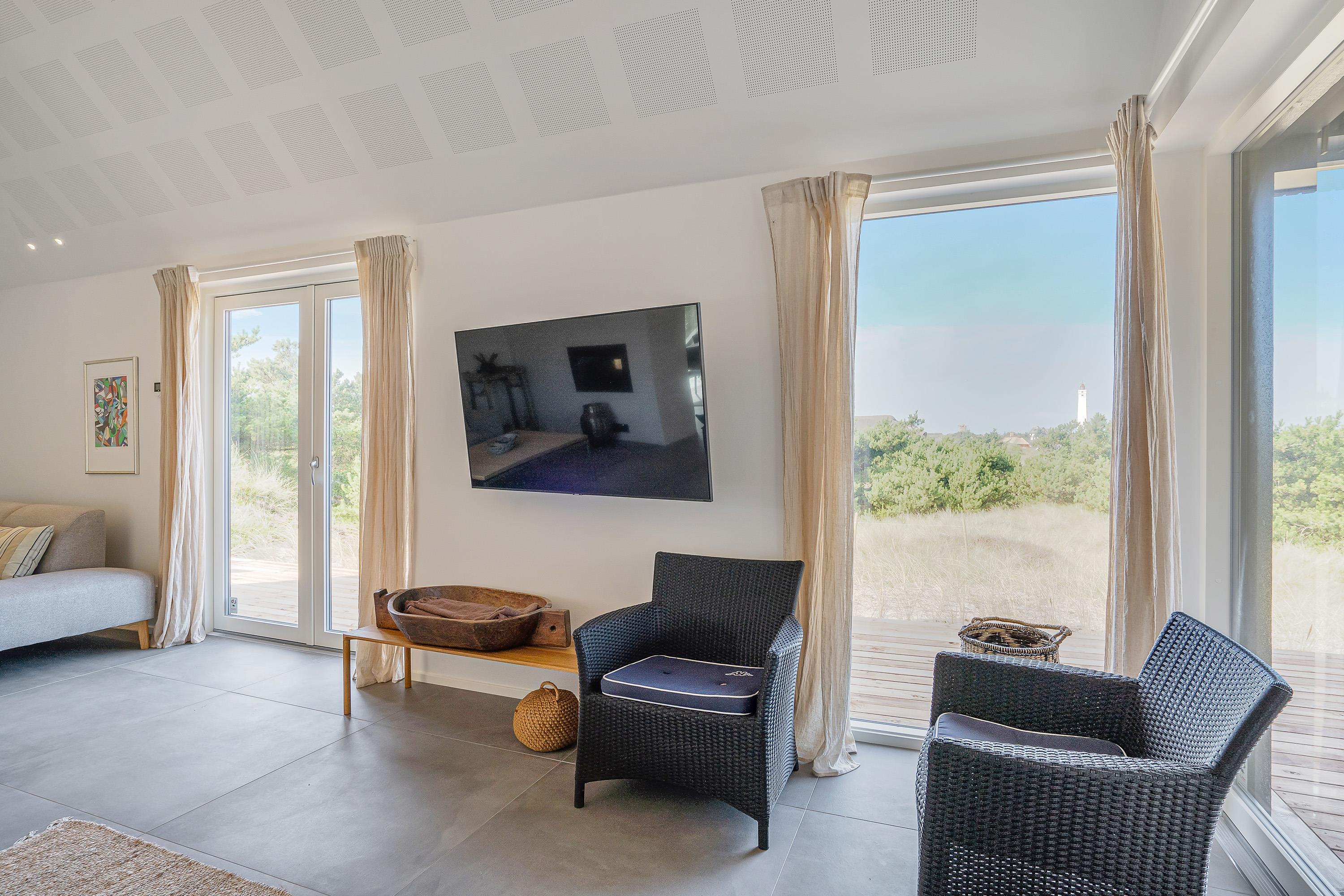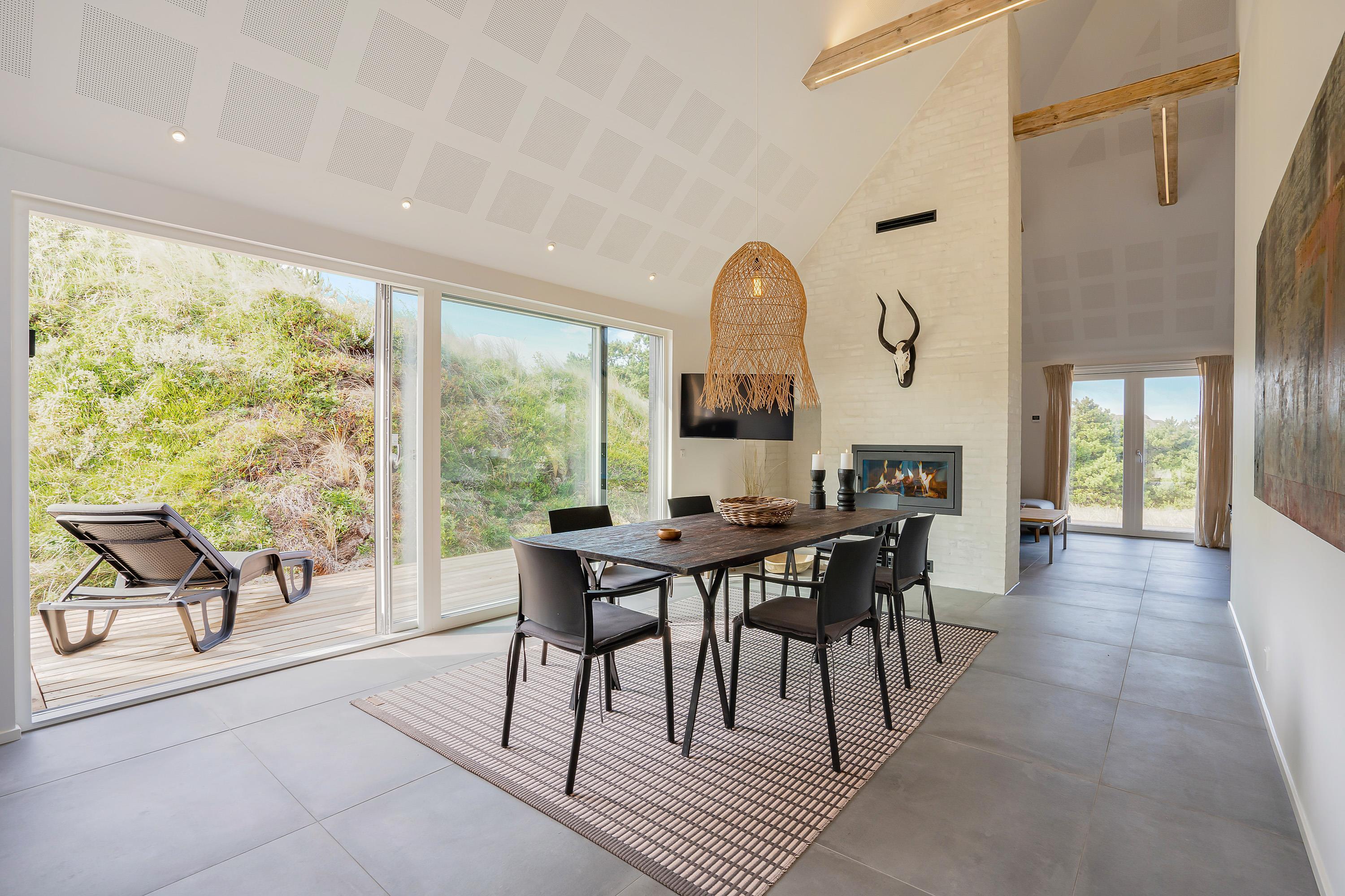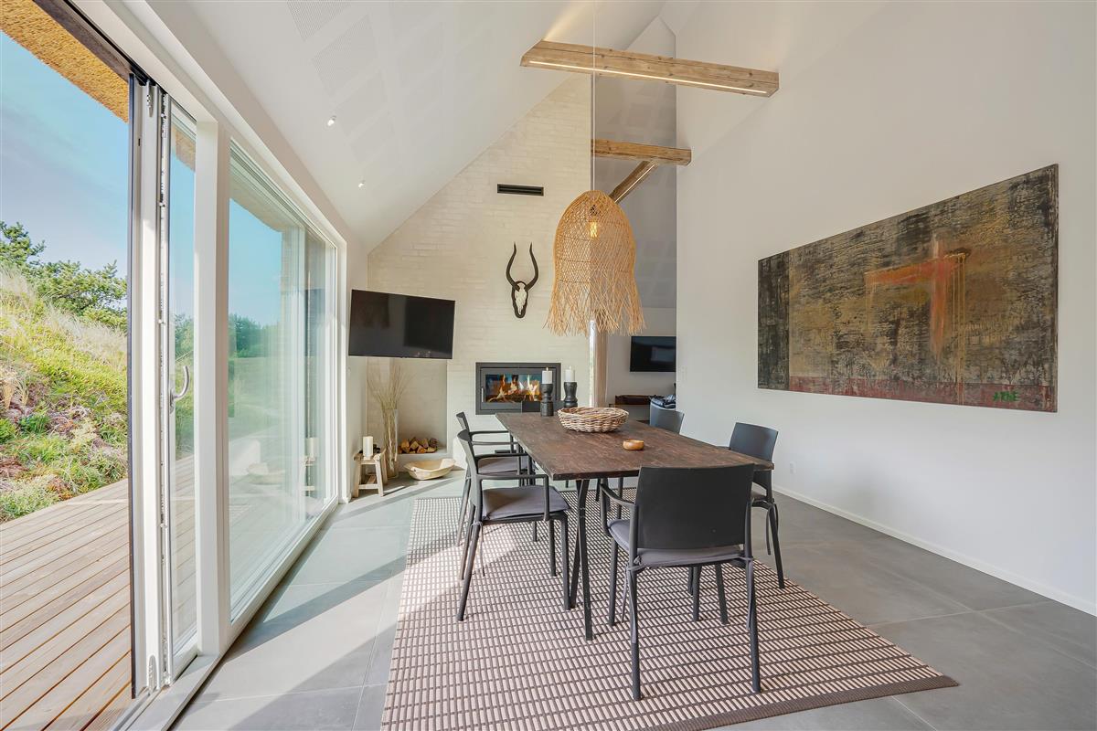 The spacious dining and living area is partially divided by a wall featuring an integrated double-sided fireplace, creating a cosy atmosphere even during dinner. The light-filled house offers a unique atmosphere with magnificent views over the surrounding dune landscape and the Blåvandshuk lighthouse. Here you can enjoy an unforgettable holiday.