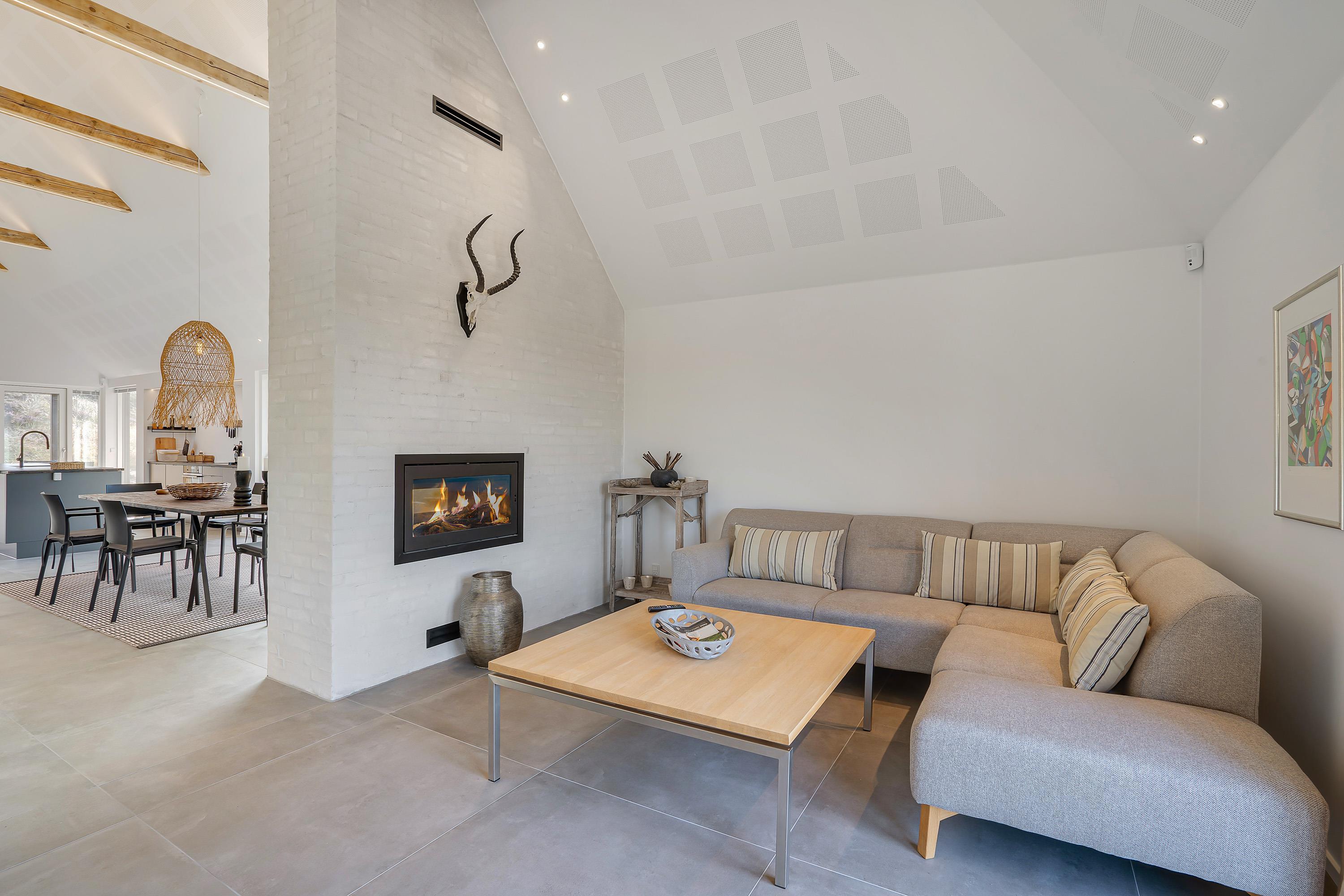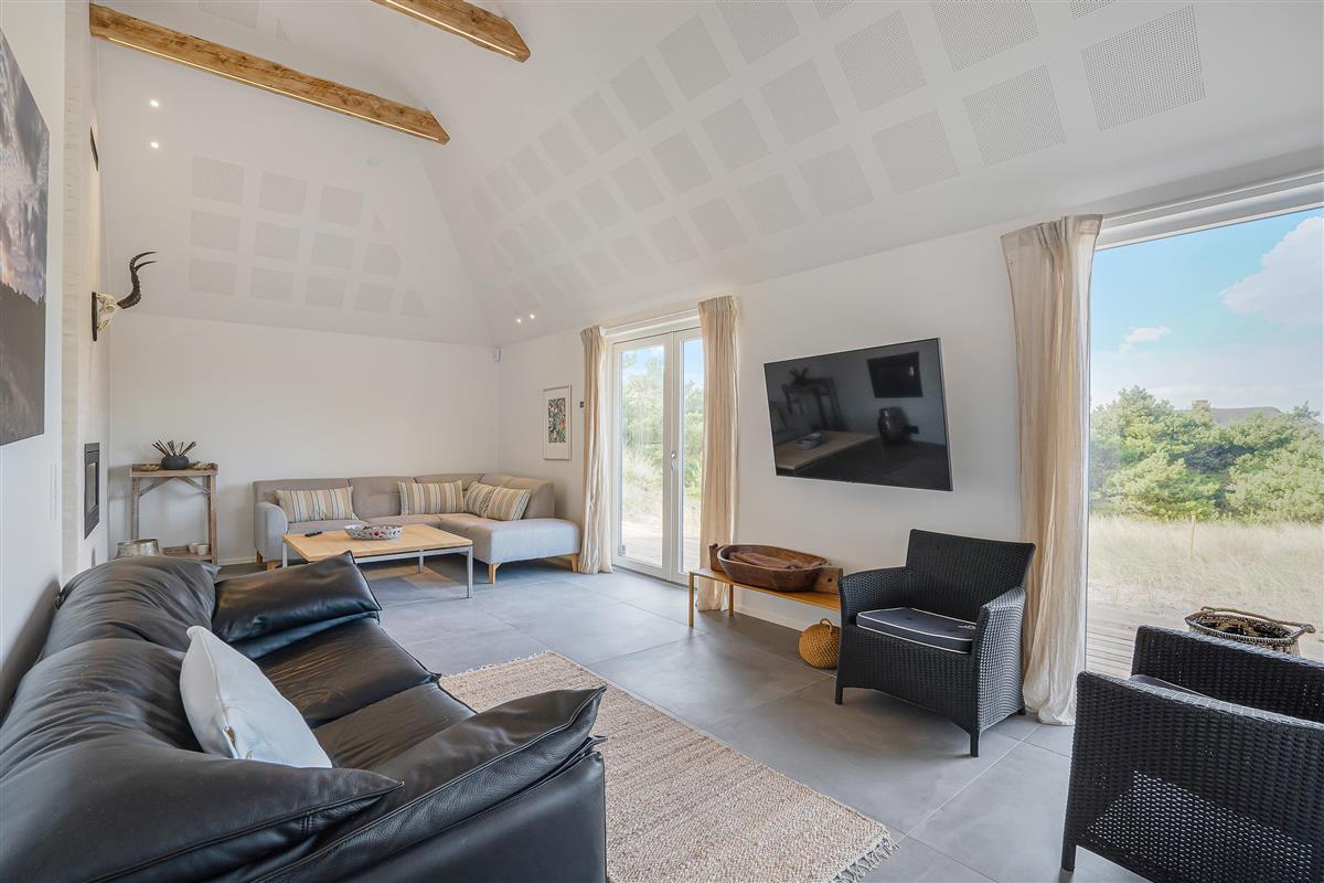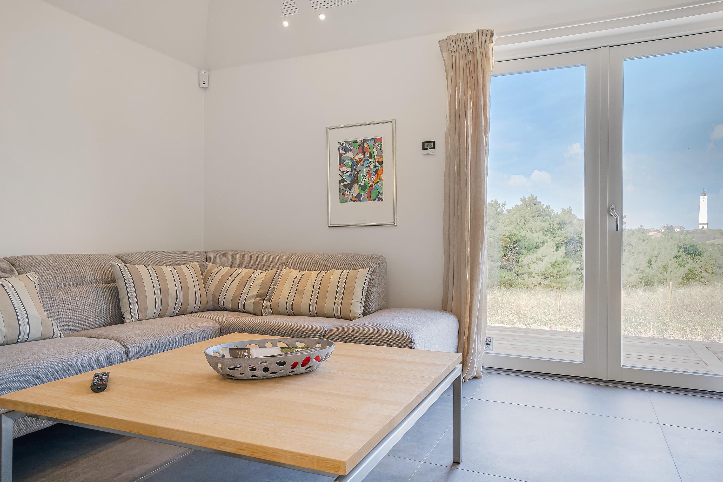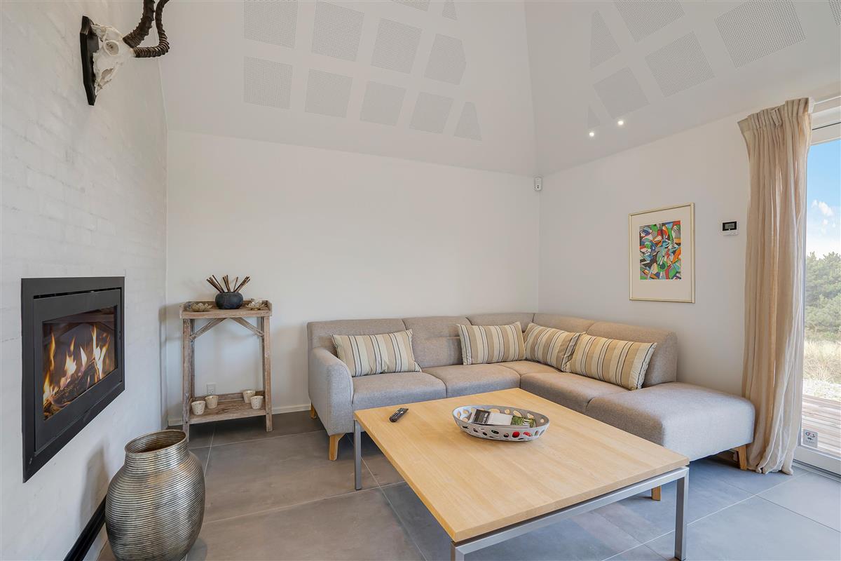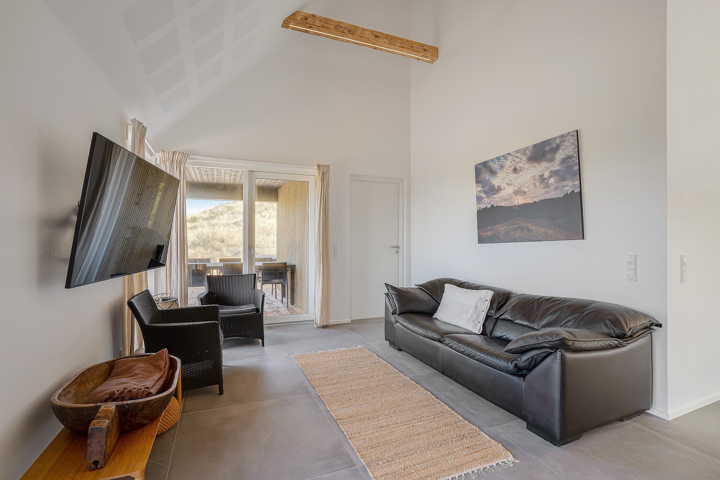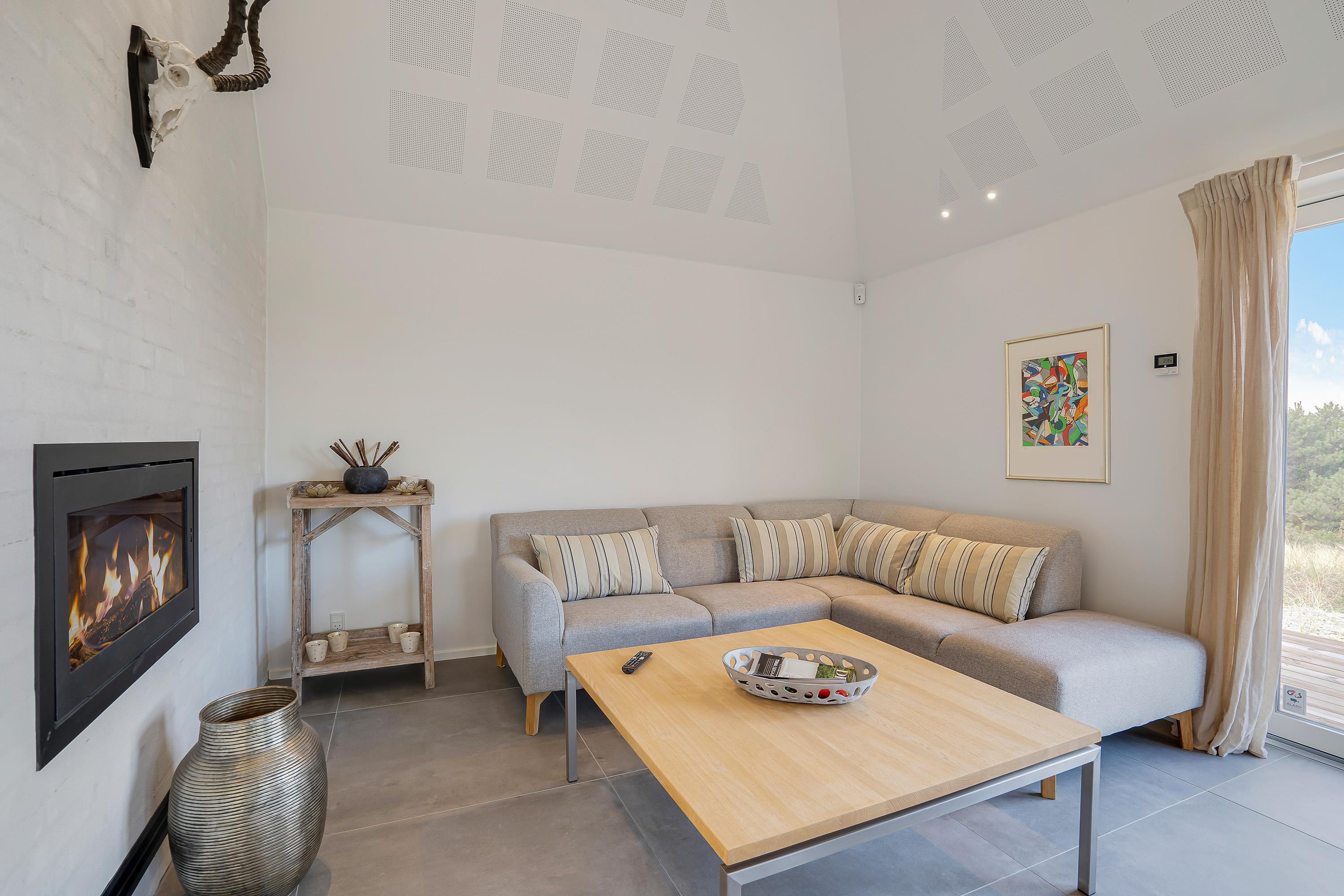The spacious dining and living area is partially divided by a wall featuring an integrated double-sided fireplace, creating a cosy atmosphere even during dinner. The light-filled house offers a unique atmosphere with magnificent views over the surrounding dune landscape and the Blåvandshuk lighthouse. Here you can enjoy an unforgettable holiday.