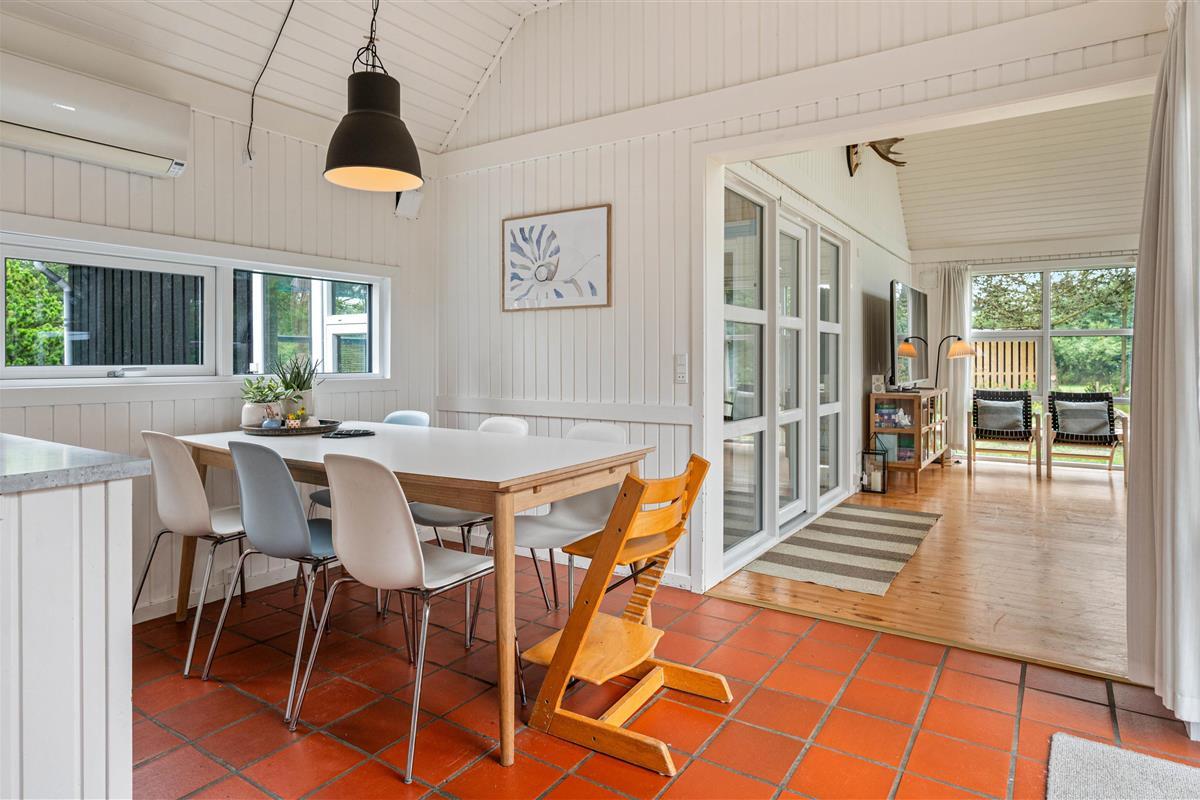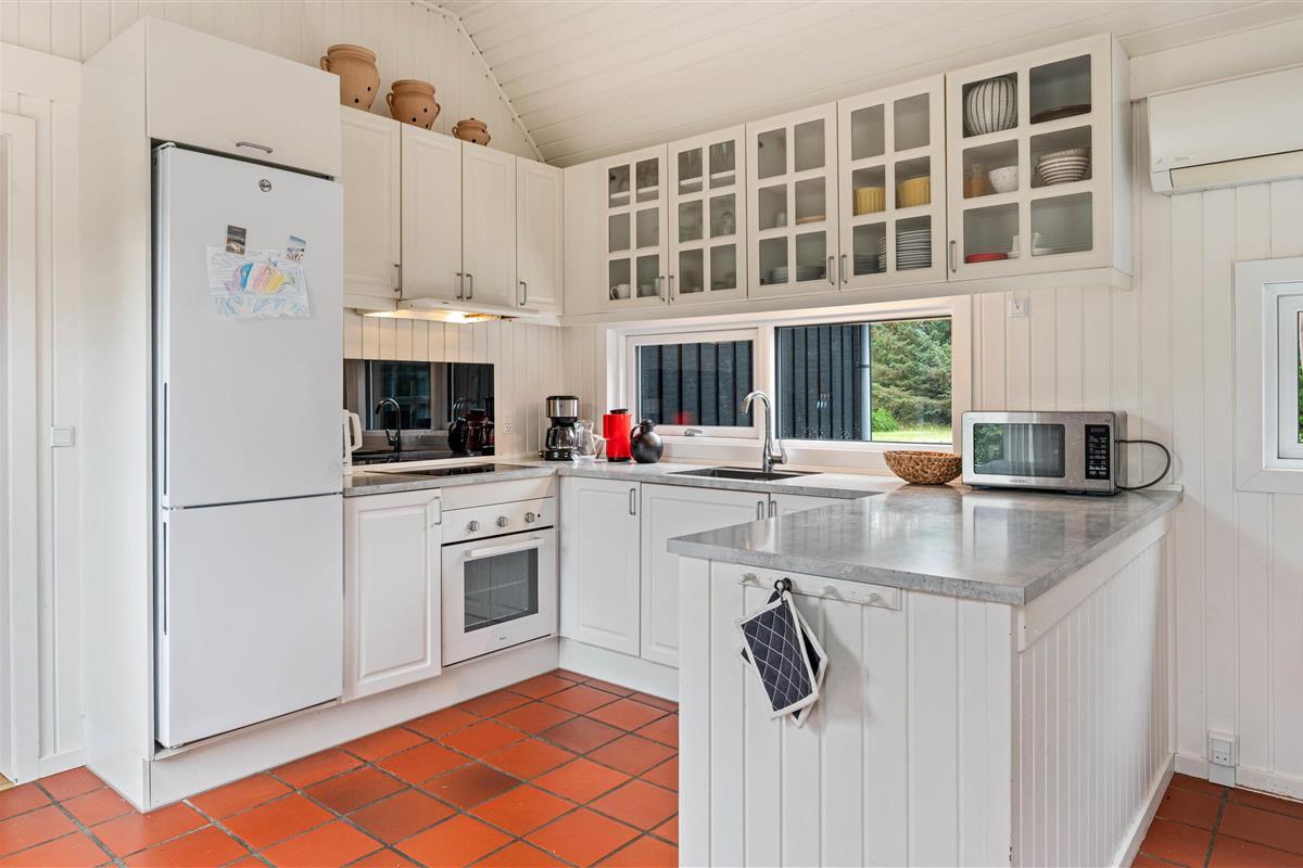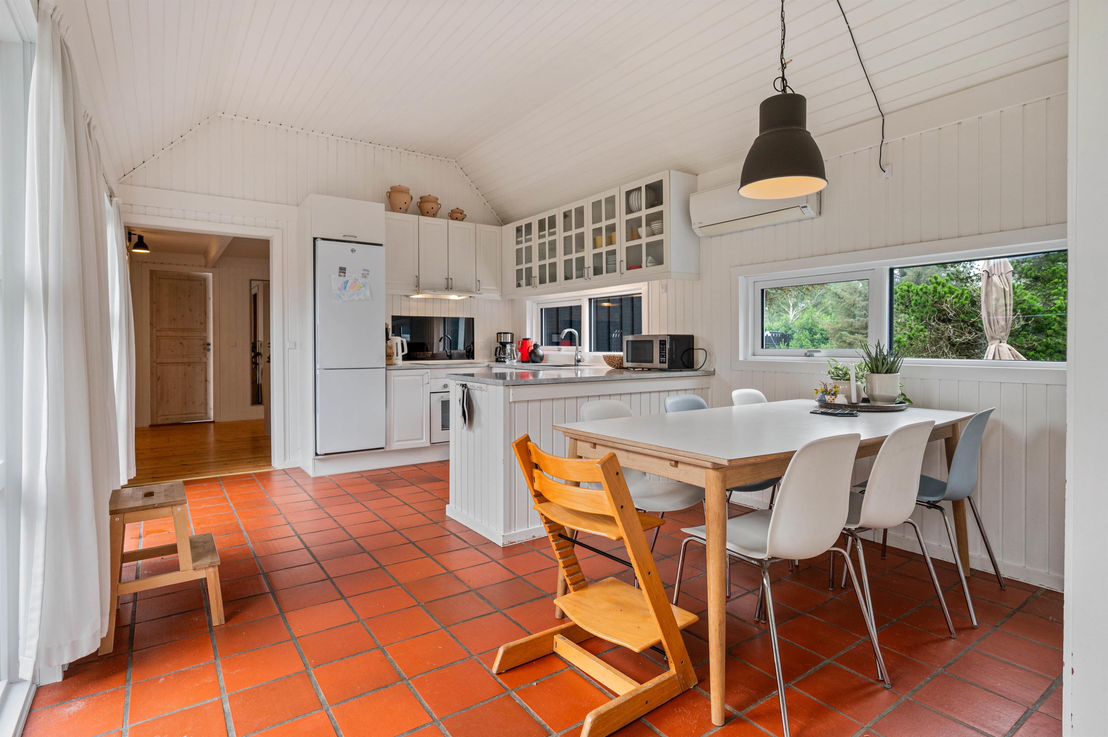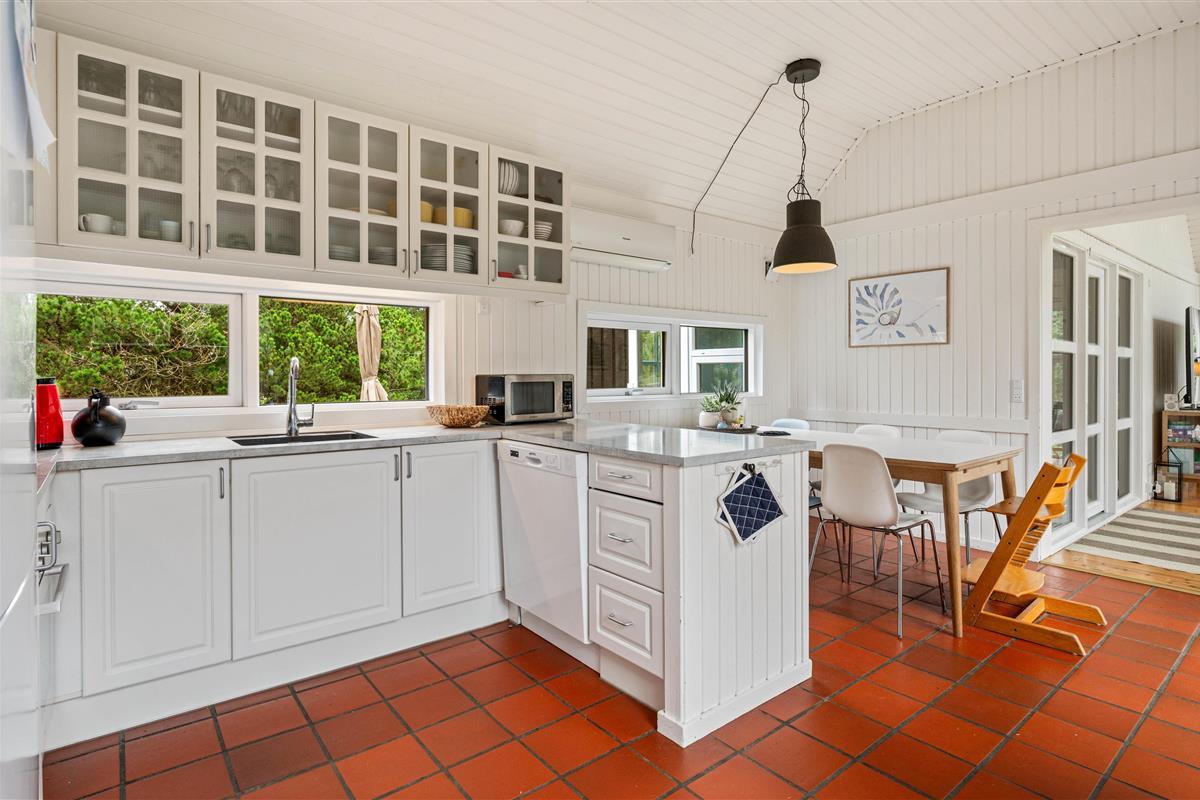 The kitchen opens onto the dining area, allowing children to play at the table while you prepare meals. The kitchen comes equipped with an induction hob, dishwasher and microwave. The holiday home also includes a 60-litre freezer.