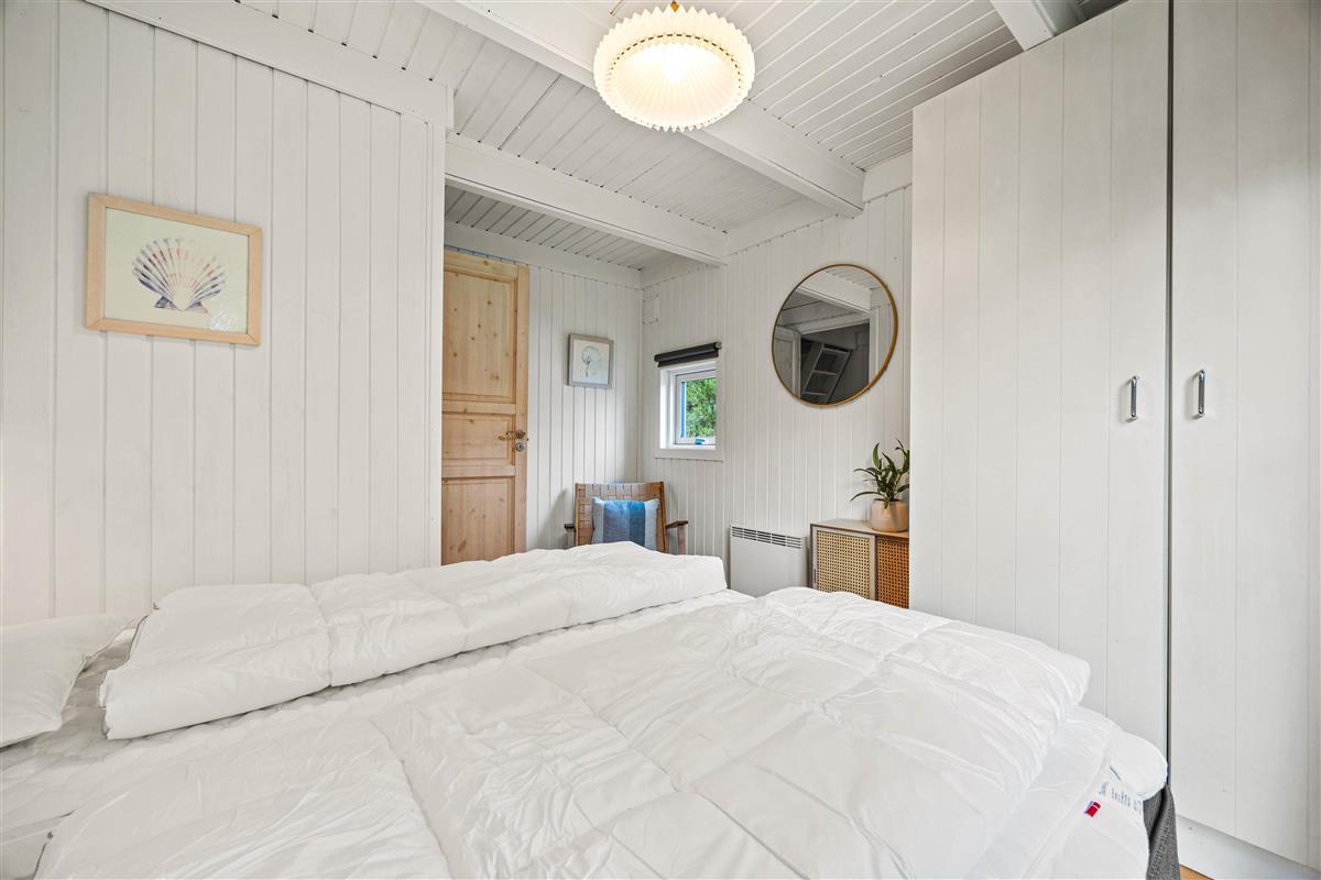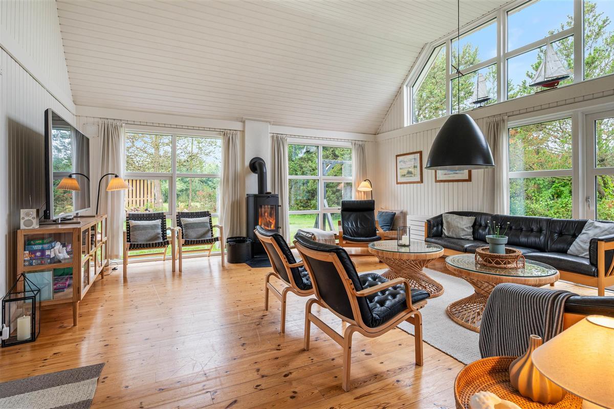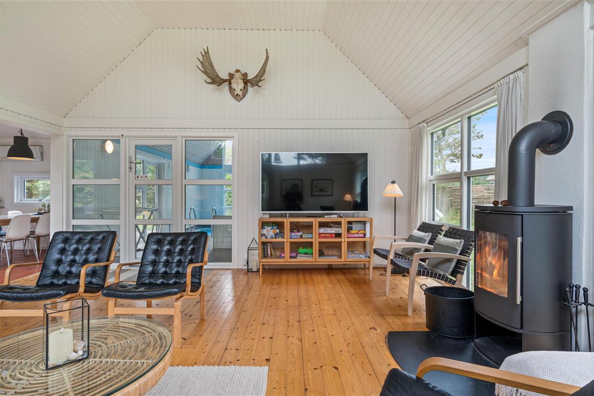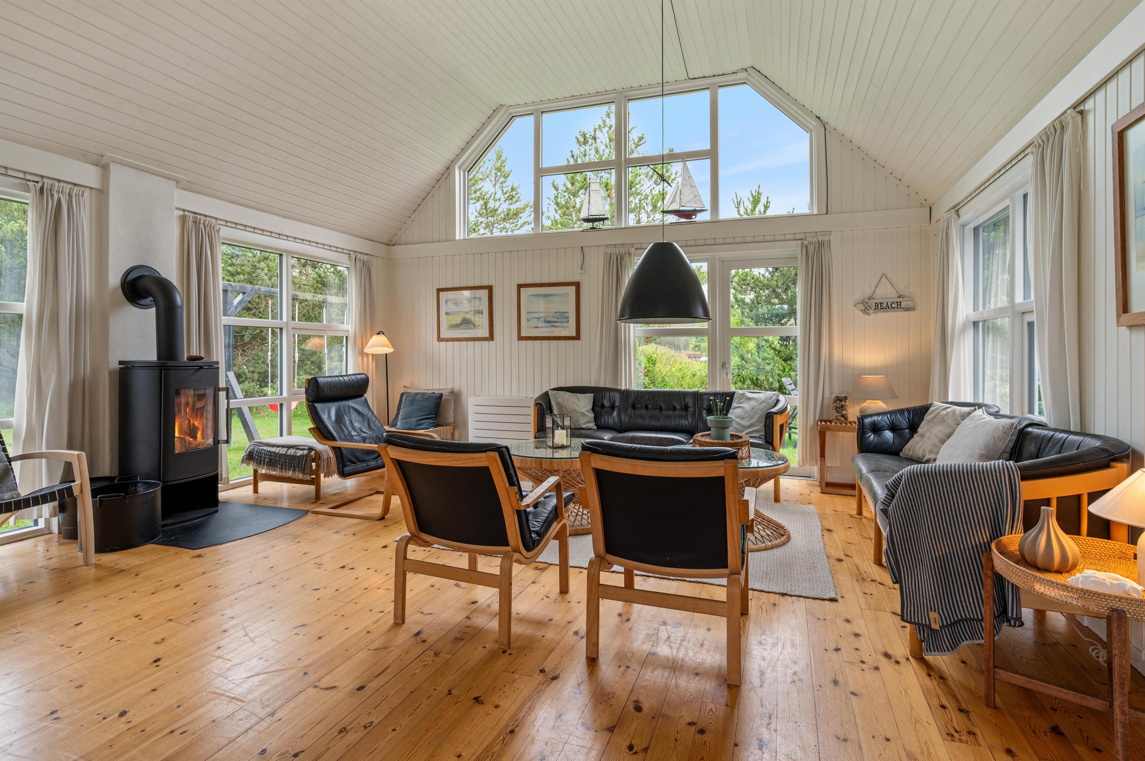 The heart of this summer house at Kollemarken 61 is the welcoming living room. The high-ceilinged space is flooded with natural light through numerous windows, featuring white-painted wooden walls and wooden flooring that creates a cosy atmosphere. In the evening, light the fireplace and enjoy its warming comfort while streaming films via Chromecast.