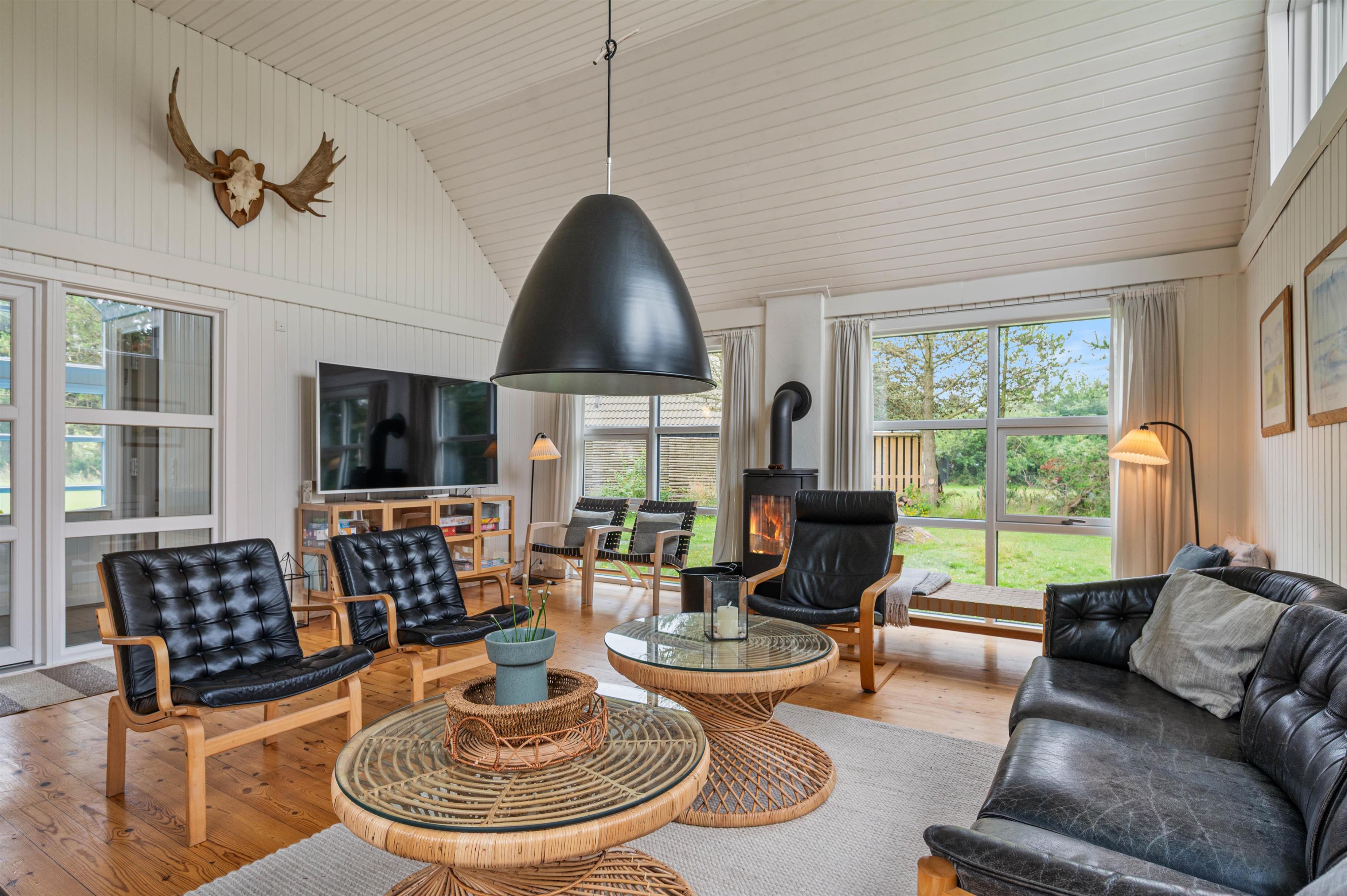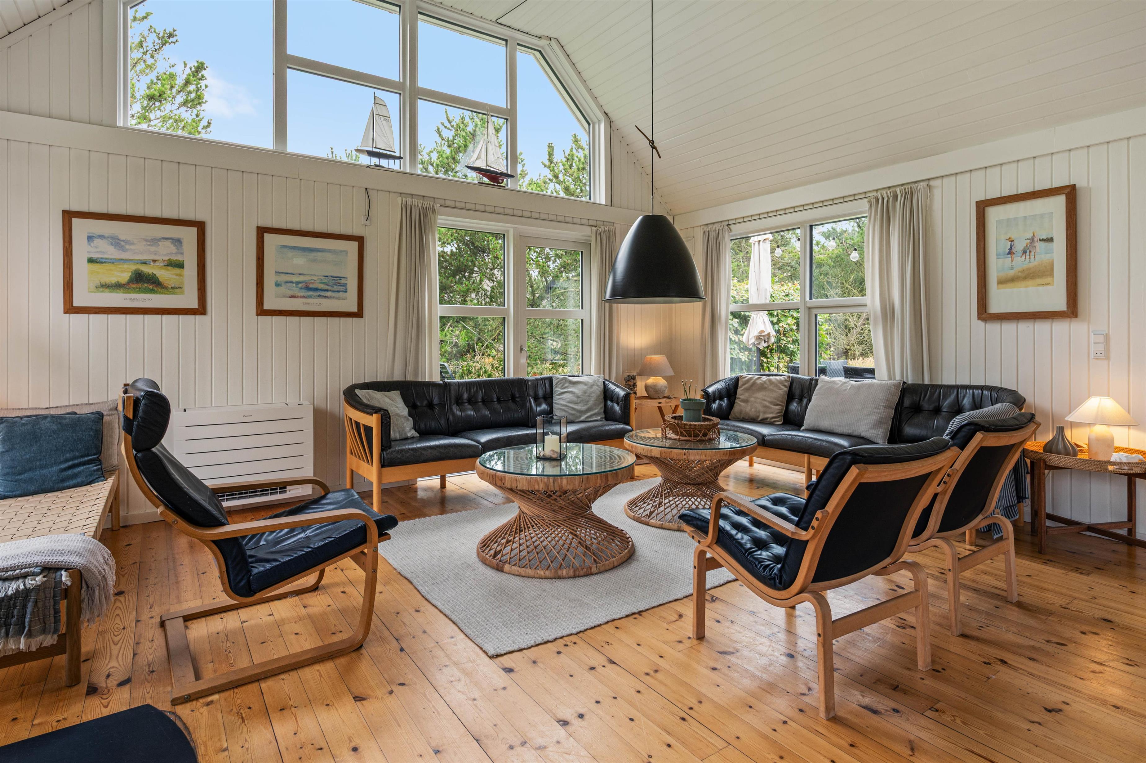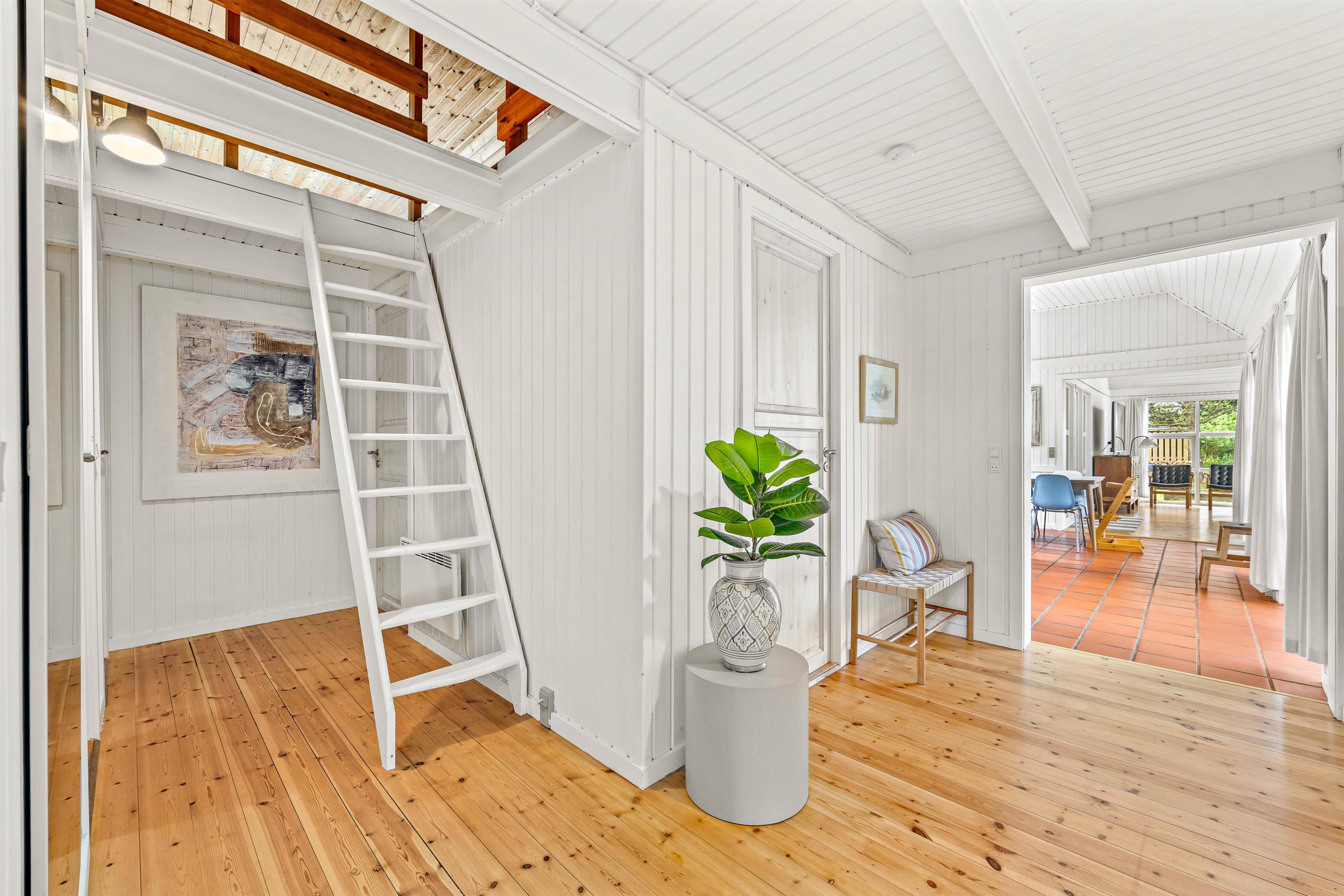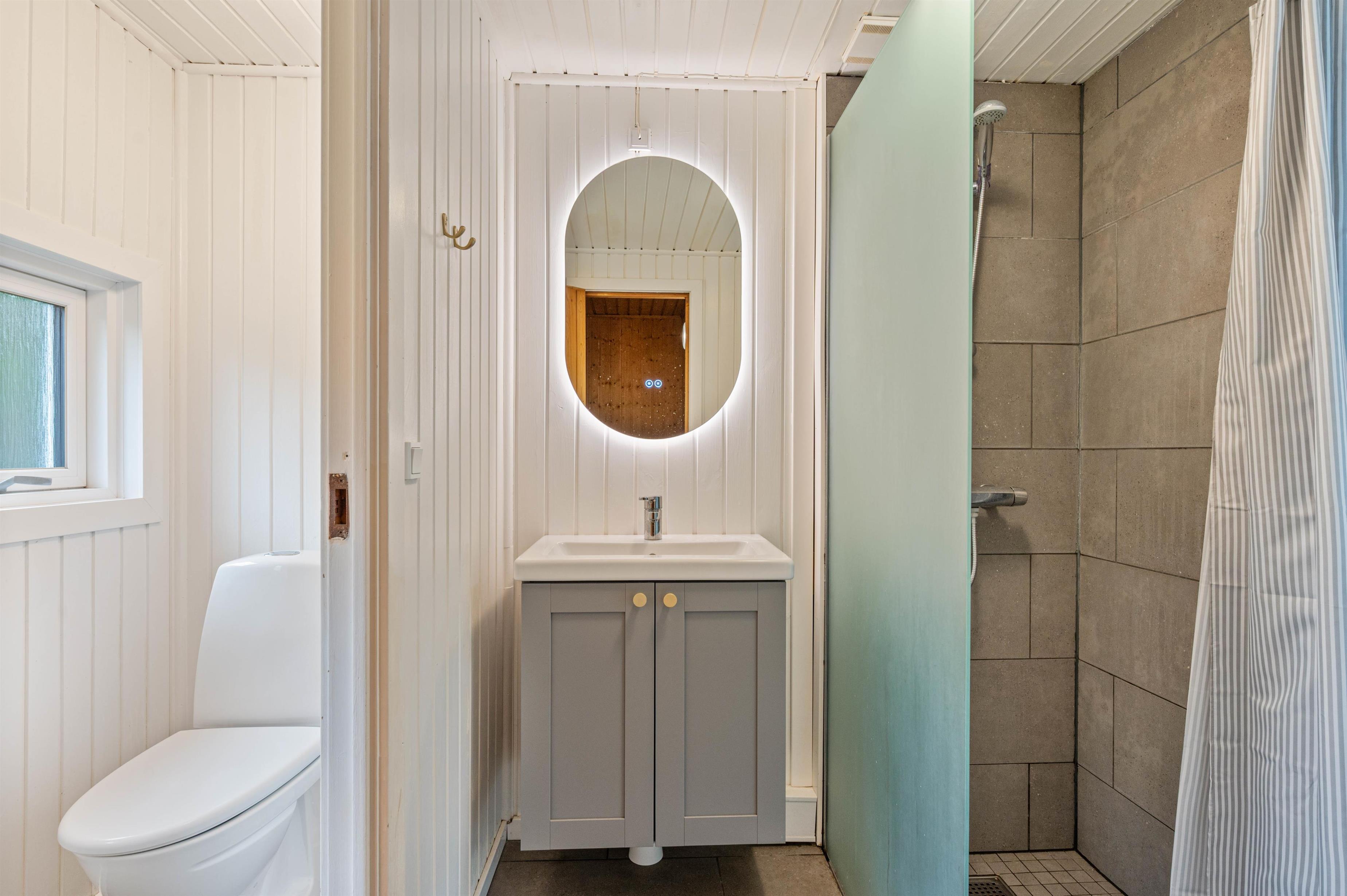 The heart of this summer house at Kollemarken 61 is the welcoming living room. The high-ceilinged space is flooded with natural light through numerous windows, featuring white-painted wooden walls and wooden flooring that creates a cosy atmosphere. In the evening, light the fireplace and enjoy its warming comfort while streaming films via Chromecast.