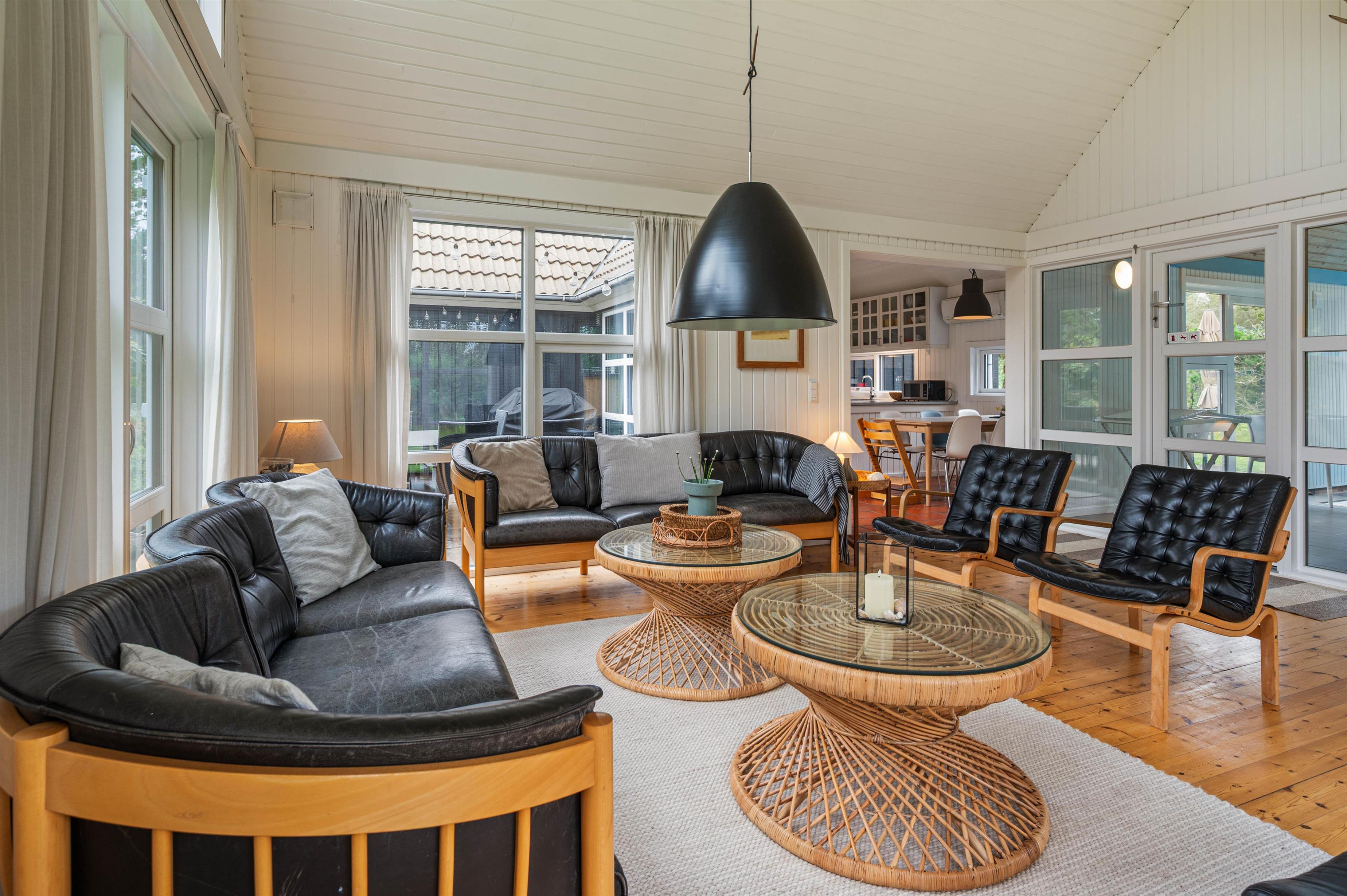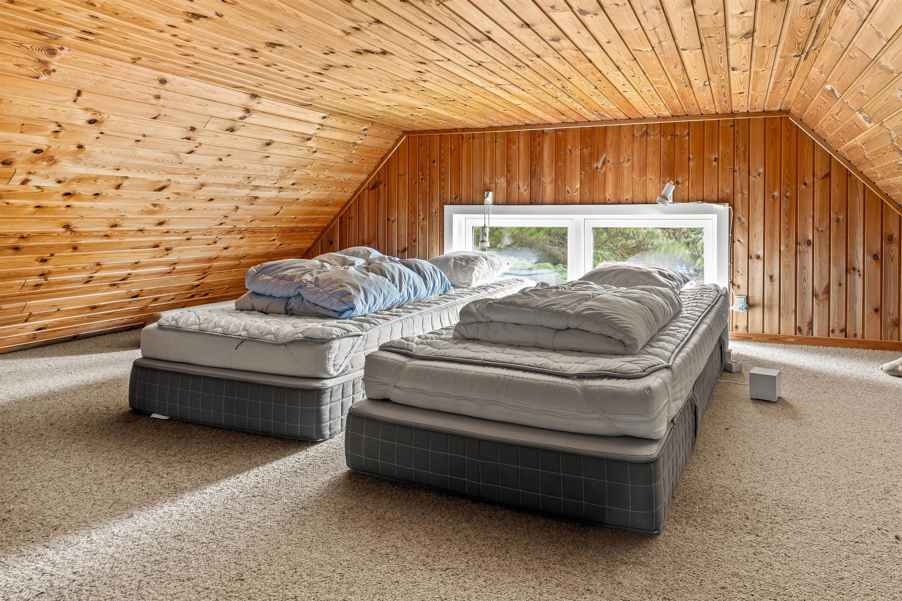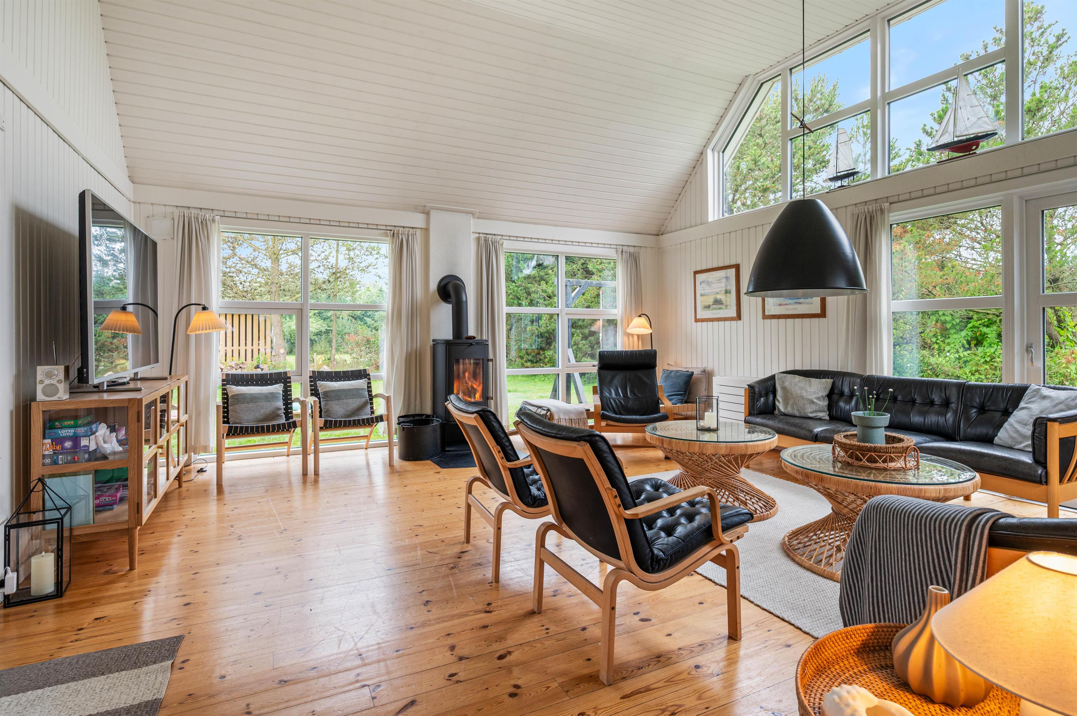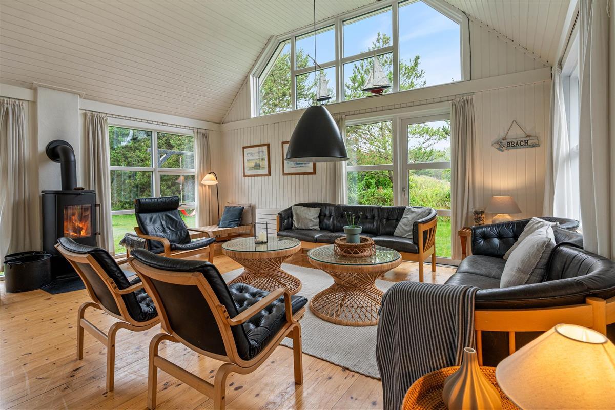 The heart of this summer house at Kollemarken 61 is the welcoming living room. The high-ceilinged space is flooded with natural light through numerous windows, featuring white-painted wooden walls and wooden flooring that creates a cosy atmosphere. In the evening, light the fireplace and enjoy its warming comfort while streaming films via Chromecast.
