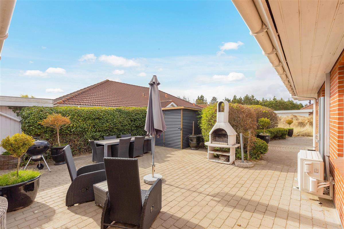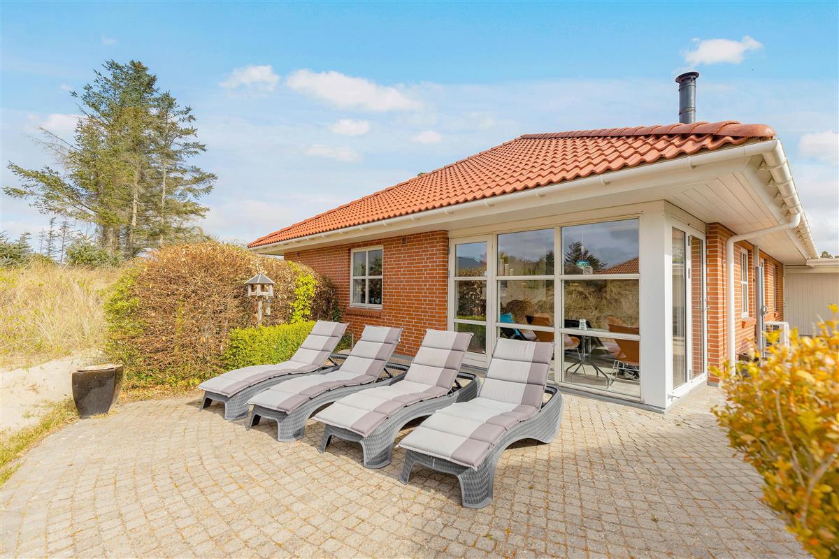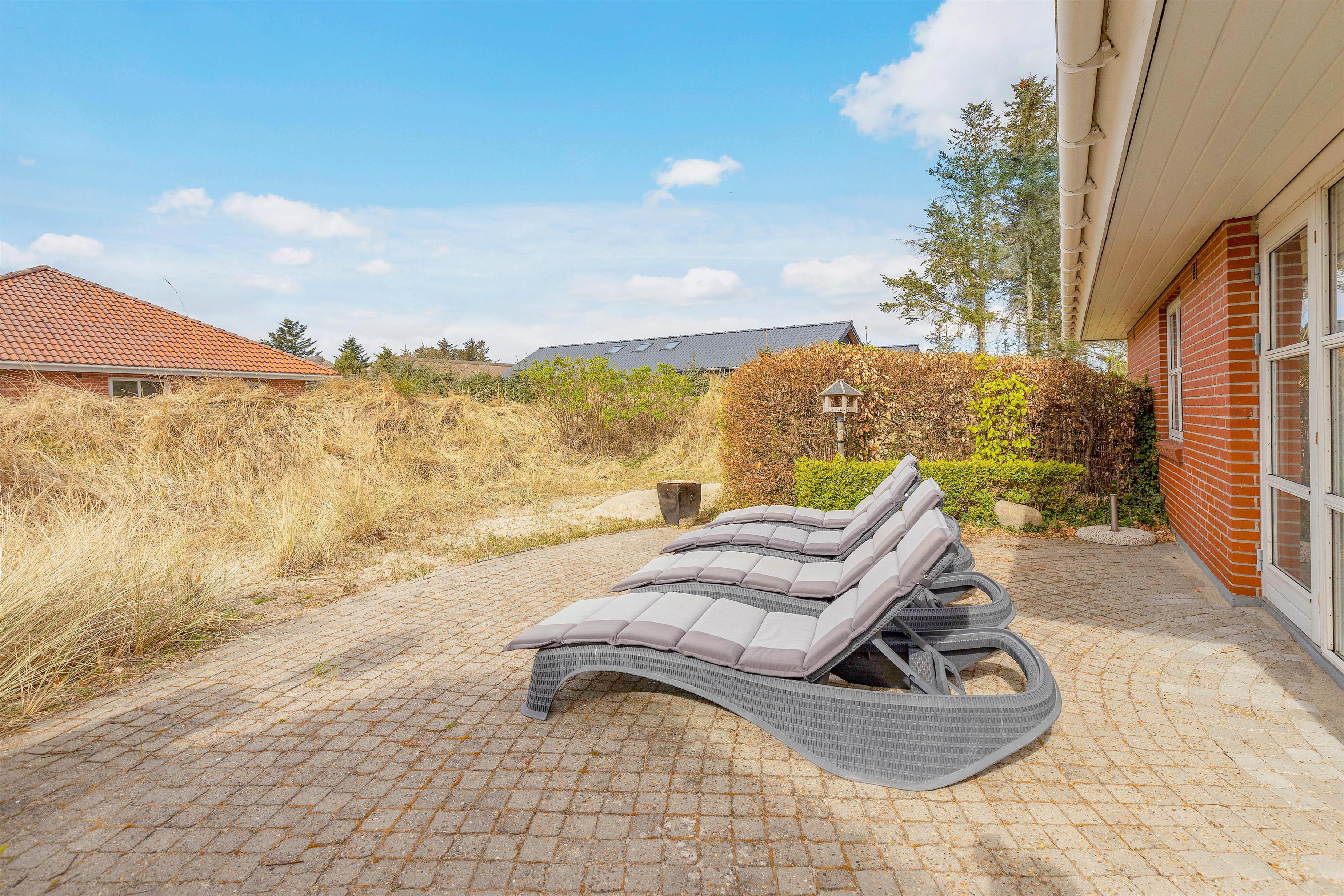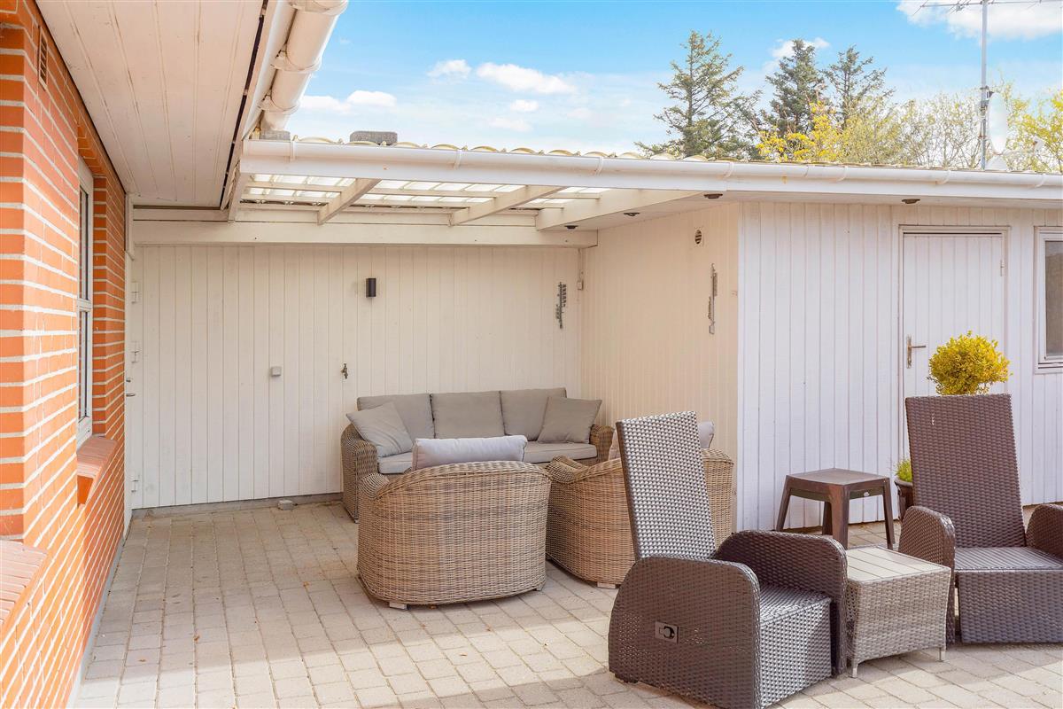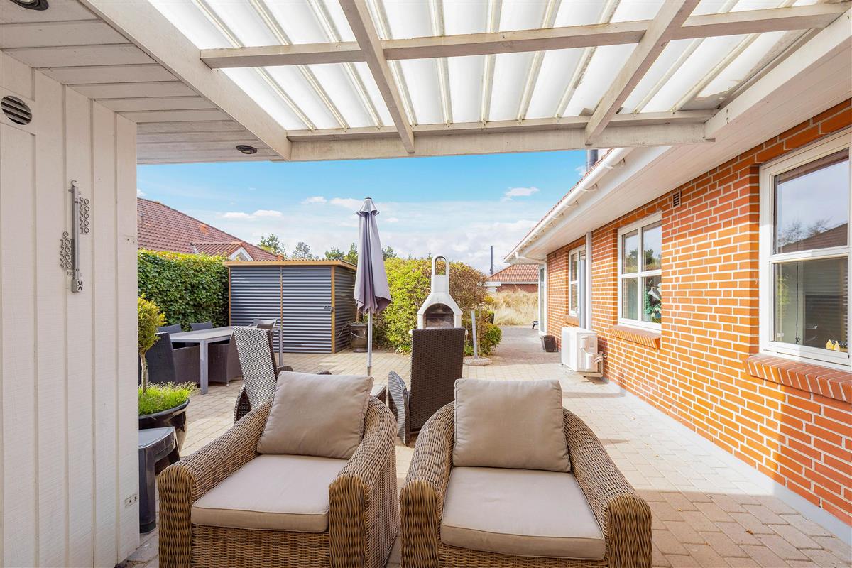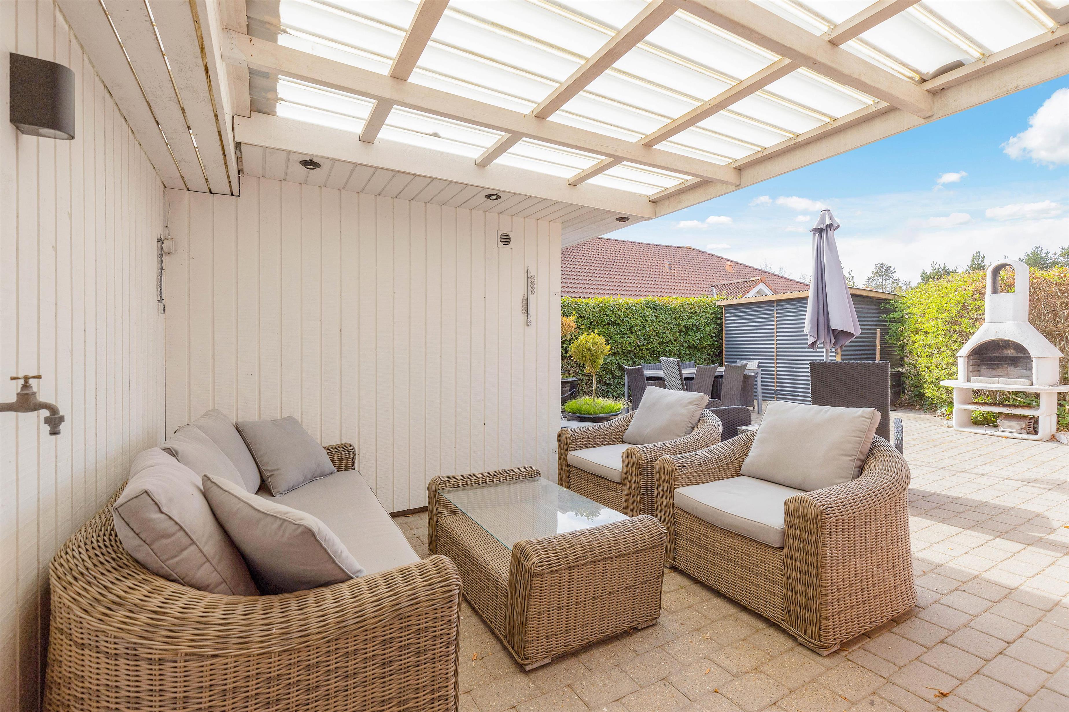 From the living area, you have access to the terrace, which feels like a cosy courtyard on one side. It features a covered section, allowing you to enjoy the fresh North Sea air even on rainy days. The surrounding plants and the warm walls of the house provide shelter from the wind.