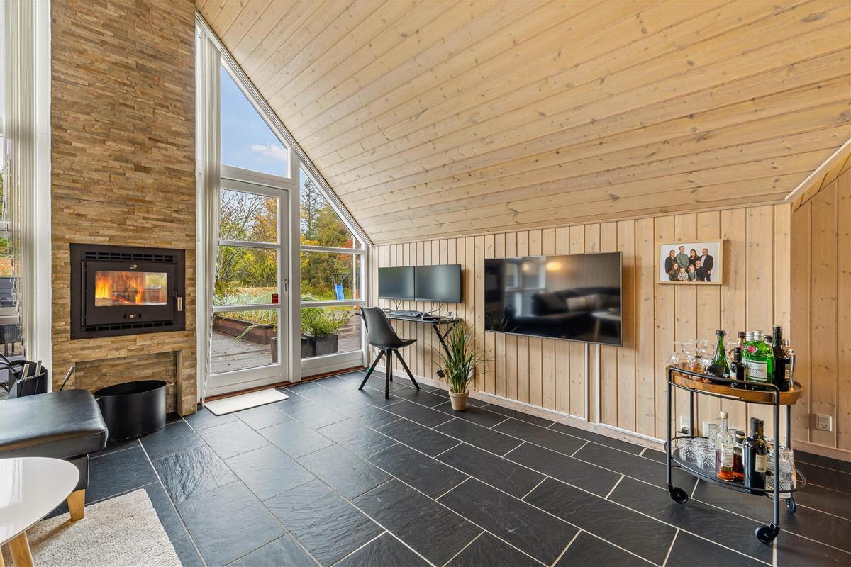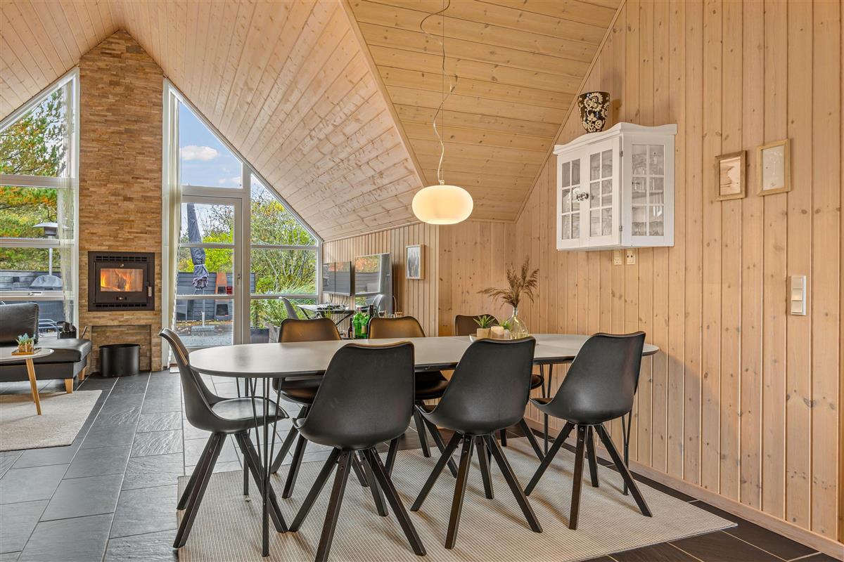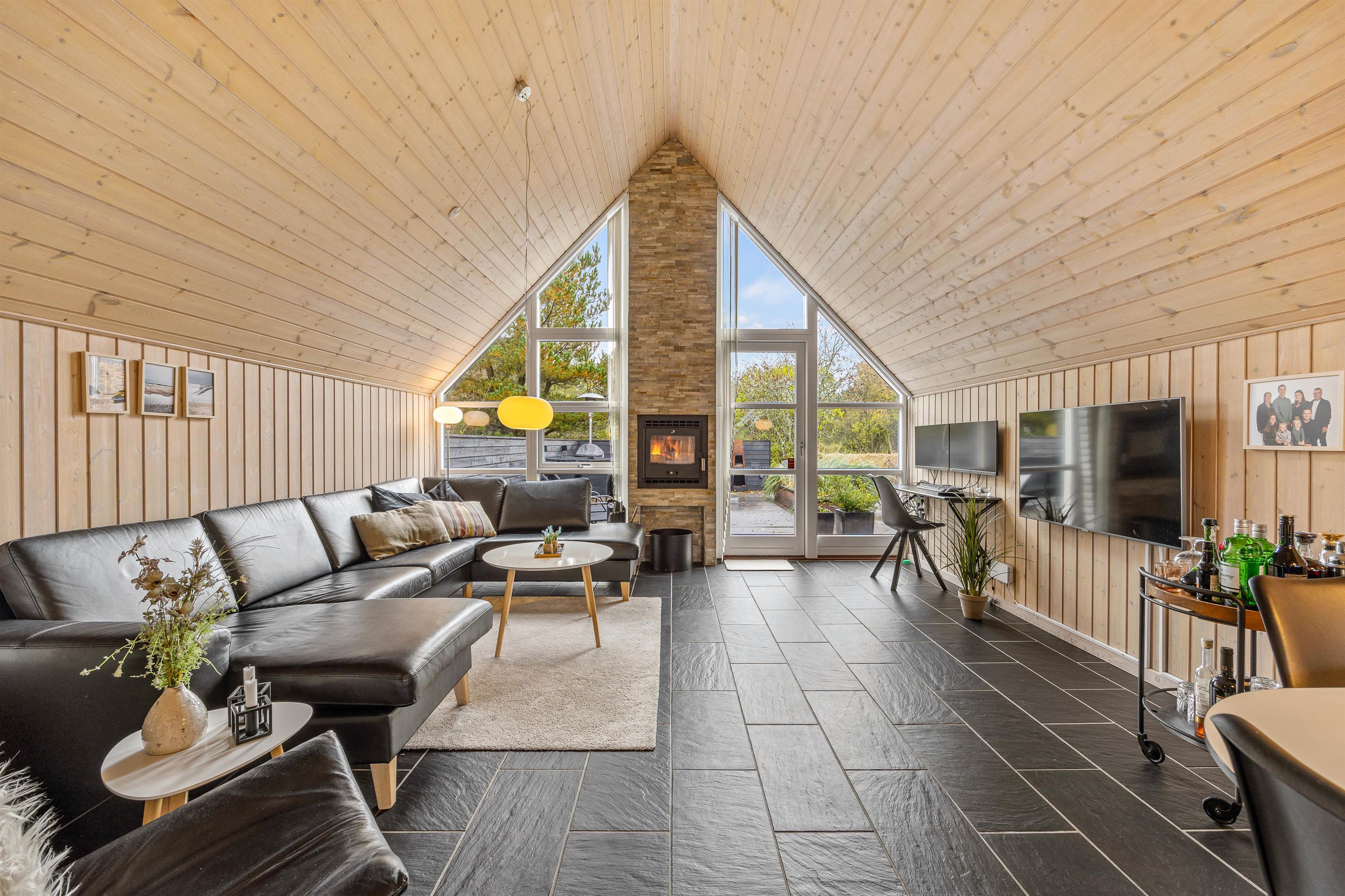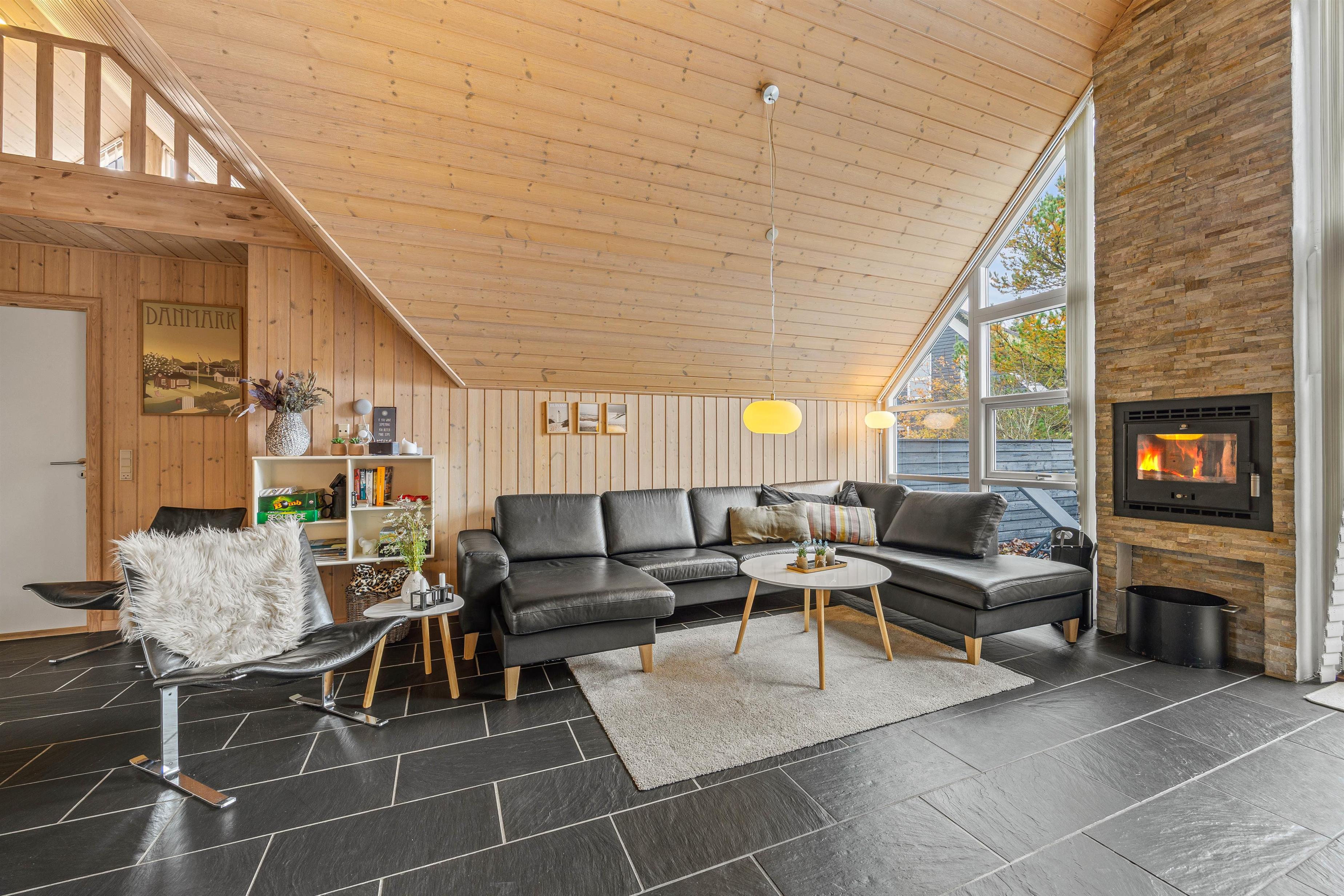 The beautiful dark-tiled floor in the living area features underfloor heating, ensuring a particularly pleasant indoor climate. The large corner sofa provides ample space for everyone to enjoy a cosy film evening. For the complete hygge experience, light up the wood-burning stove. For cost-effective and energy-efficient heating, make use of the heat pump.