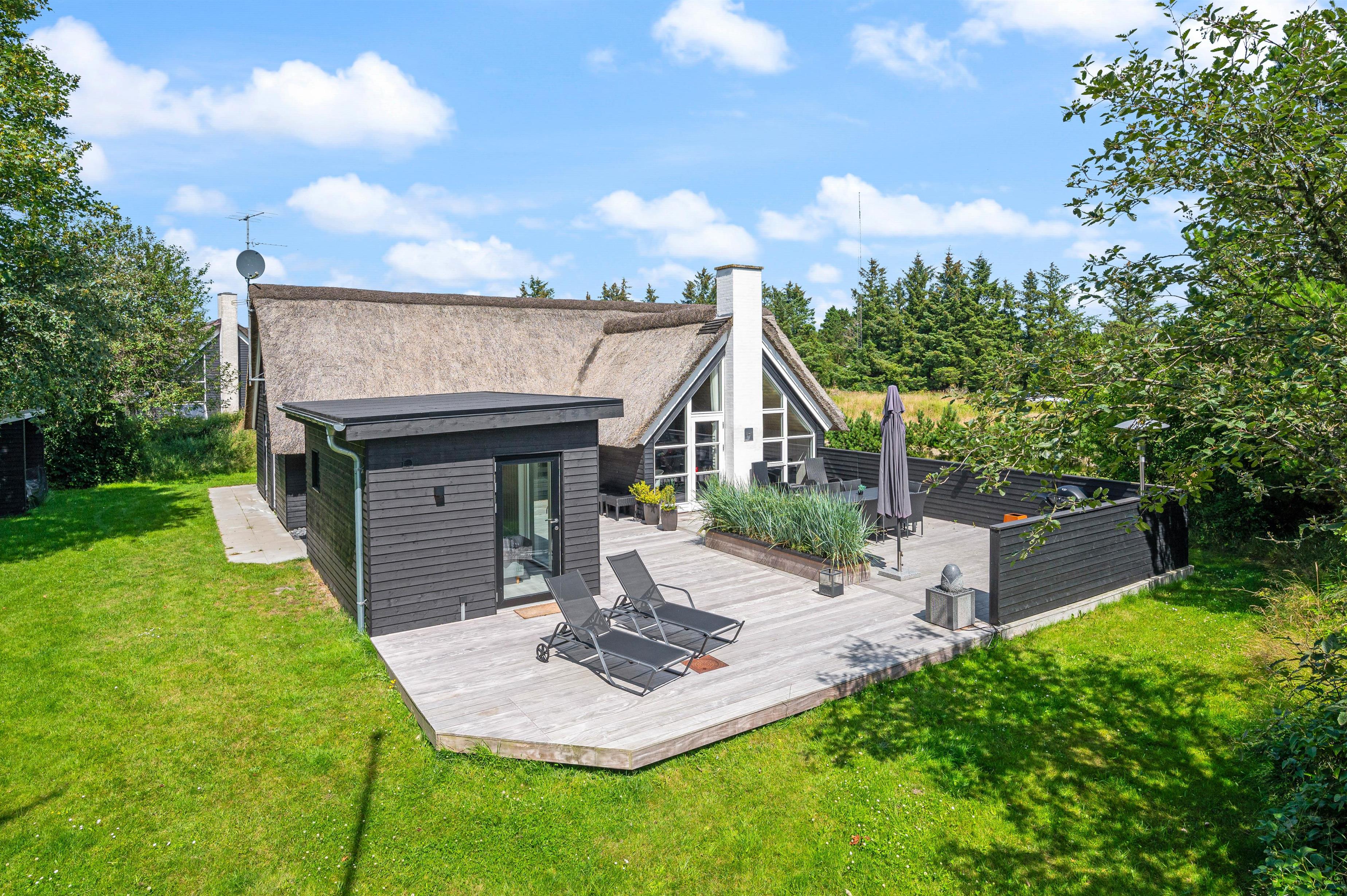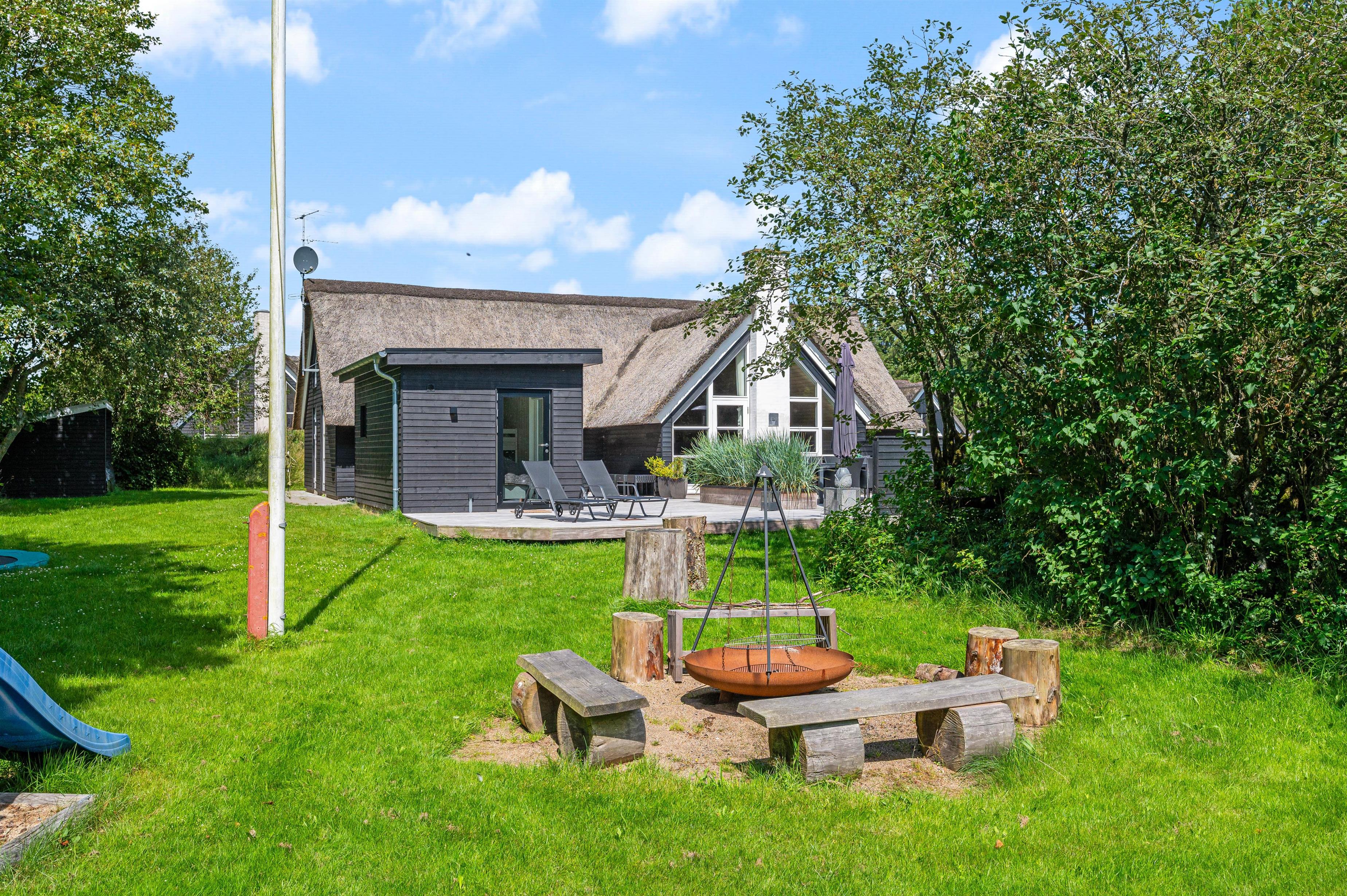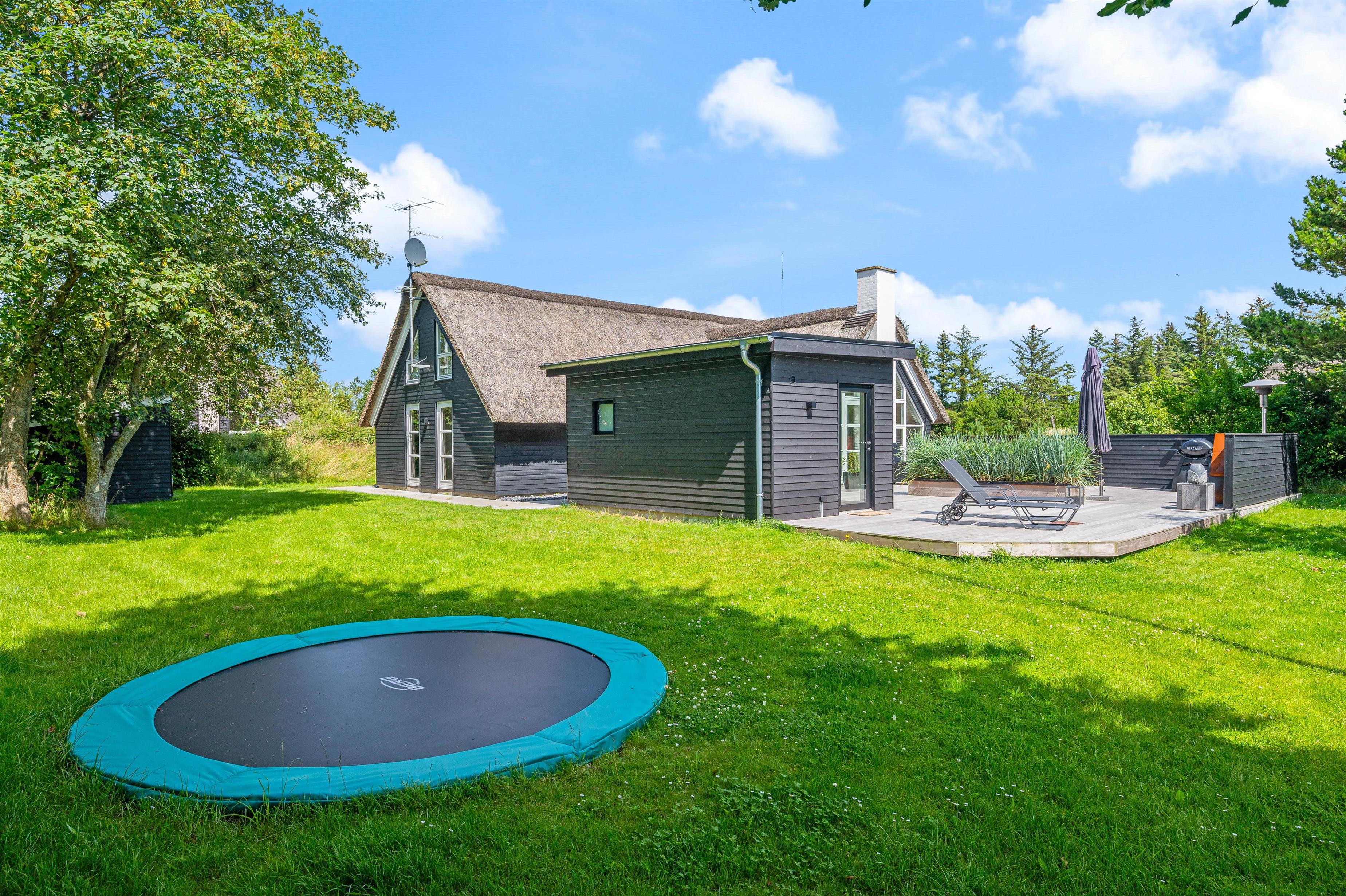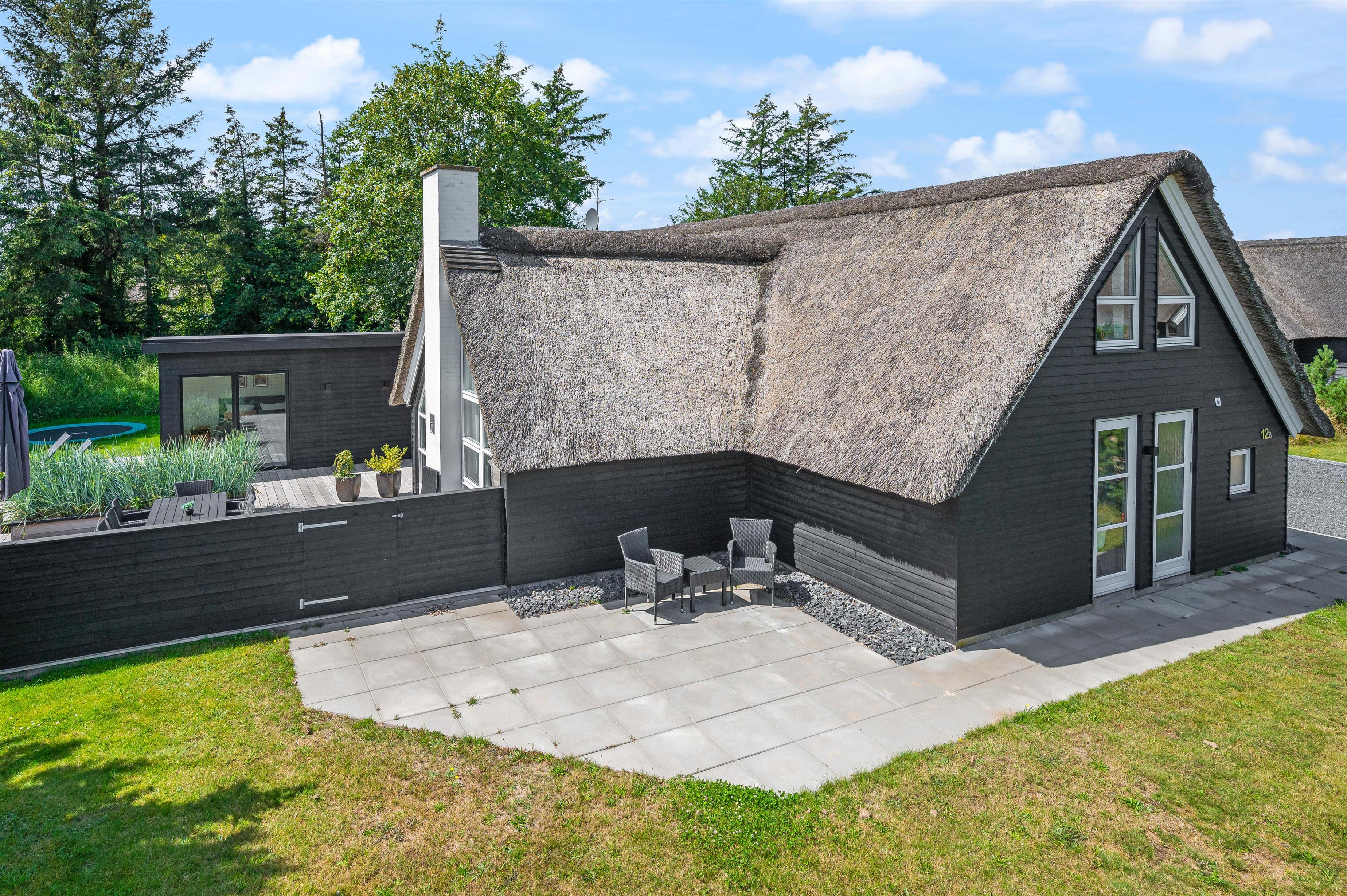 Located at Hestehaven 12B, this modern thatched holiday home accommodates up to 8 people. You'll feel instantly at home in this distinctive atmosphere with high, converted roof spaces and stylish furnishings. Both young and older guests will find plenty to enjoy, with swings and a trampoline in the garden, plus a sauna and whirlpool inside. The perfect holiday home for families with children.