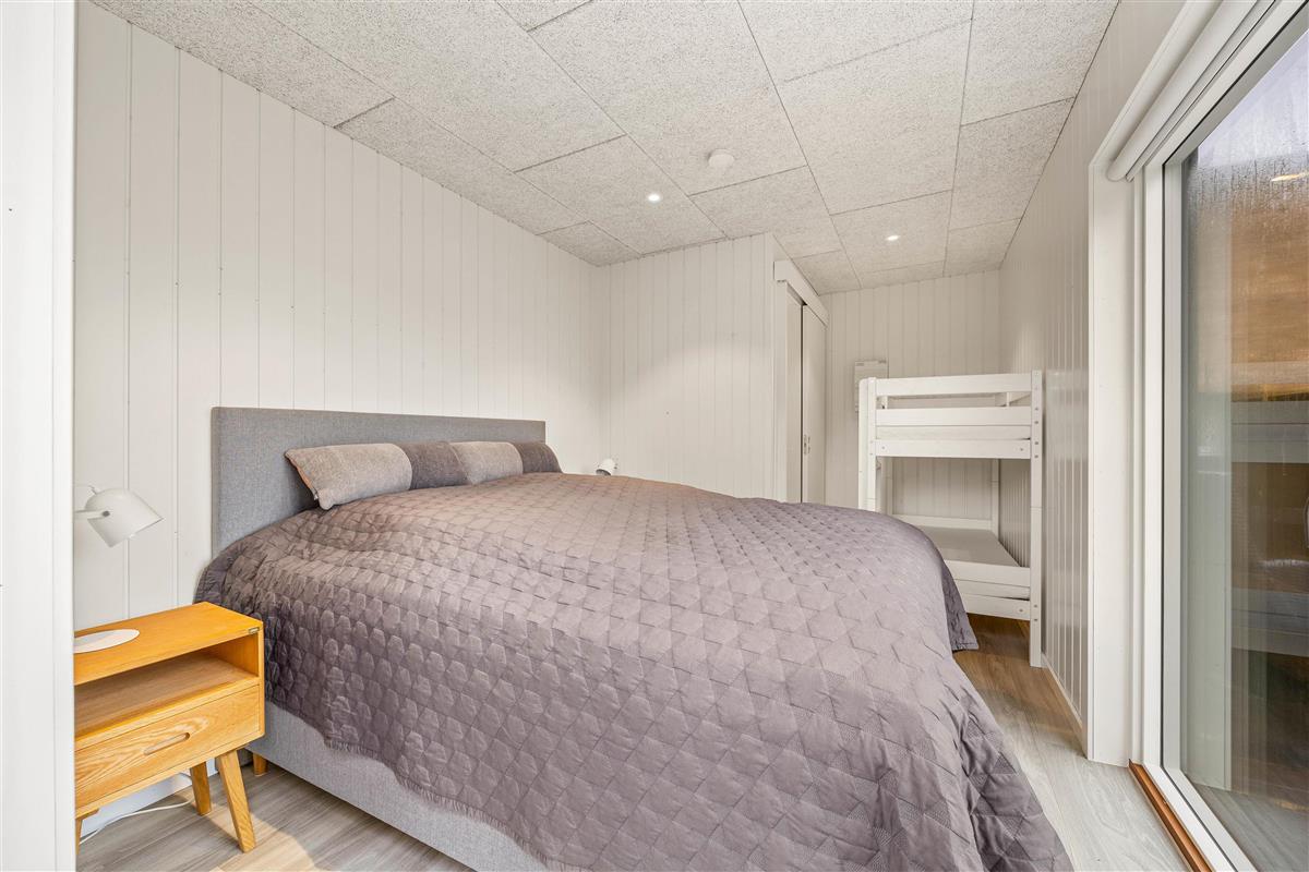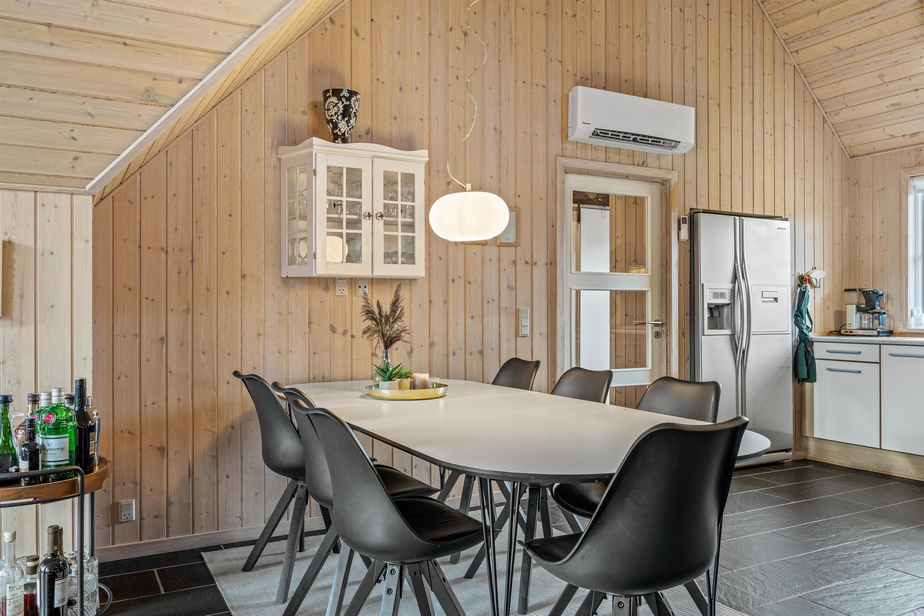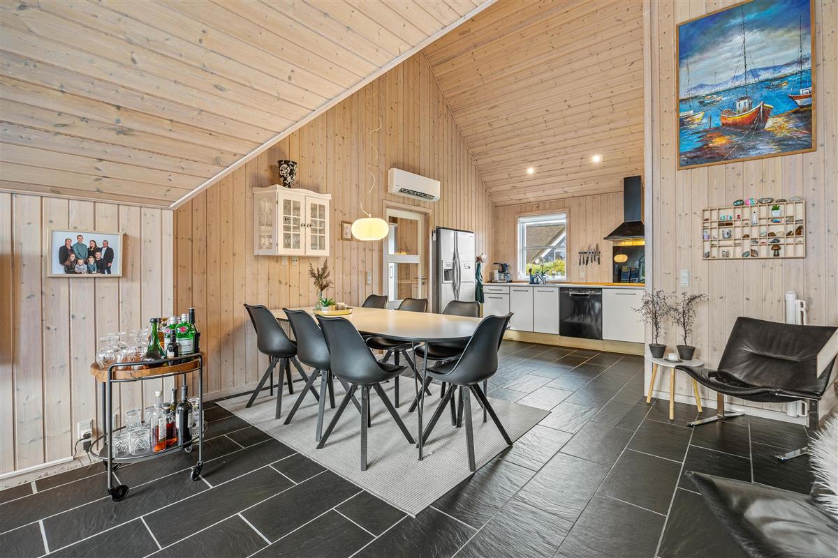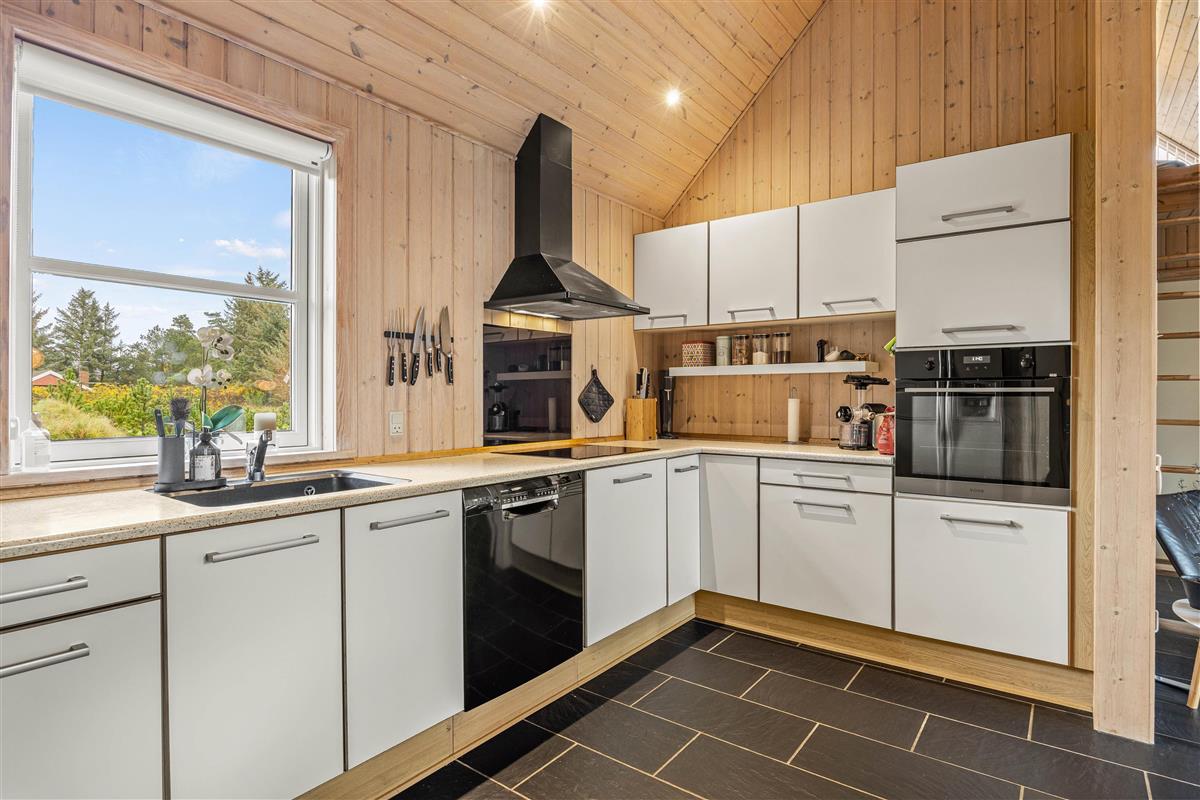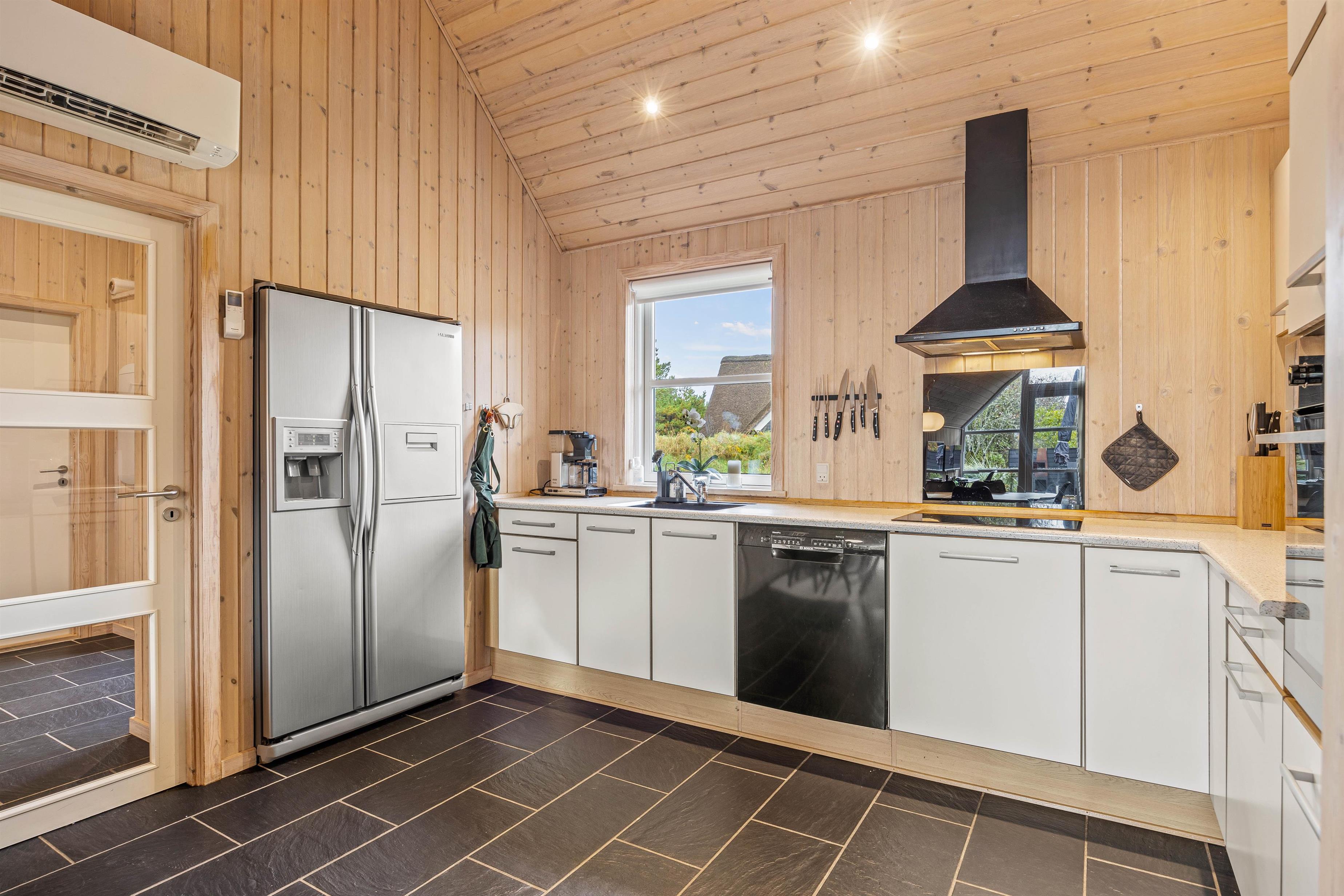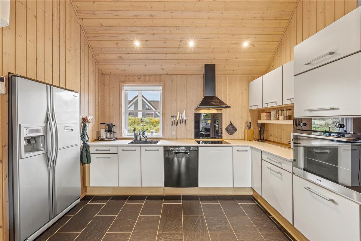 At Hestehaven 12B, you'll immediately feel in holiday mode as you enter this beautiful holiday home. The stylish décor flows seamlessly throughout all rooms. The open-plan living area, with dining table and kitchen, is bathed in natural light thanks to the high, converted roof spaces and floor-to-ceiling windows overlooking the garden. The modern kitchen, complete with built-in large fridge, is perfect for culinary adventures.