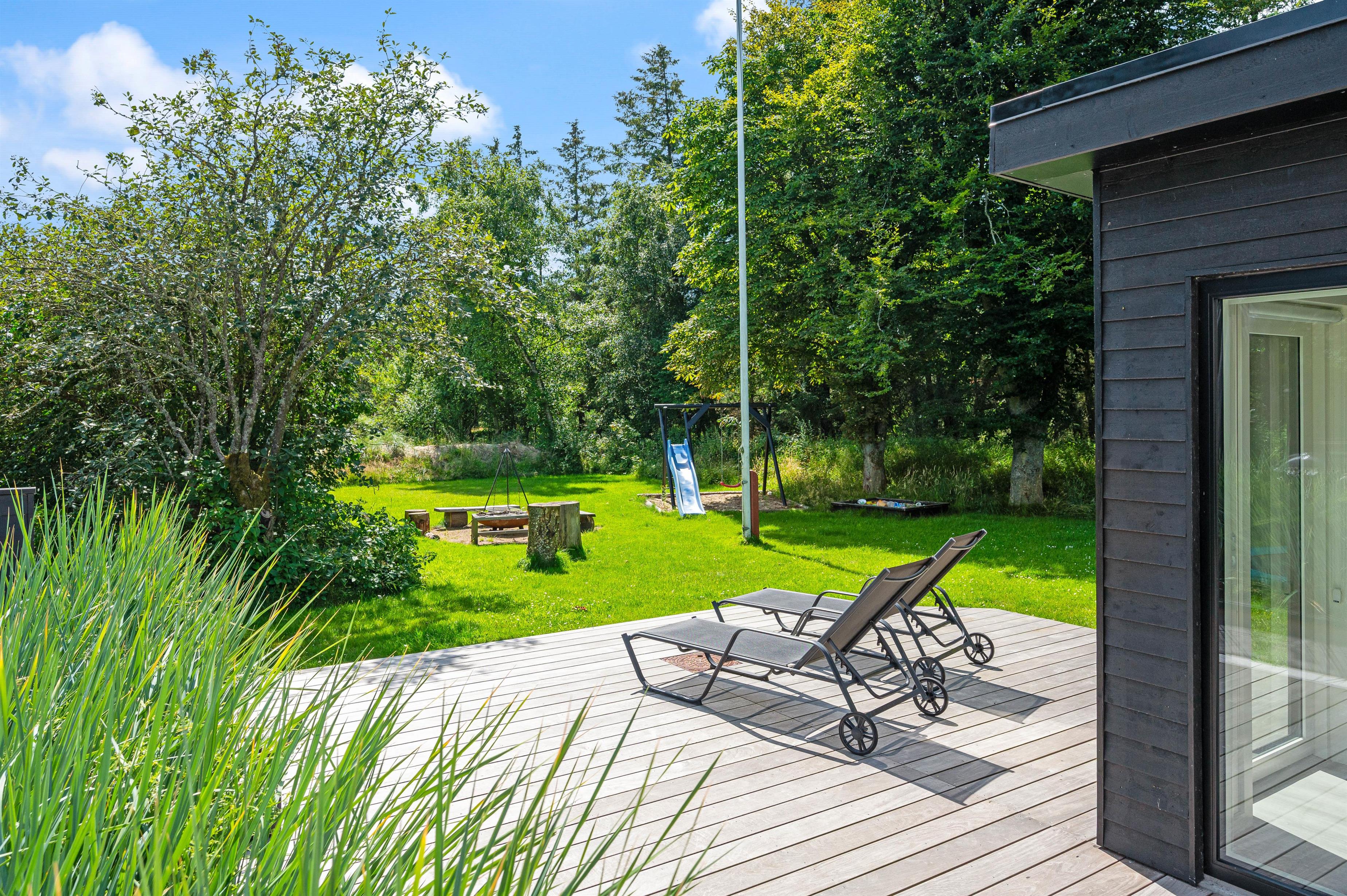 The outdoor area offers plenty for children to enjoy. A sunken trampoline, play tower with slide, swing and sandpit, plus a designated campfire area. The beautiful sheltered terrace offers various options to unwind in the lounge chairs or sun loungers and enjoy the peace and quiet.